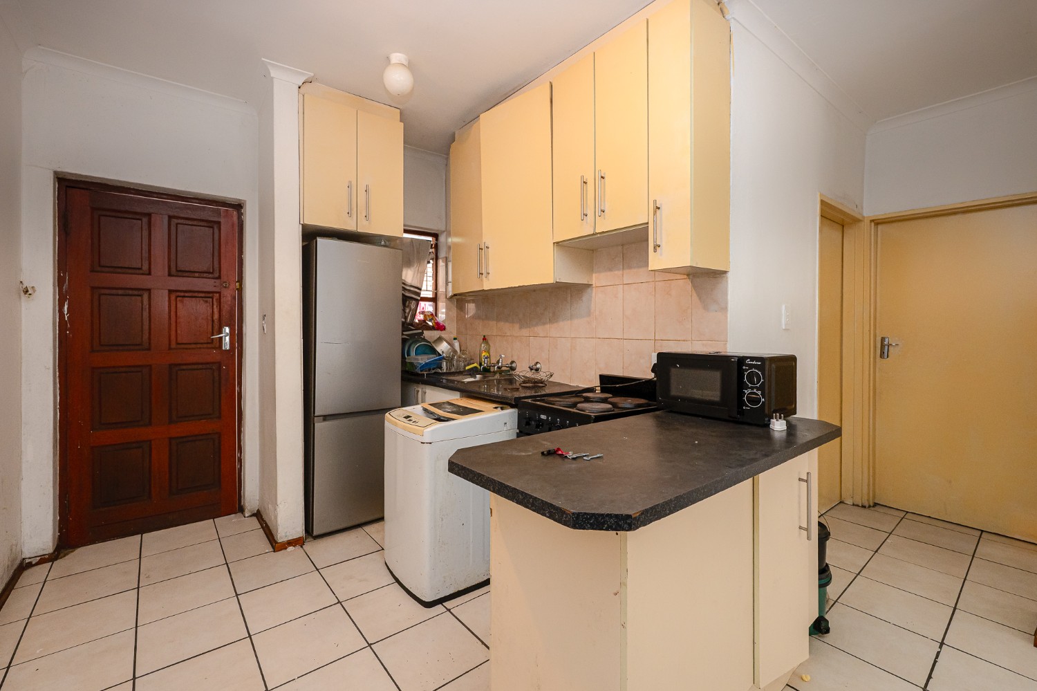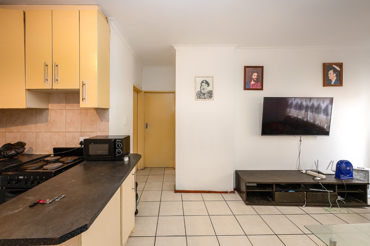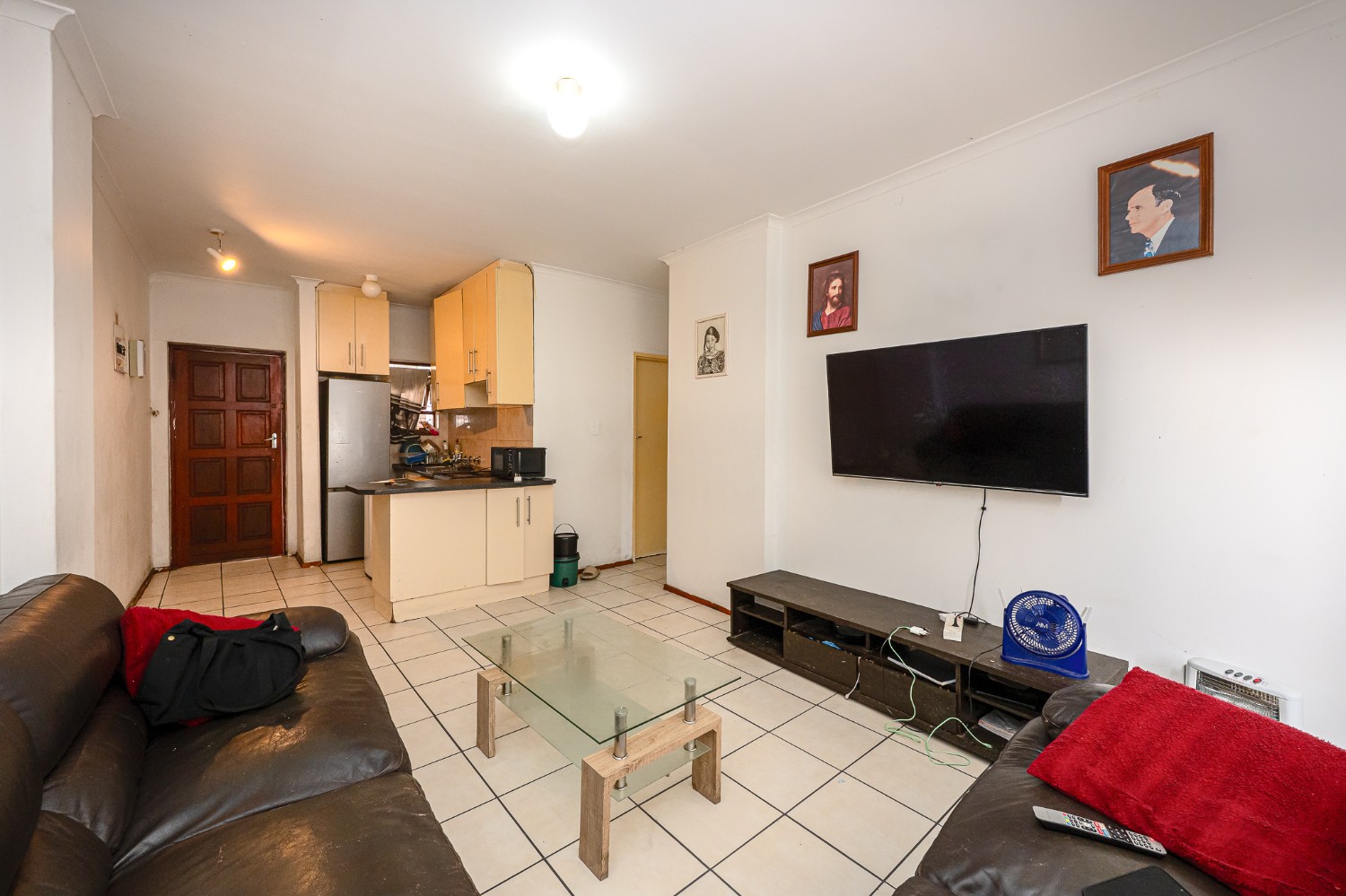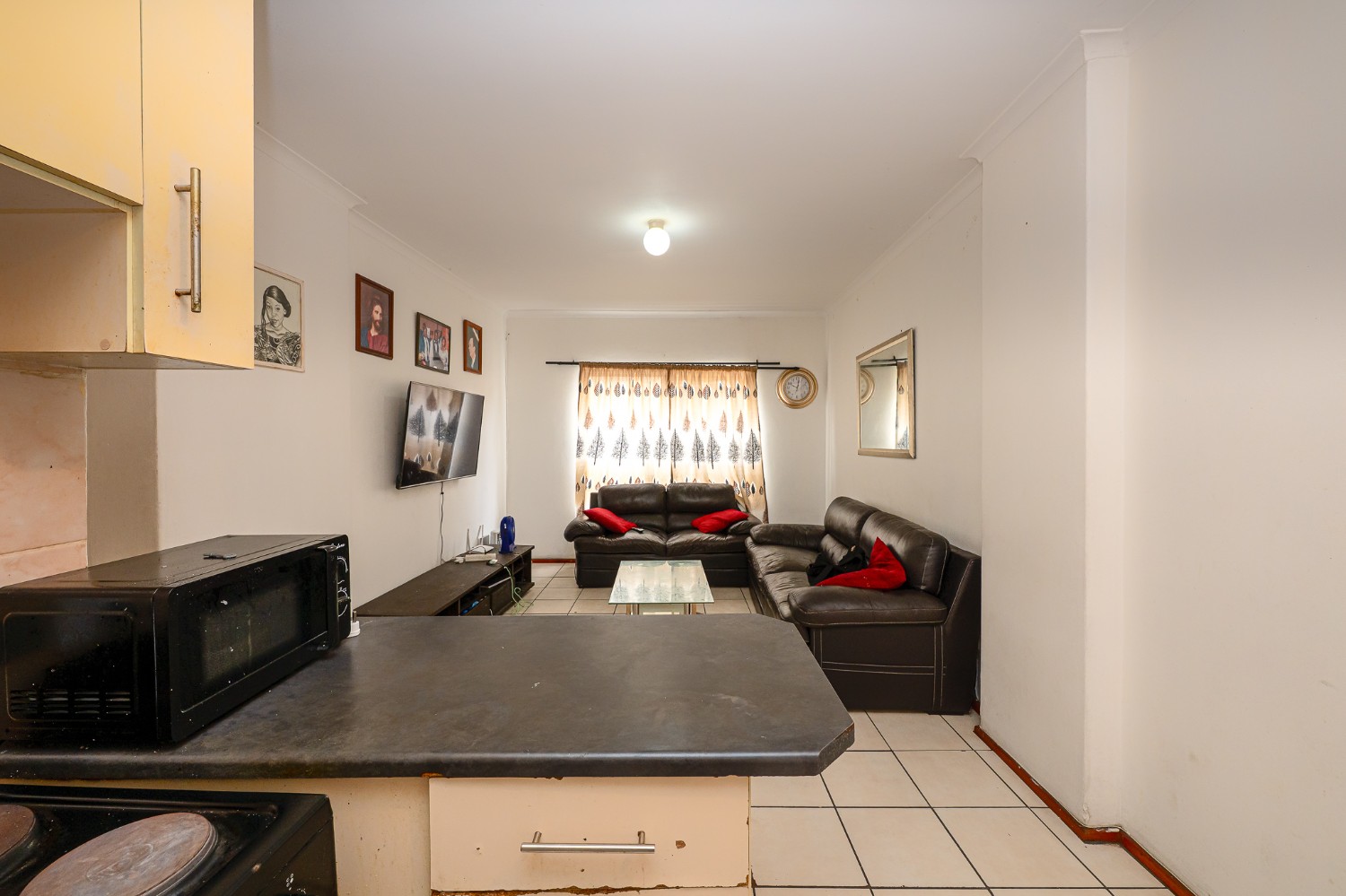 The apartment features a spacious lounge that flows seamlessly into the kitchen, creating a welcoming open-plan living space perfect for relaxing and entertaining. The kitchen offers ample cupboard space, a plumbing point, and space for a fridge.
