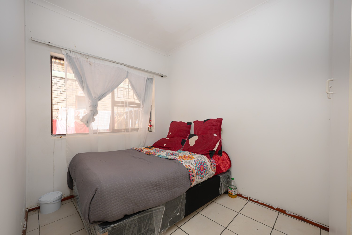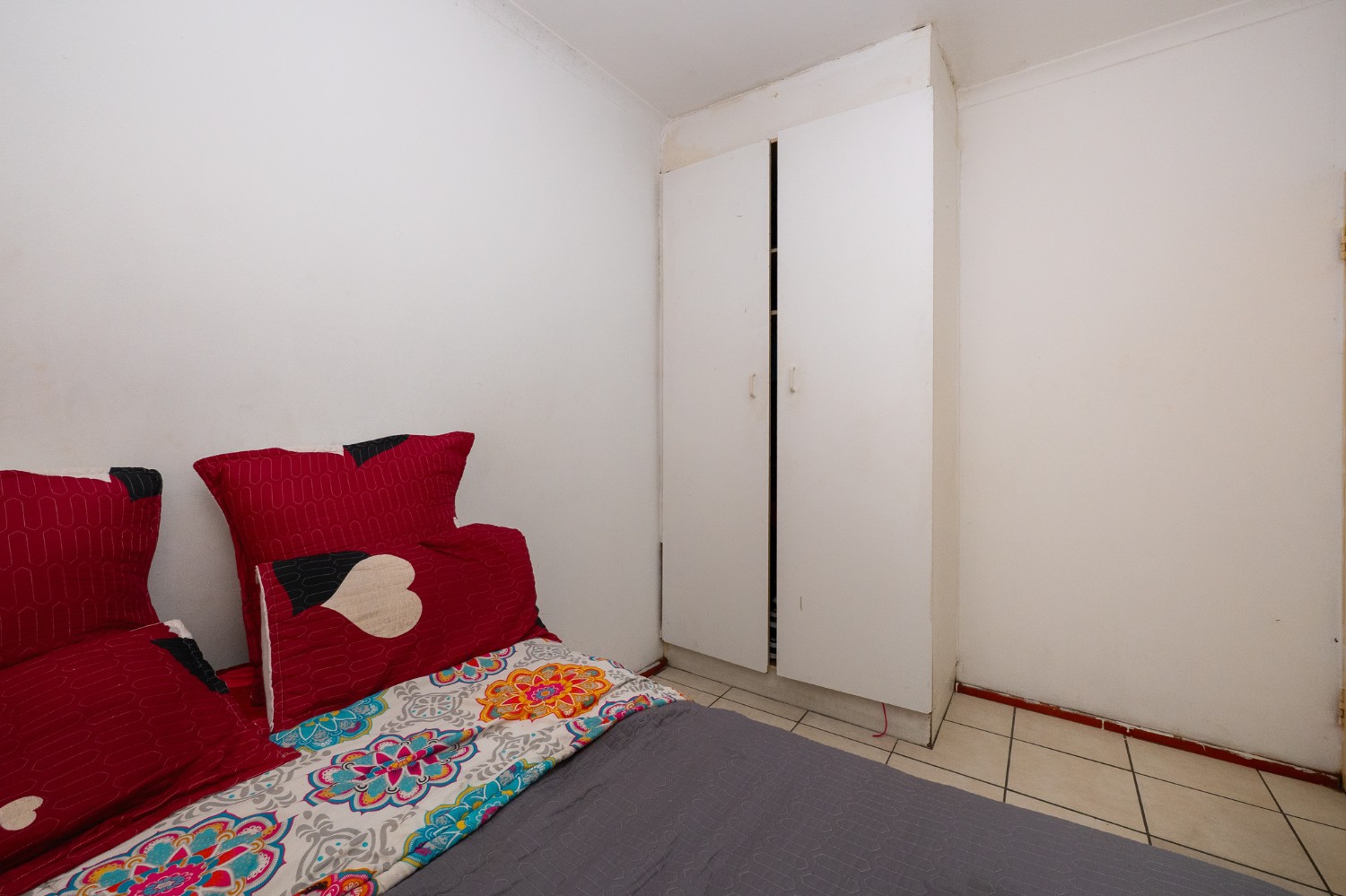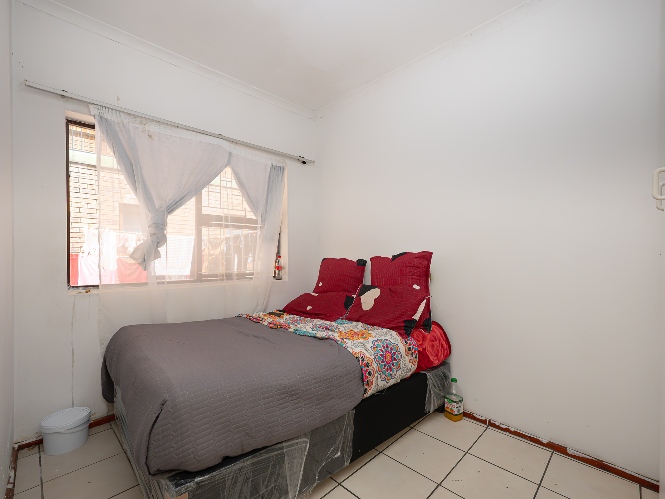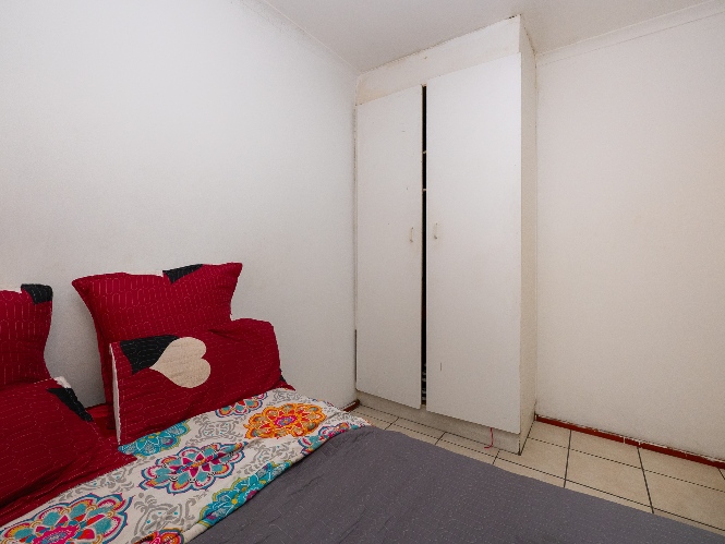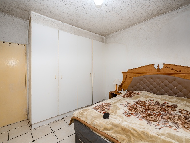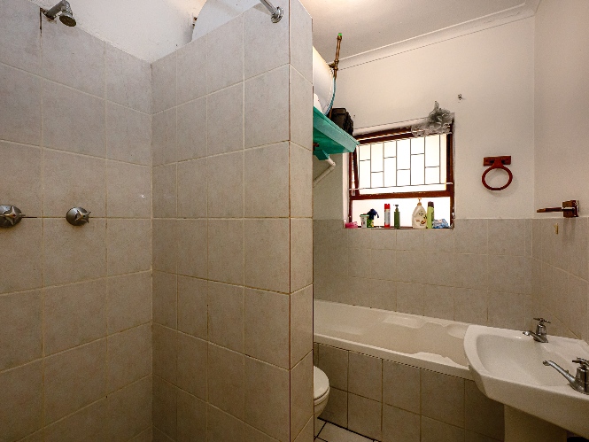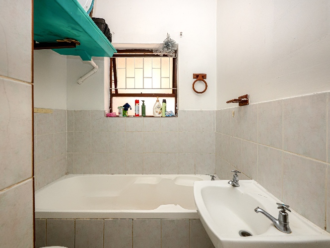 There are two well-sized bedrooms, both complete with built-in cupboards and tiled flooring. The bathroom features a shower (not in working condition), a bathtub, a basin, and a toilet.