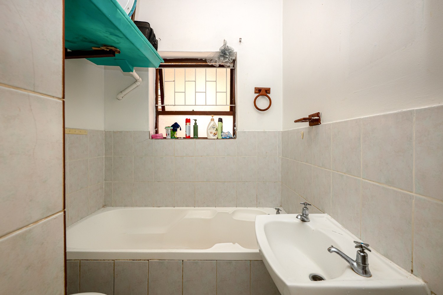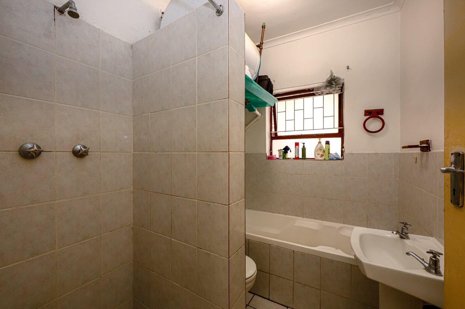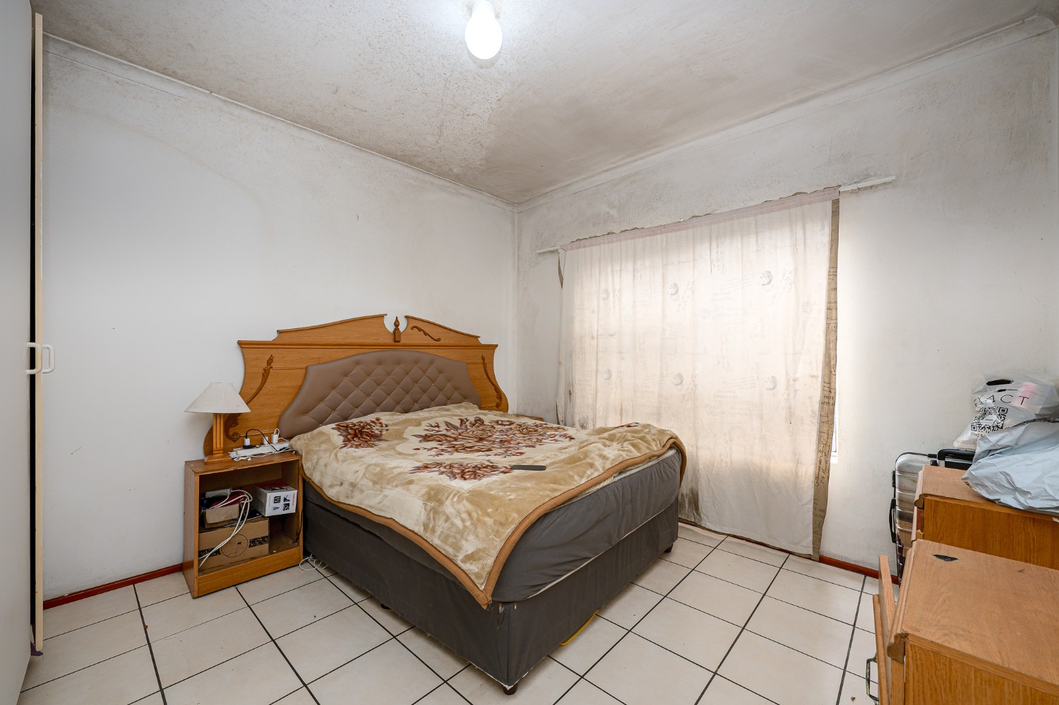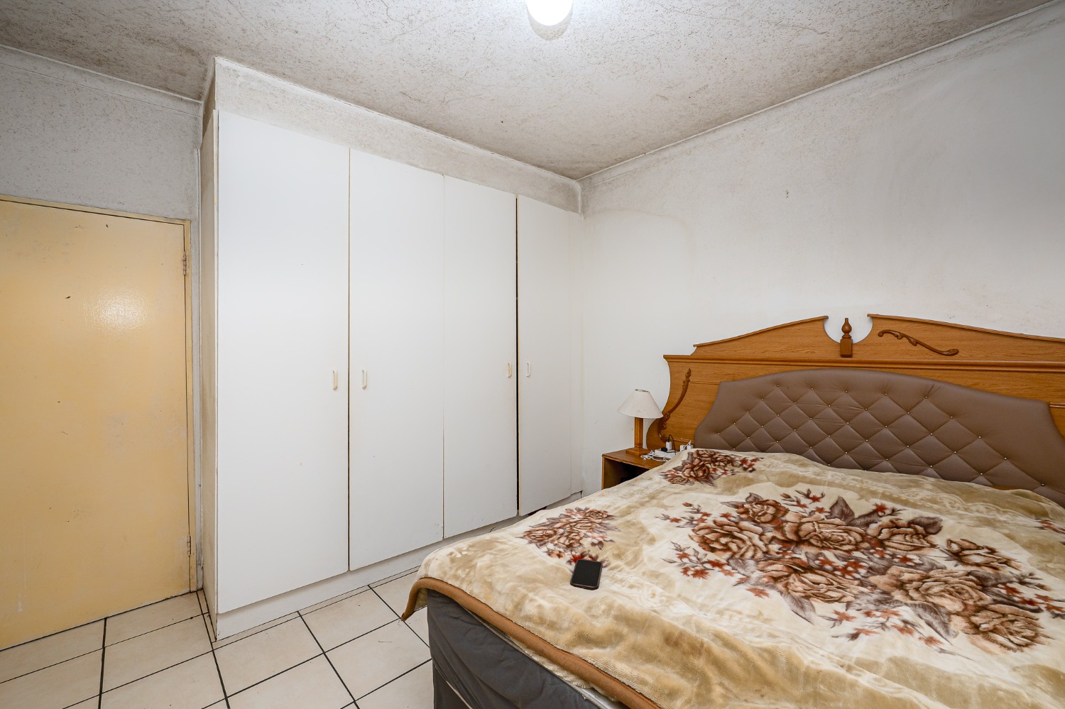 There are two well-sized bedrooms, both complete with built-in cupboards and tiled flooring. The bathroom features a shower (not in working condition), a bathtub, a basin, and a toilet.