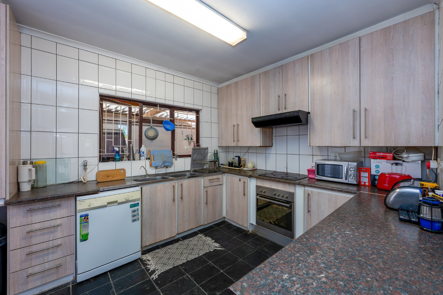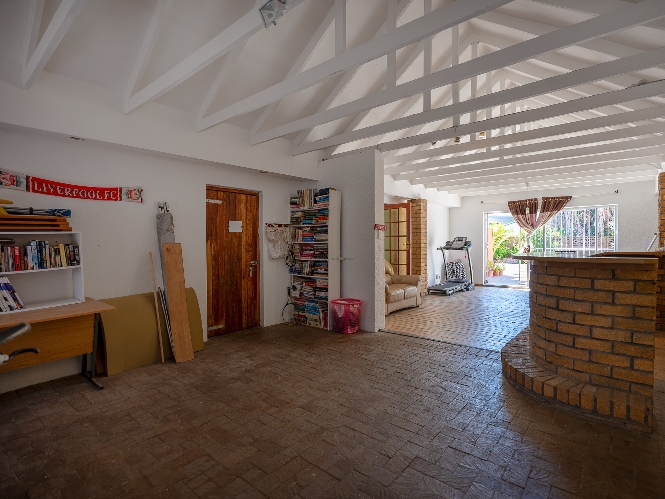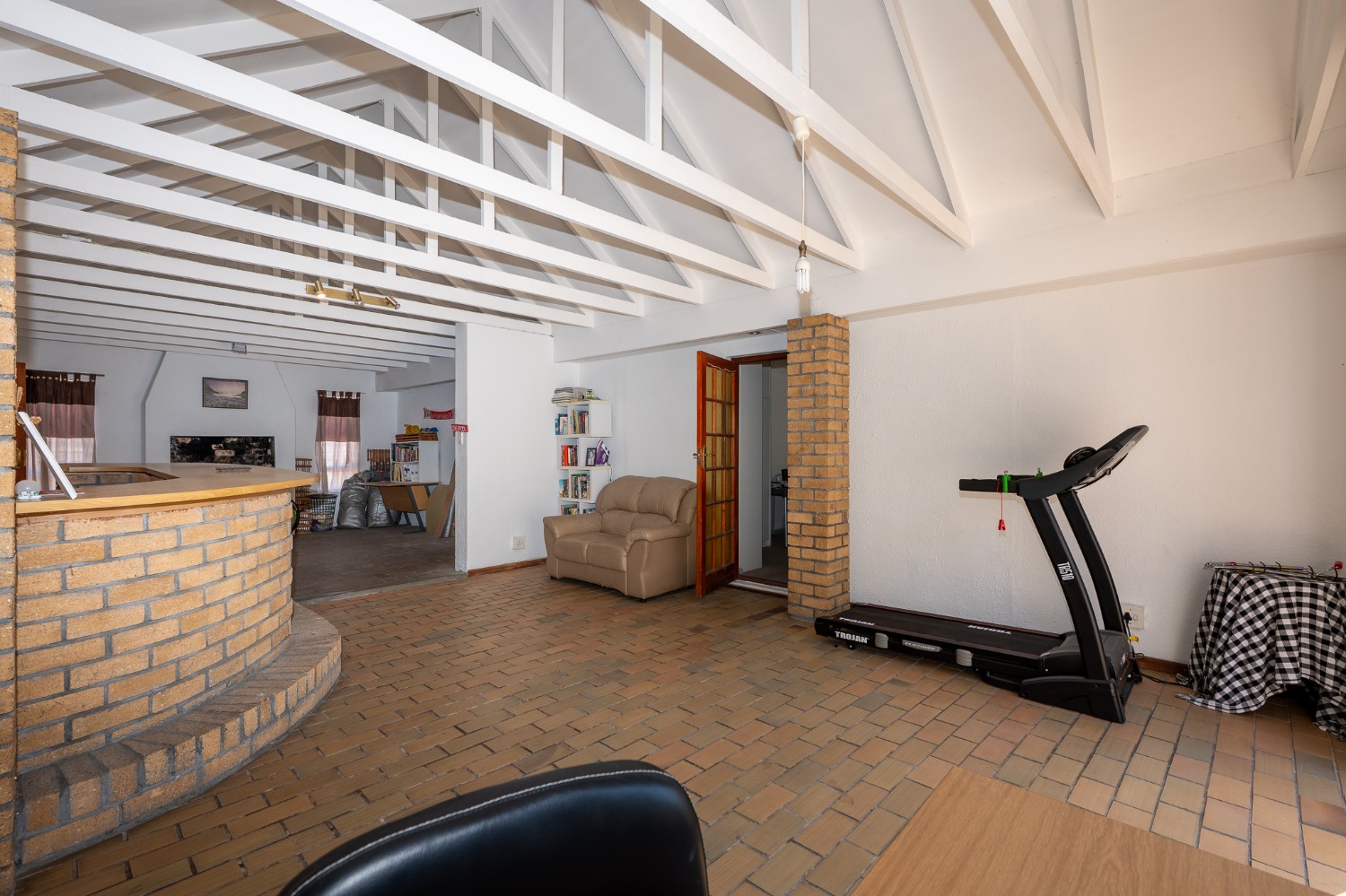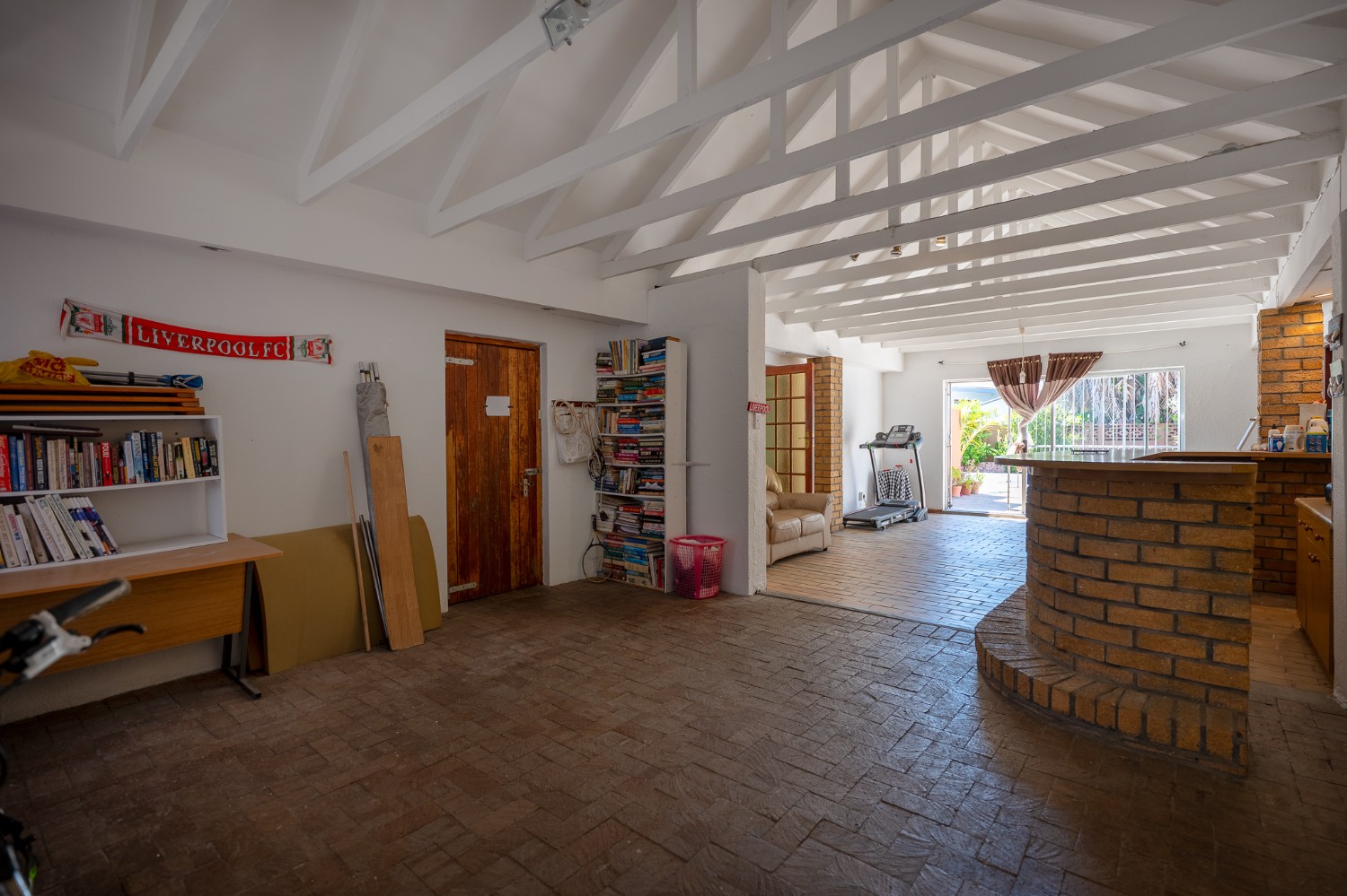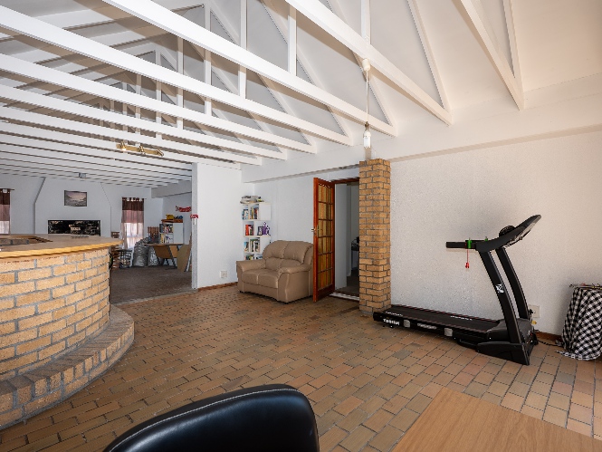 The entertainment area features beautiful, high-exposed-beam ceilings, a built-in braai and a built-in bar. Moving outside, there is a sparkling swimming pool and a beautifully maintained garden, creating the perfect setting for outdoor gatherings. Parking is never an issue with a double automated garage and ample space for additional vehicles behind a secure gate.