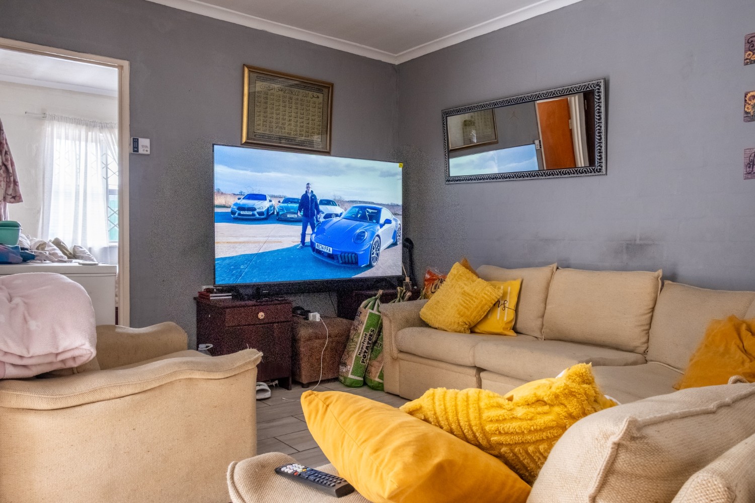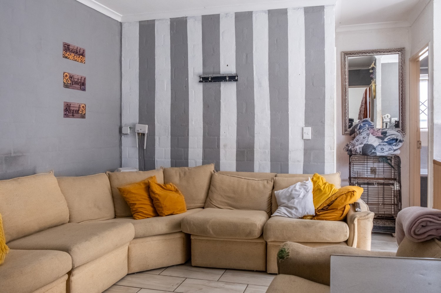 The home features a cosy lounge, ideal for relaxing with family and entertaining guests. The kitchen is fitted with built-in cupboards, an under-counter oven and hob, and space for a fridge.