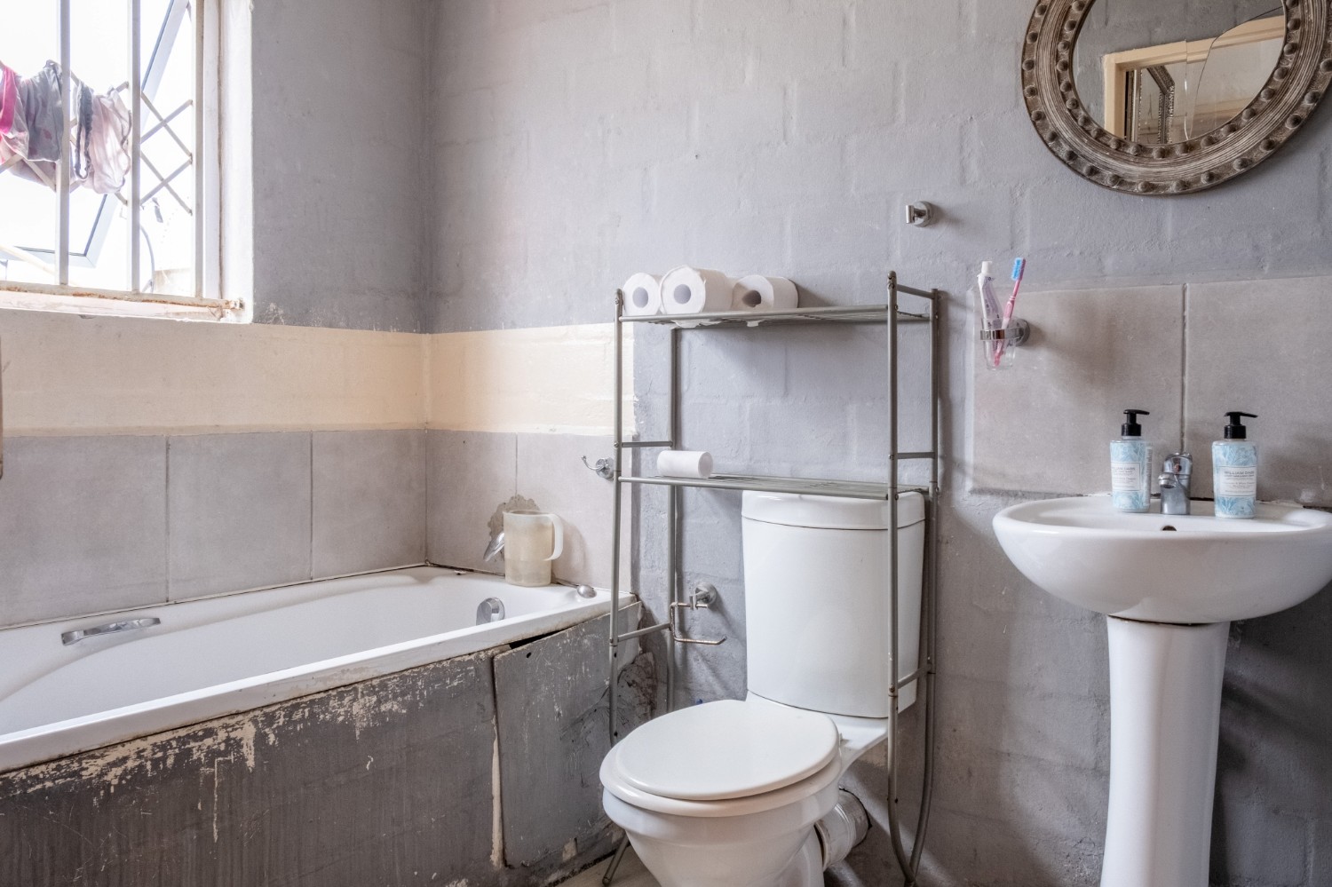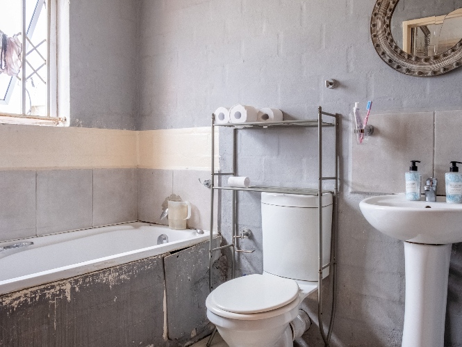 Both bedrooms are well-sized and filled with natural light, creating a warm and inviting feel. The bathroom is equipped with a bathtub, a basin, and a toilet.
