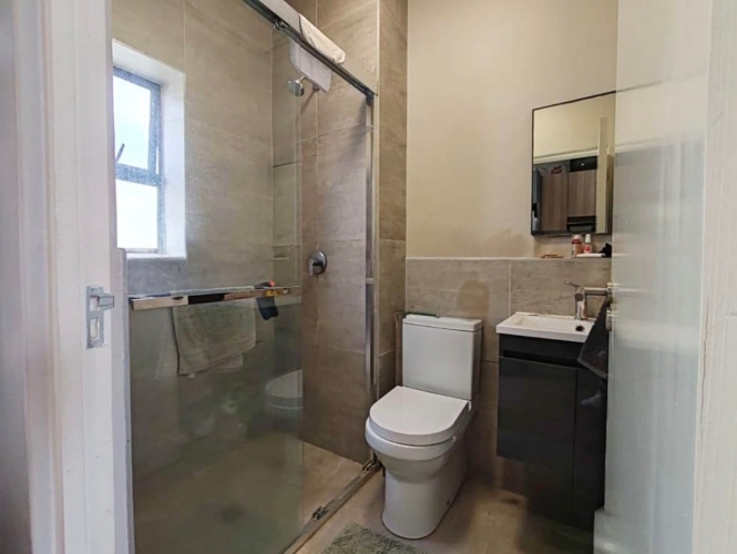 The kitchen is fitted with ample cupboard space, a built-in stove, and one plumbing point for a washing machine, offering both functionality and modern convenience. The bathroom is modern and stylish, complete with a spacious shower, basin, and toilet.