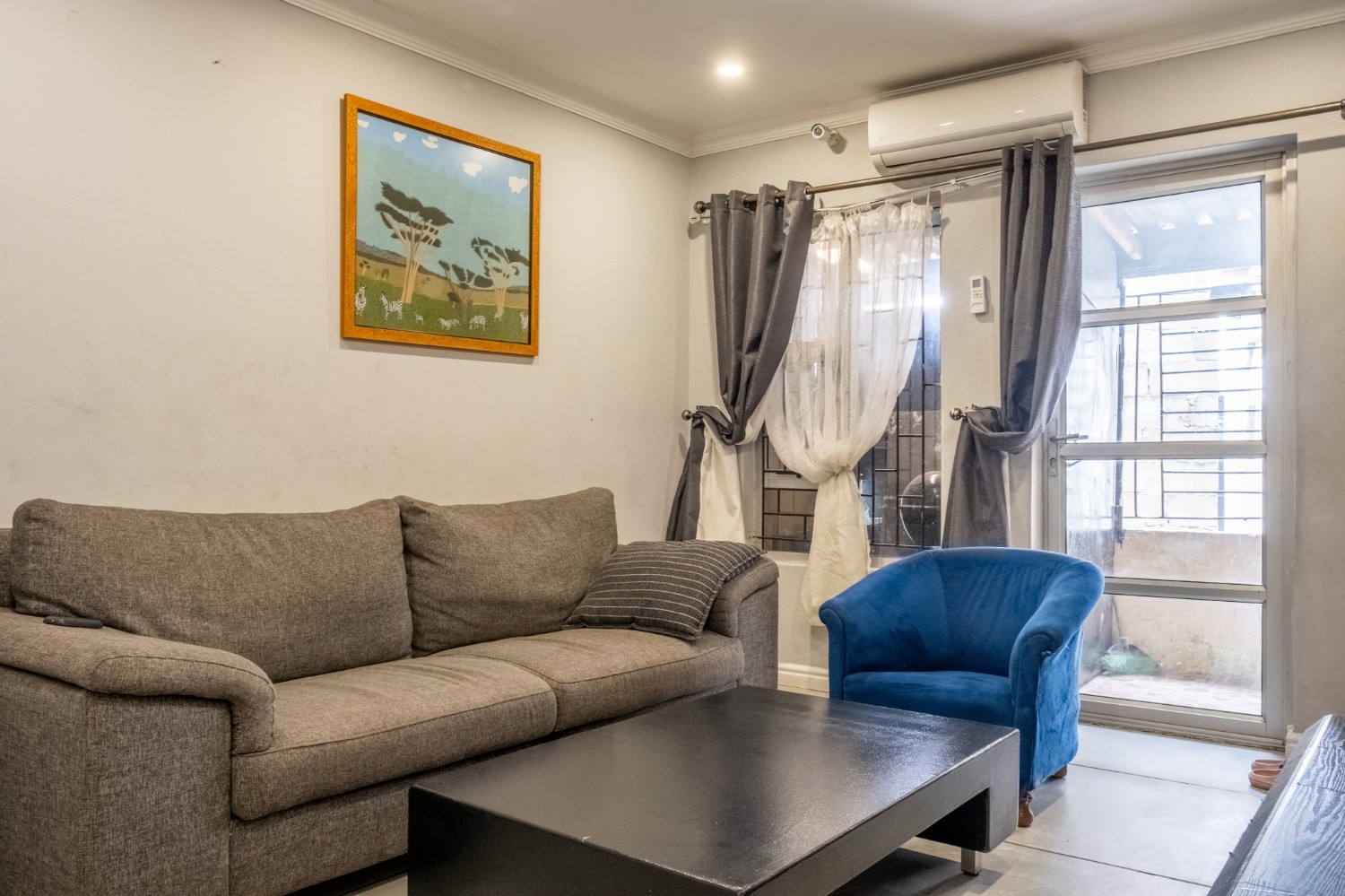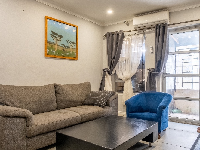 The welcoming lounge includes an air-conditioner, creating a comfortable space to unwind on warm days. The kitchen is practical and neatly finished, providing ample cupboard space, a fitted stove and oven, and space for a fridge.