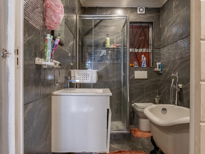 The property offers two well-sized bedrooms, both fitted with air-conditioning units. A modern bathroom adds a stylish touch, complete with a shower, bathtub, basin, and toilet.