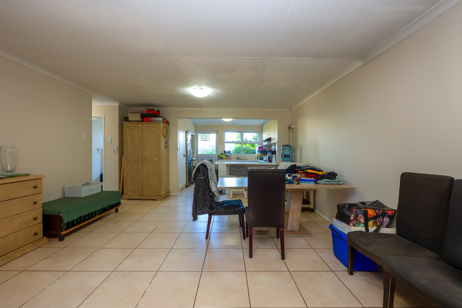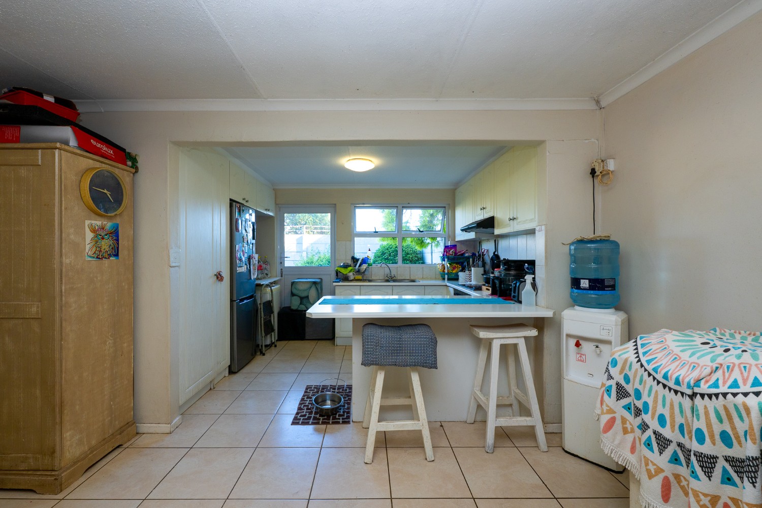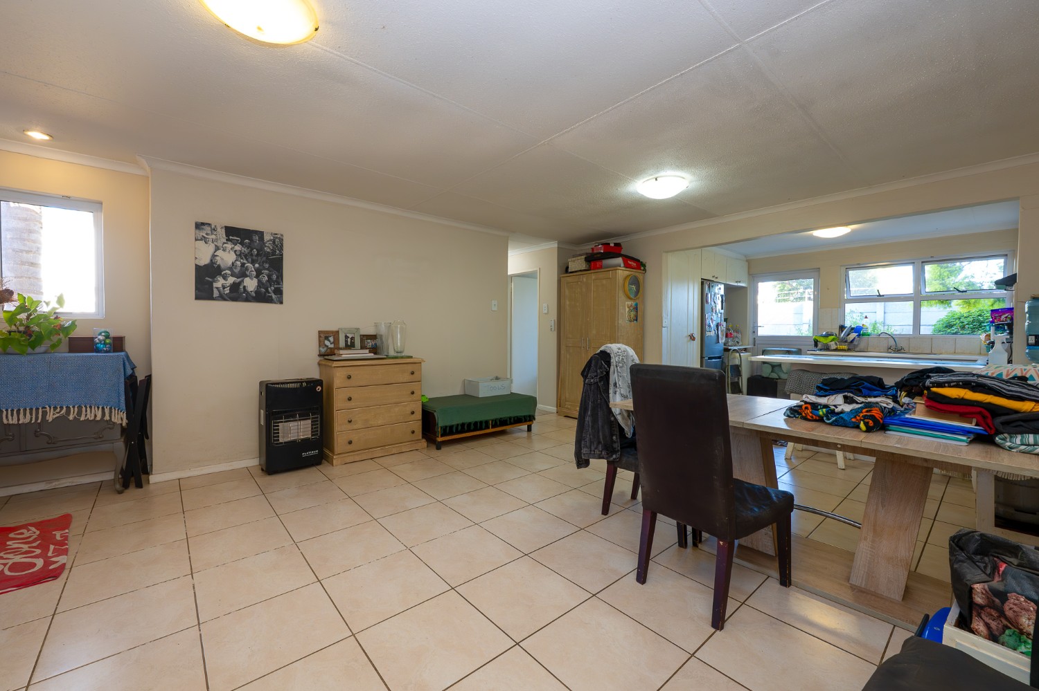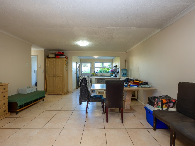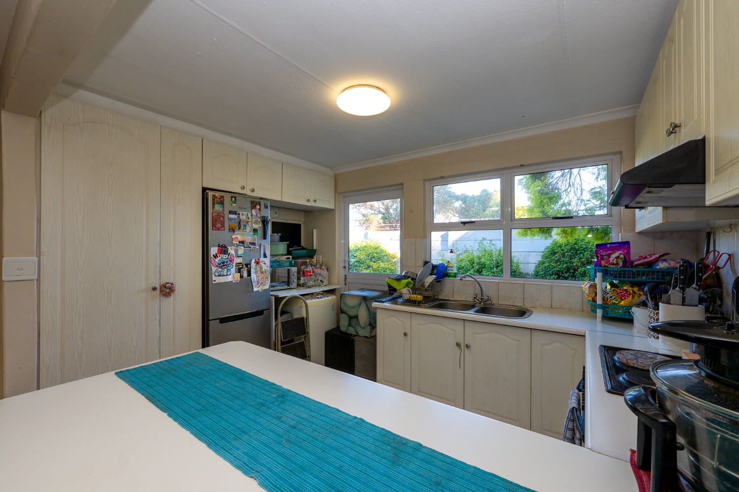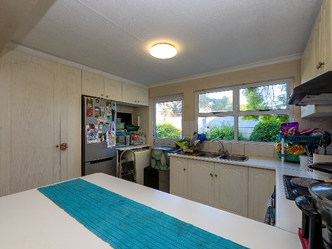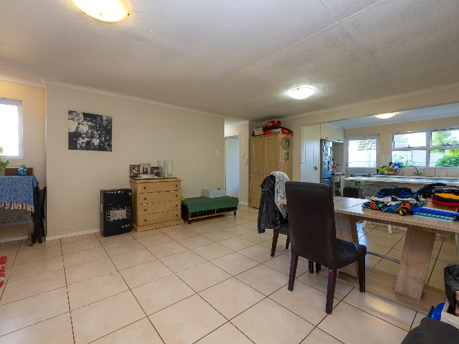The home features a welcoming lounge with beautiful wooden floors and a cosy fireplace, creating a warm and inviting atmosphere. The dining room flows seamlessly from the lounge, providing a comfortable space for family meals and entertaining guests. The kitchen is practical and well-positioned, offering built-in cupboards, an under-counter oven and hob, a double sink and space for a fridge.