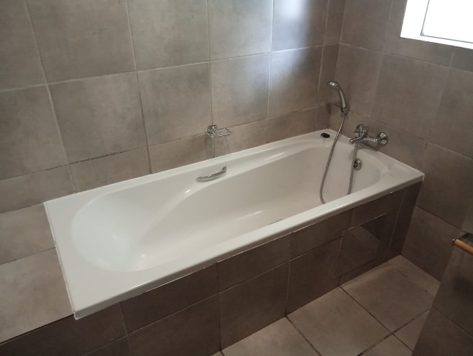 The apartment features two well-sized bedrooms, each fitted with built-in cupboards to maximise storage and comfort. The modern bathroom includes a bathtub with a showerhead, a basin, and a toilet, designed for both practicality and style.