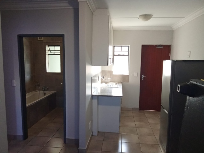 The inviting lounge provides a warm and welcoming space to relax and entertain guests, seamlessly connecting to the rest of the apartment. The charming kitchen offers cupboard space, a sink, tiled flooring, and space for a fridge.