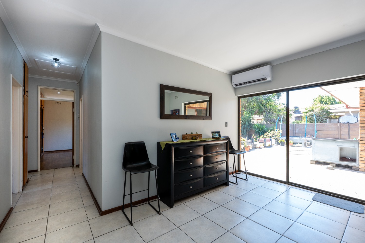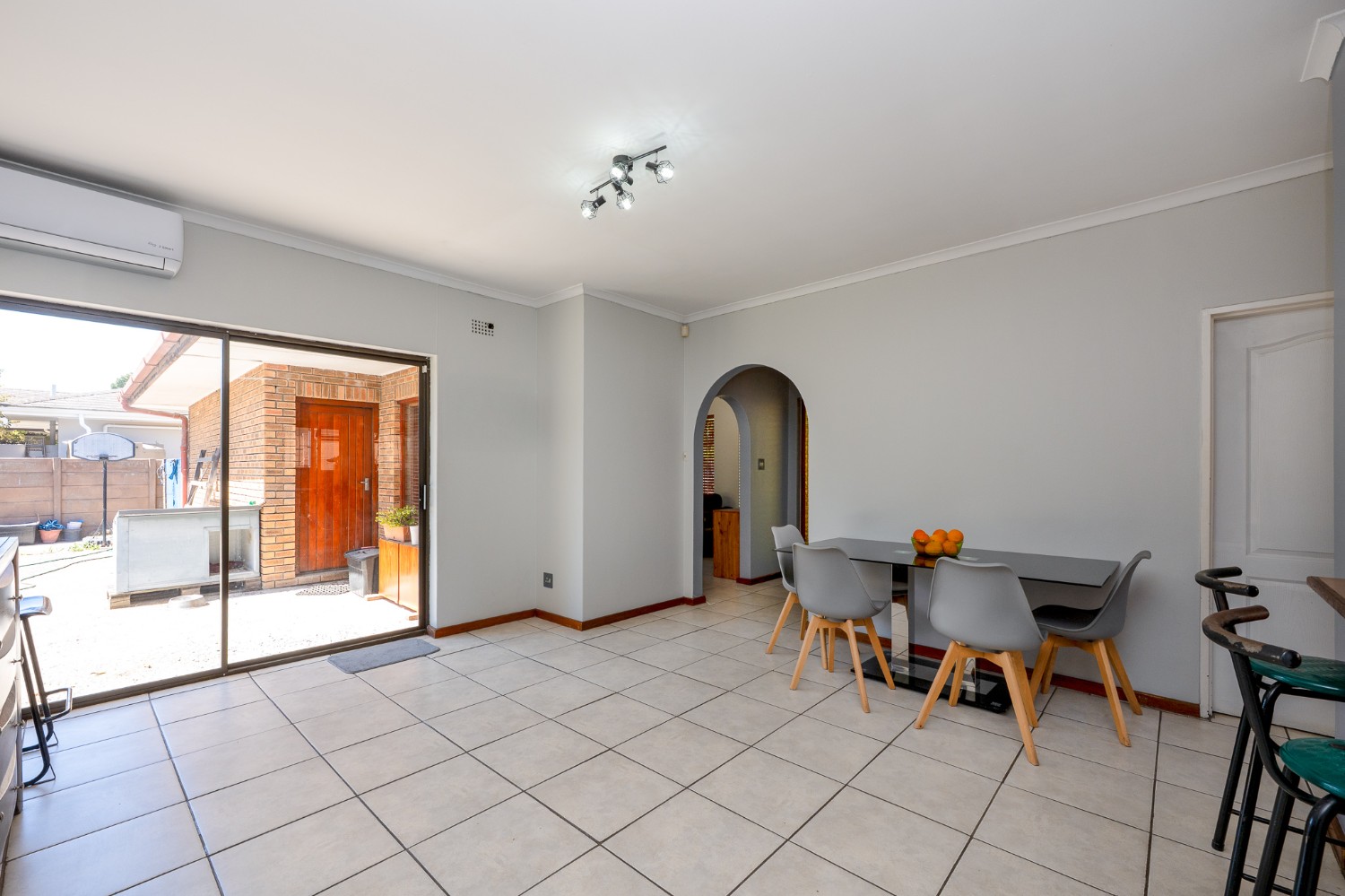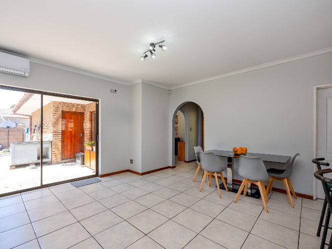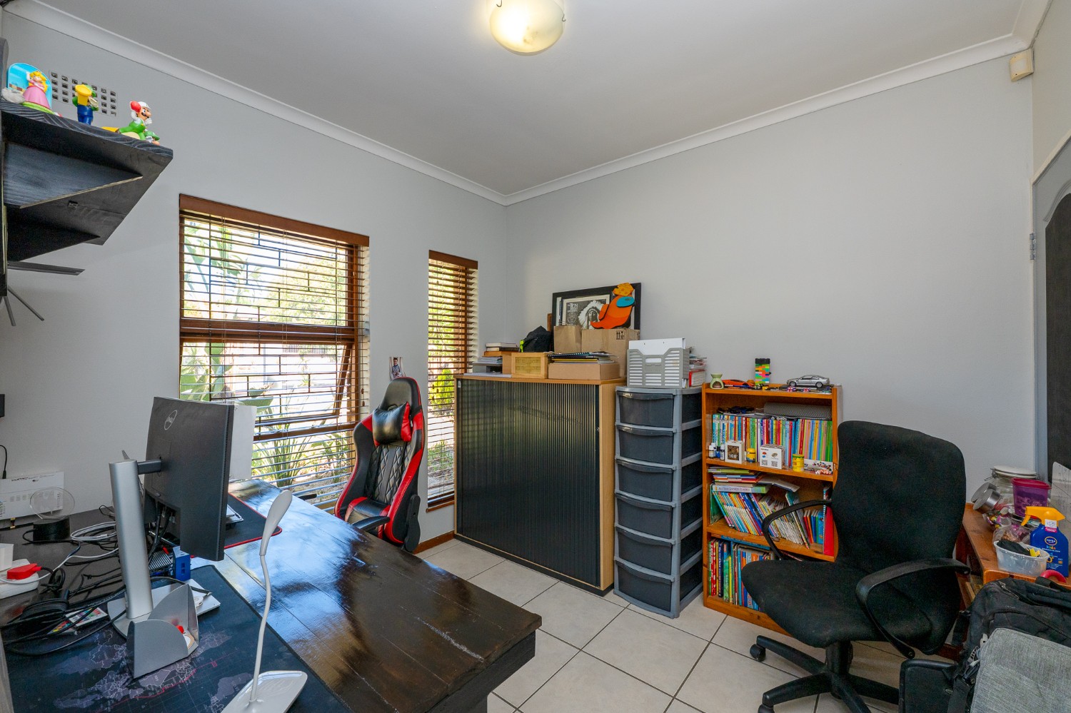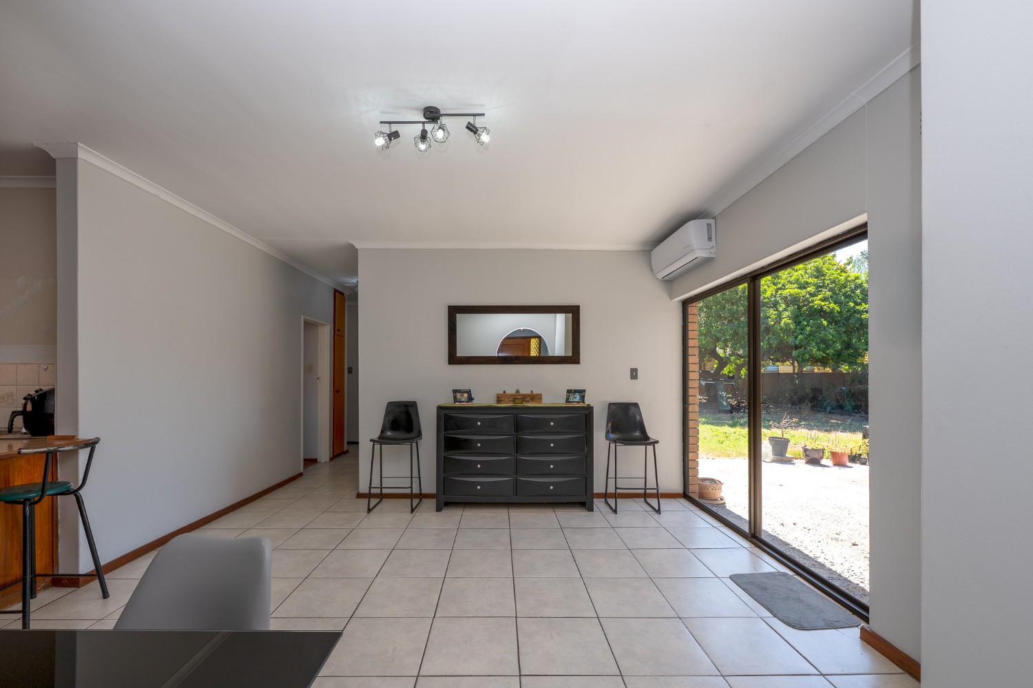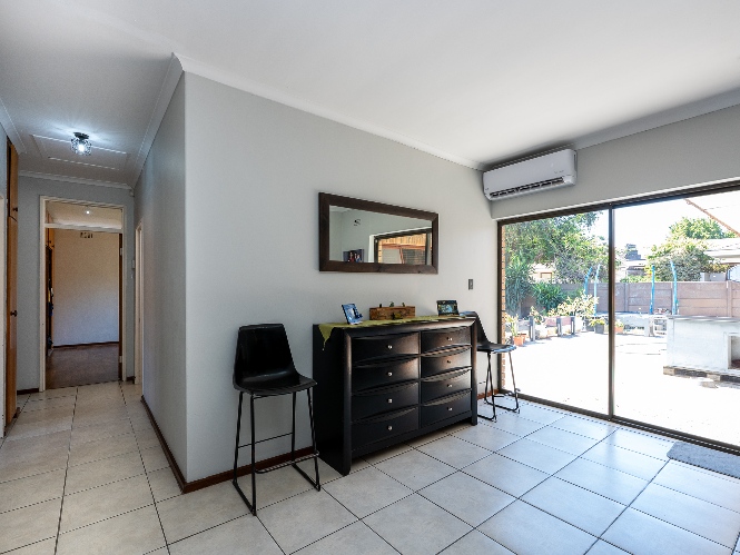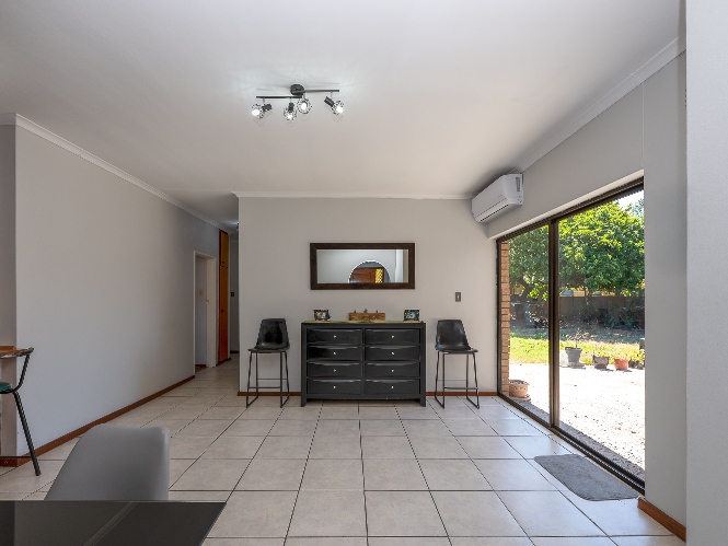 The welcoming lounge offers a comfortable space to relax and unwind, while the dedicated office area is perfect for those who work from home or need a quiet study space. The dining room features an air-conditioning unit and a sliding door opening up to the backyard. The open-plan kitchen is designed for both functionality and style, offering plenty of countertop space, built-in cupboards, and a separate scullery/laundry for added convenience.
