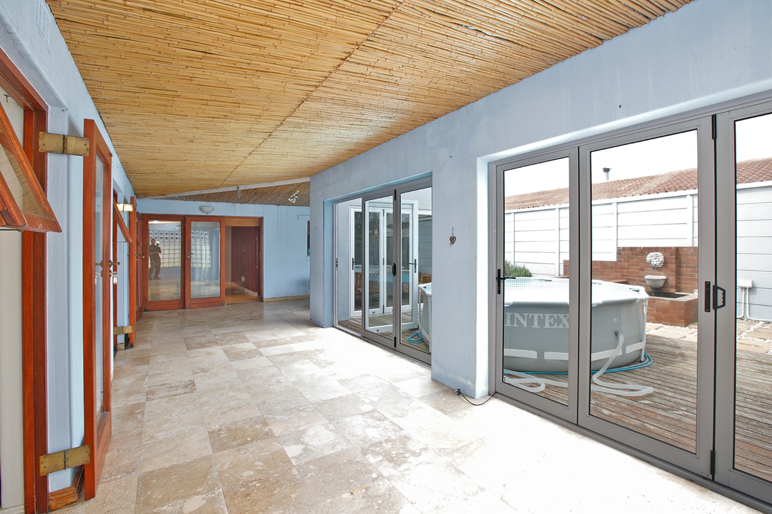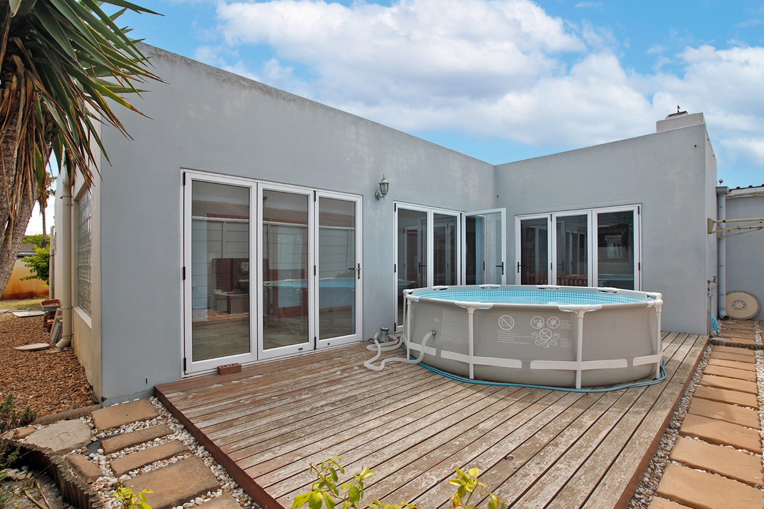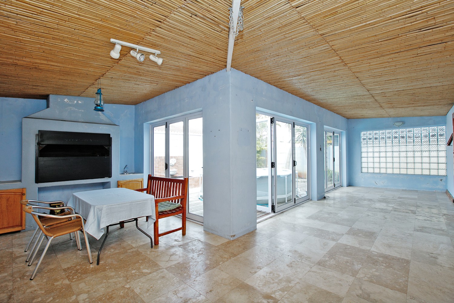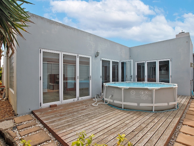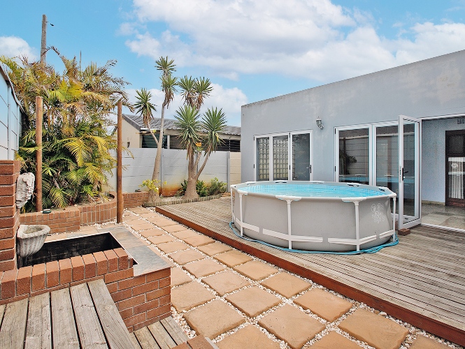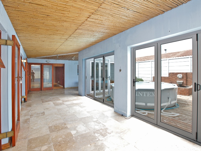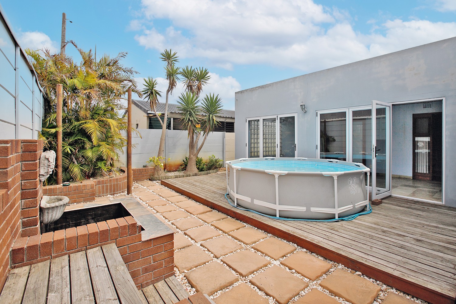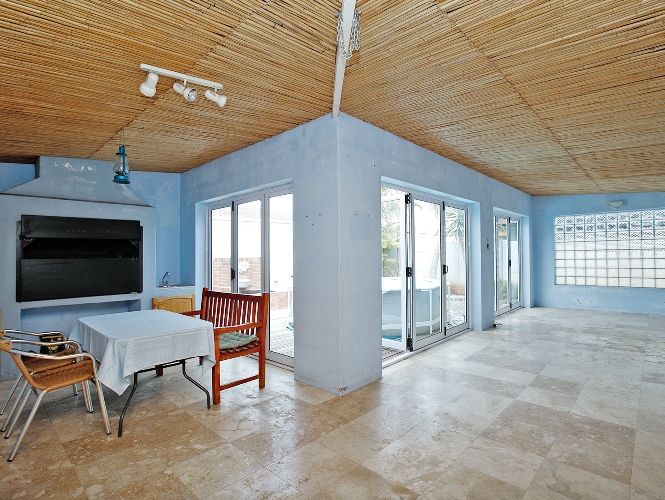 An enclosed entertainment area with a built-in braai creates an ideal space for year-round entertaining and opens onto the backyard, complete with a wooden deck for relaxed outdoor living.