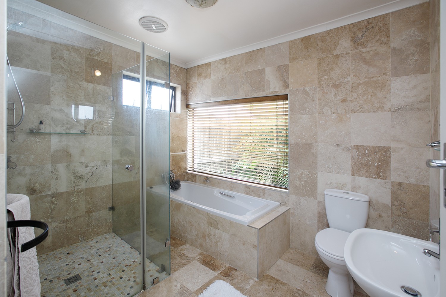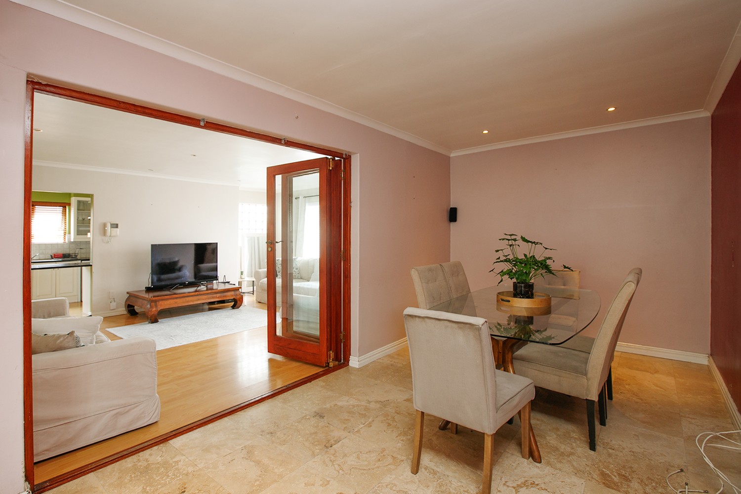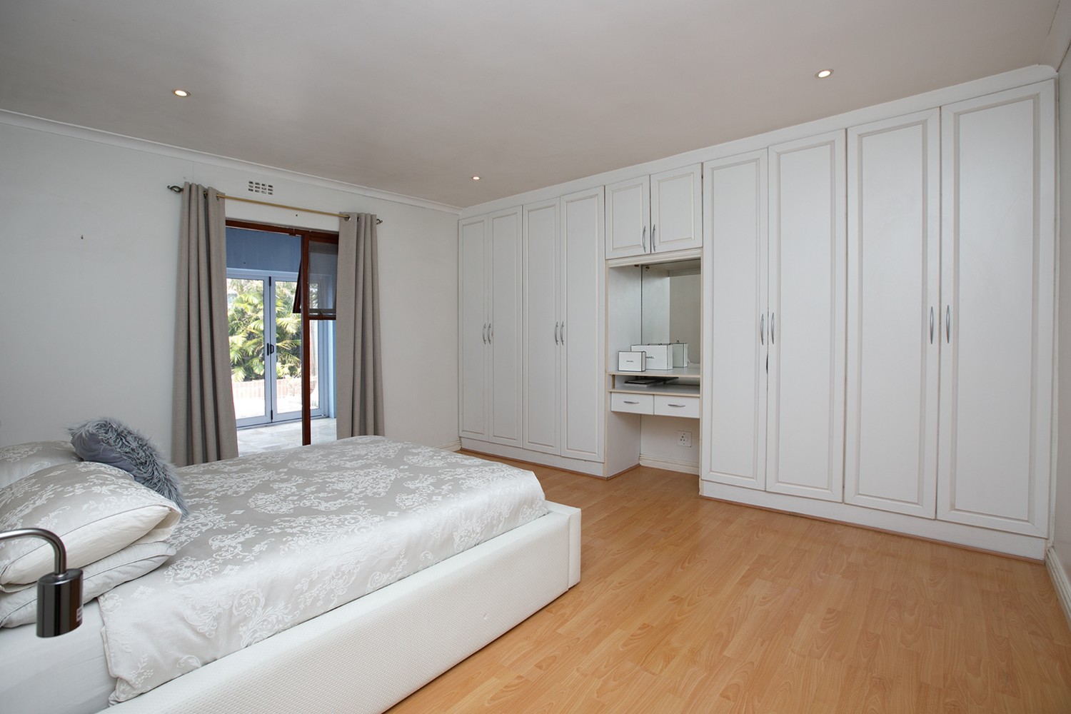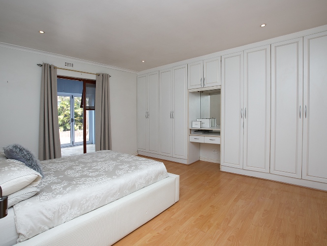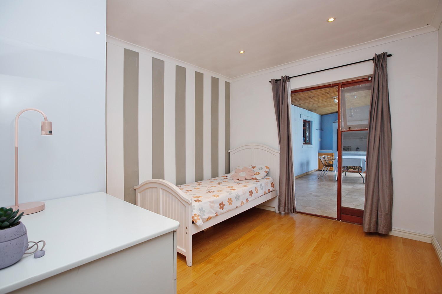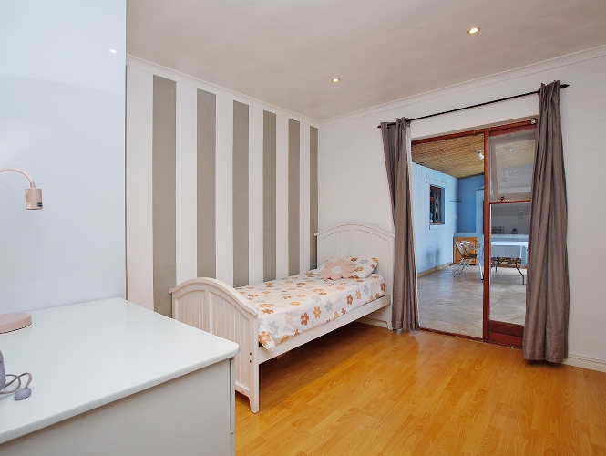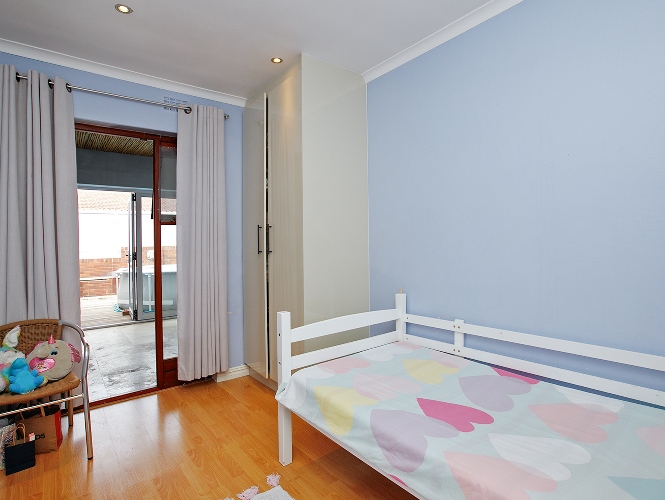 An enclosed entertainment area with a built-in braai creates an ideal space for year-round entertaining and opens onto the backyard, complete with a wooden deck for relaxed outdoor living.