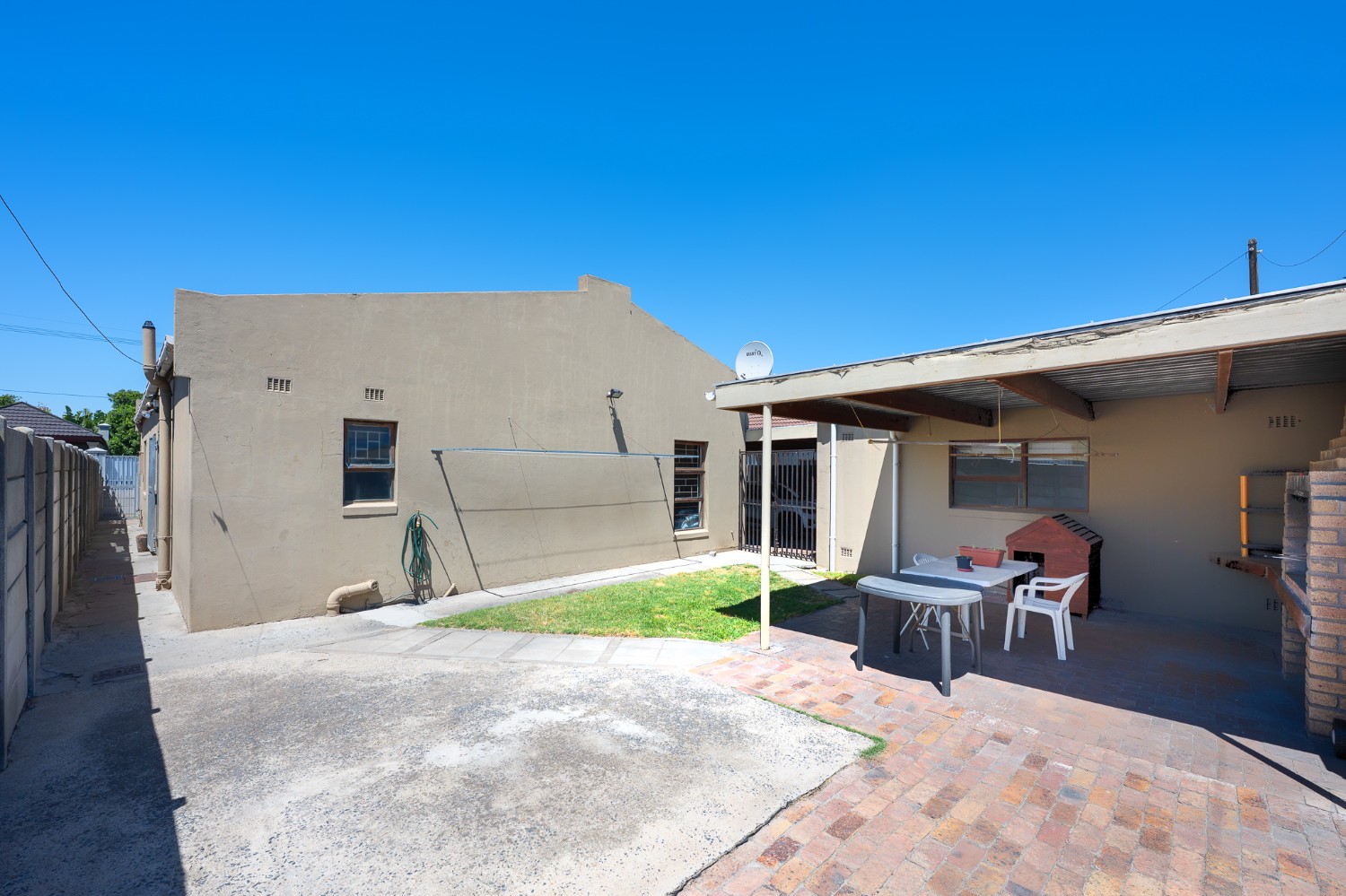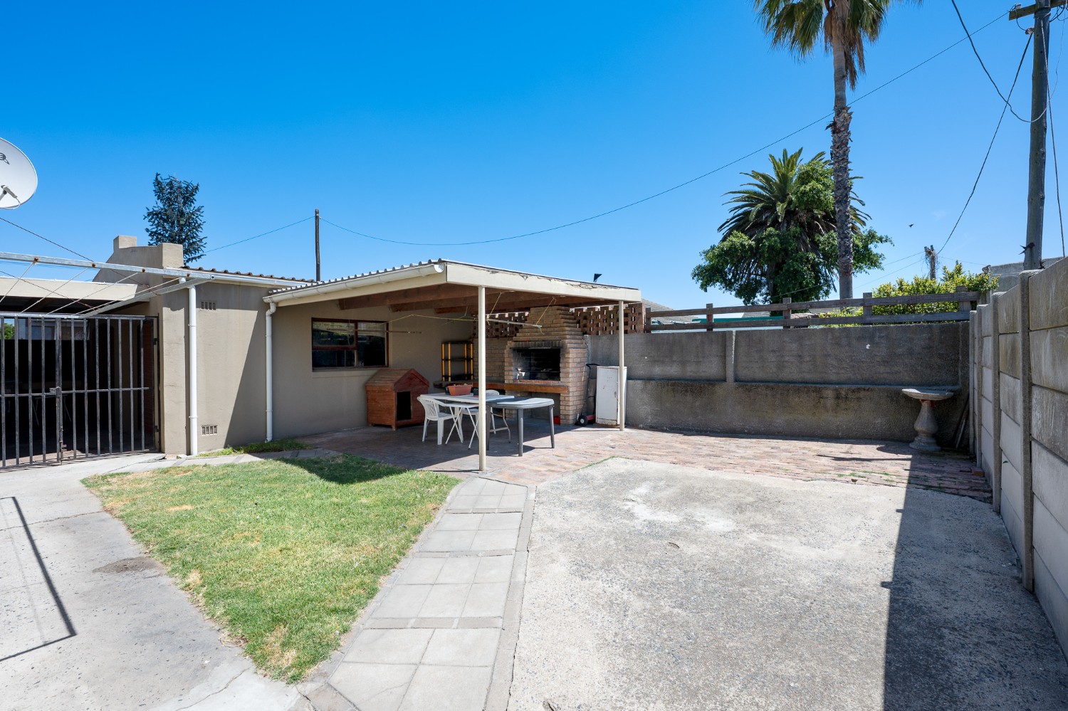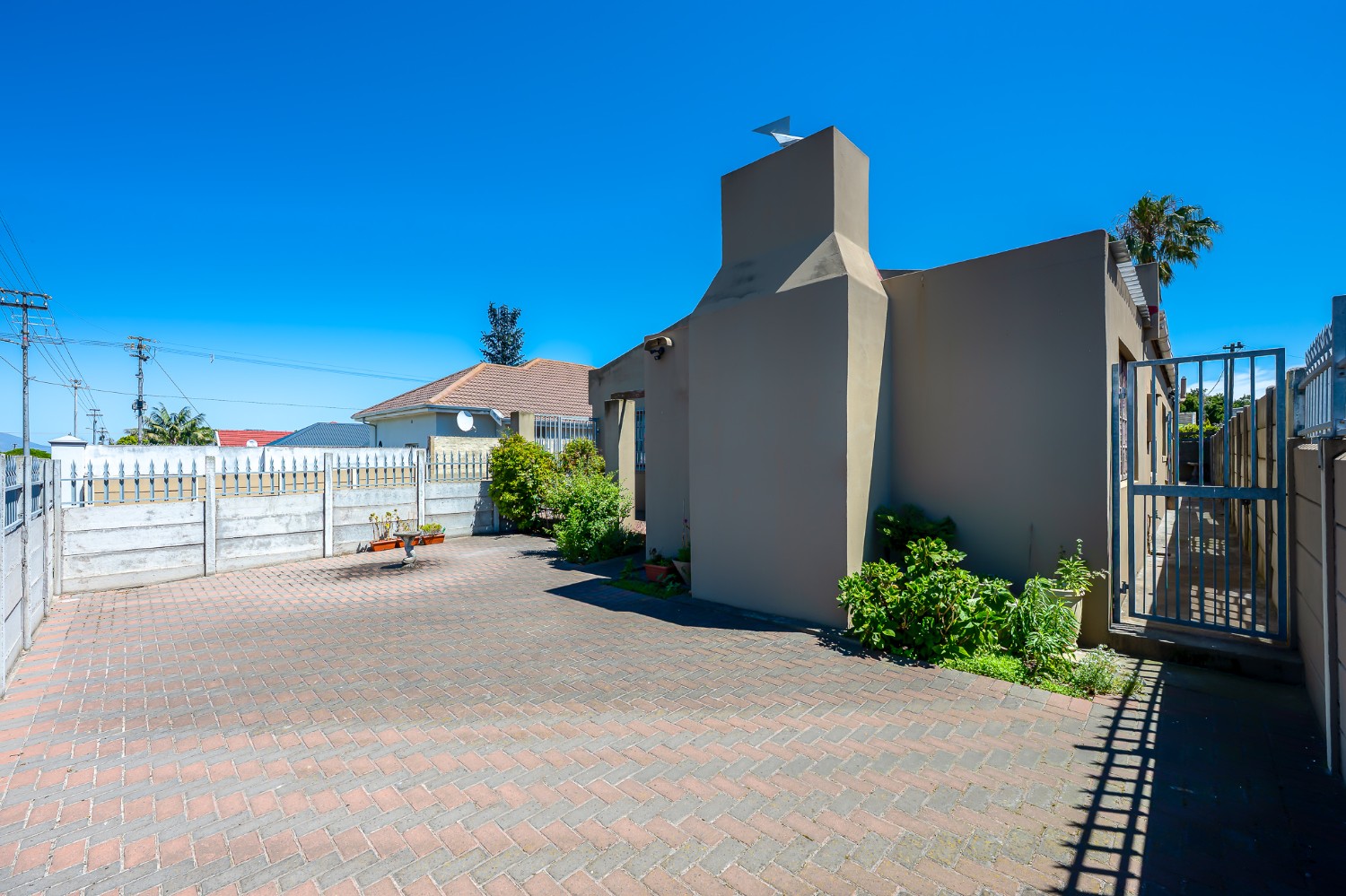Security and convenience are top priorities, with three galvanised gates providing access to the front, back, and side doors, along with four security cameras and two Spanish burglar bars for added peace of mind. The property is fully enclosed by six-foot boundary walls and a galvanised steel gate at the driveway.