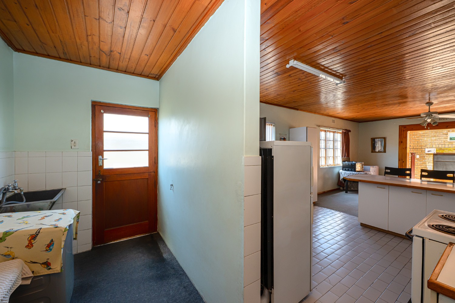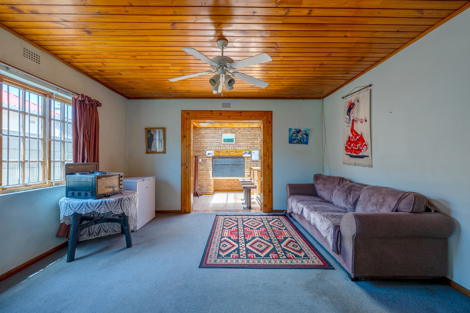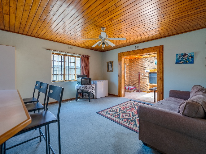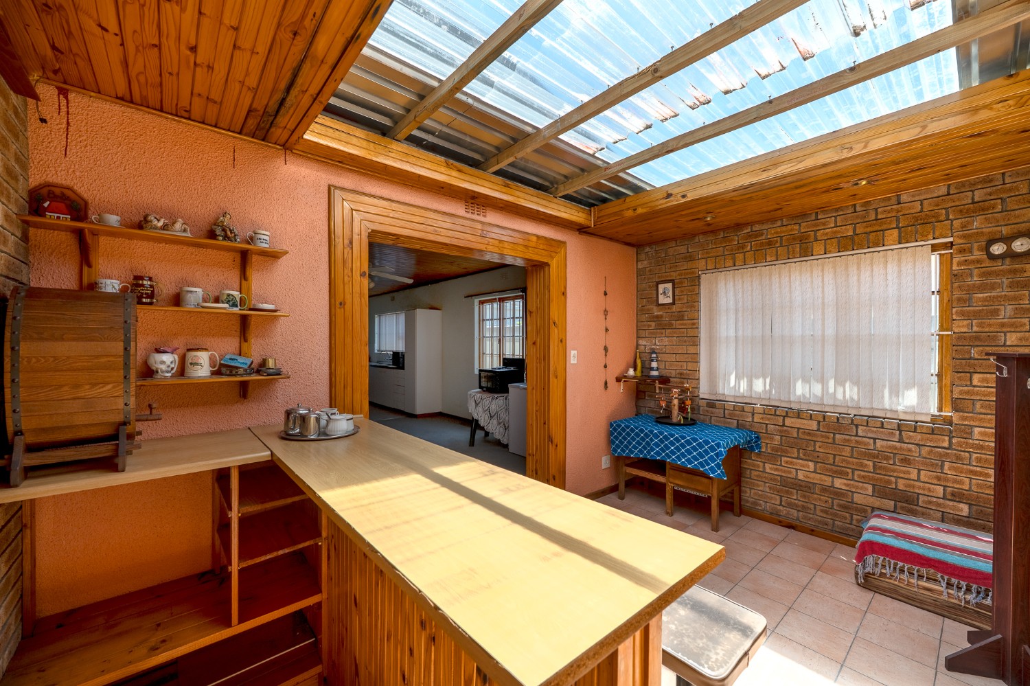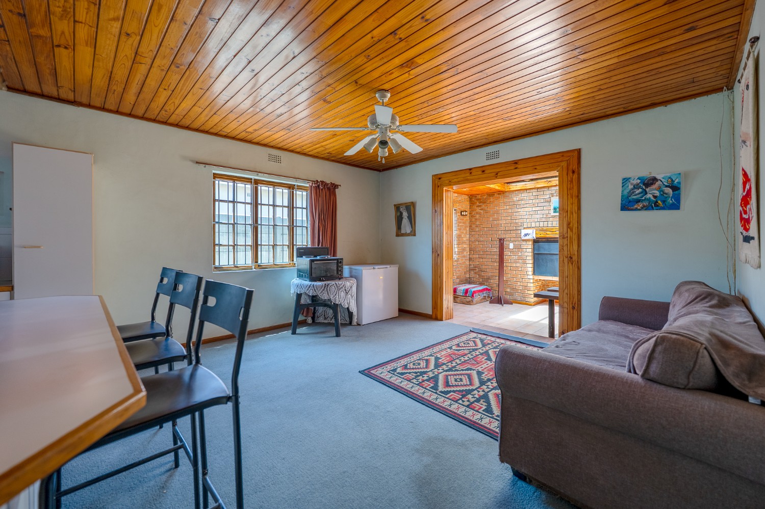 The living room features wooden ceilings and a large window that allows plenty of natural light to fill the space. The dining room opens to an indoor braai/sunroom complete with a built-in braai and a built-in bar, ideal for year-round entertaining. The spacious kitchen is fitted with built-in cupboards, ample countertop space, a double sink and a laundry nook, providing space for all of your appliances.