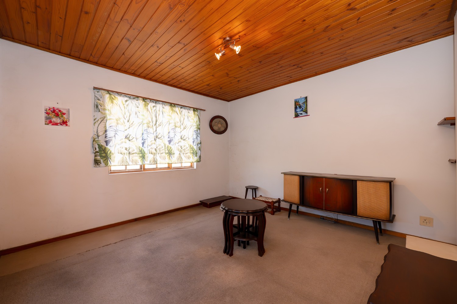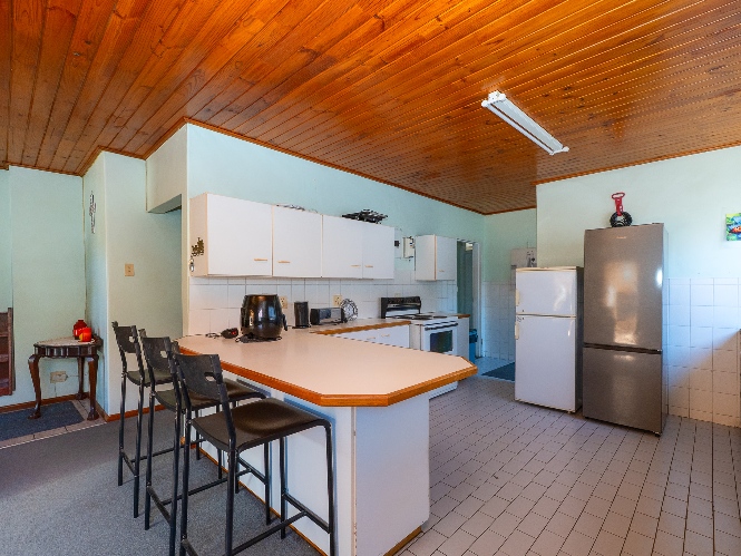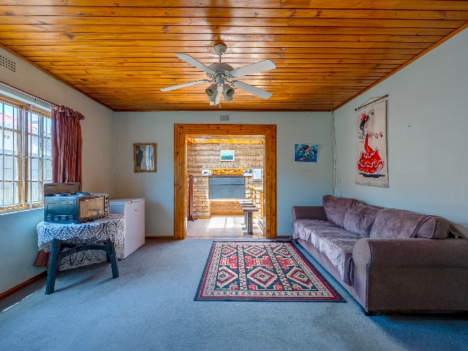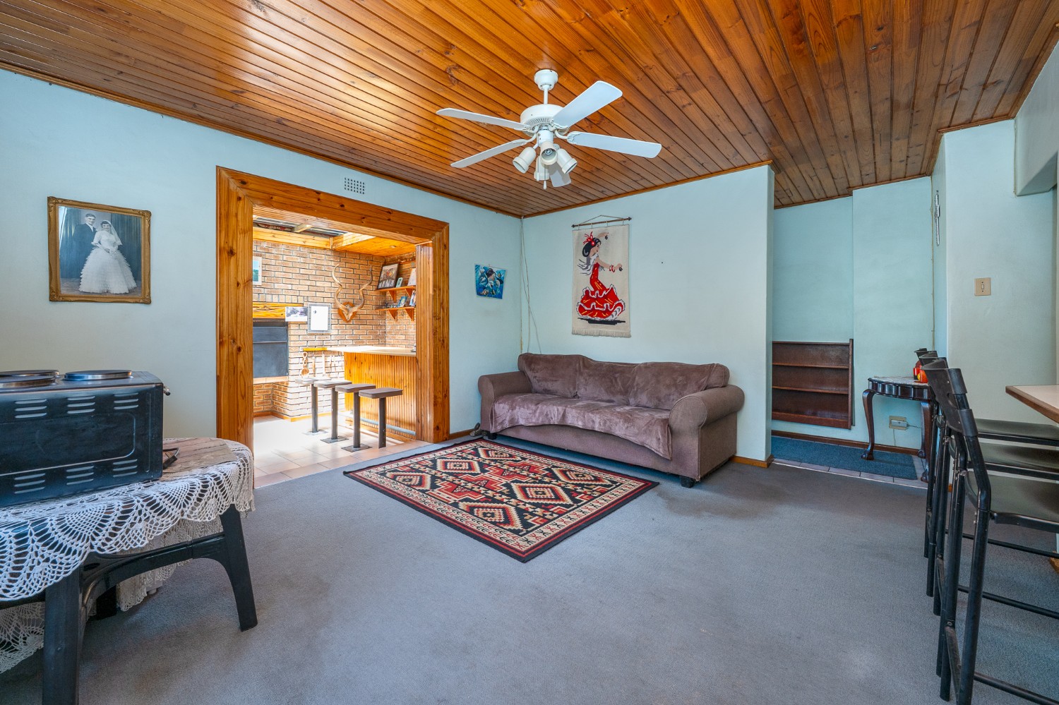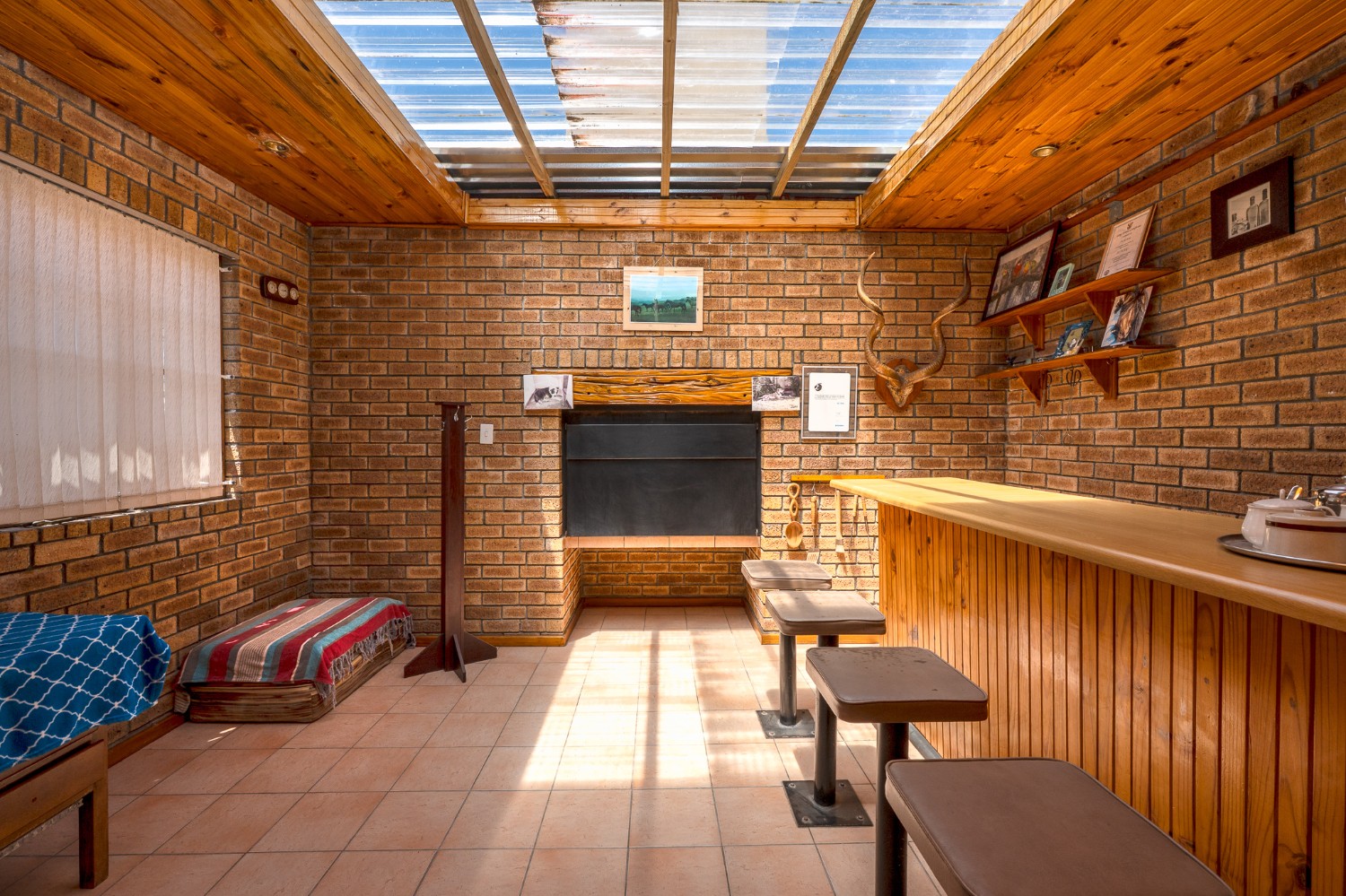 The living room features wooden ceilings and a large window that allows plenty of natural light to fill the space. The dining room opens to an indoor braai/sunroom complete with a built-in braai and a built-in bar, ideal for year-round entertaining. The spacious kitchen is fitted with built-in cupboards, ample countertop space, a double sink and a laundry nook, providing space for all of your appliances.