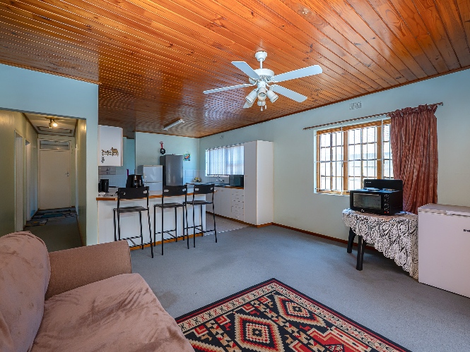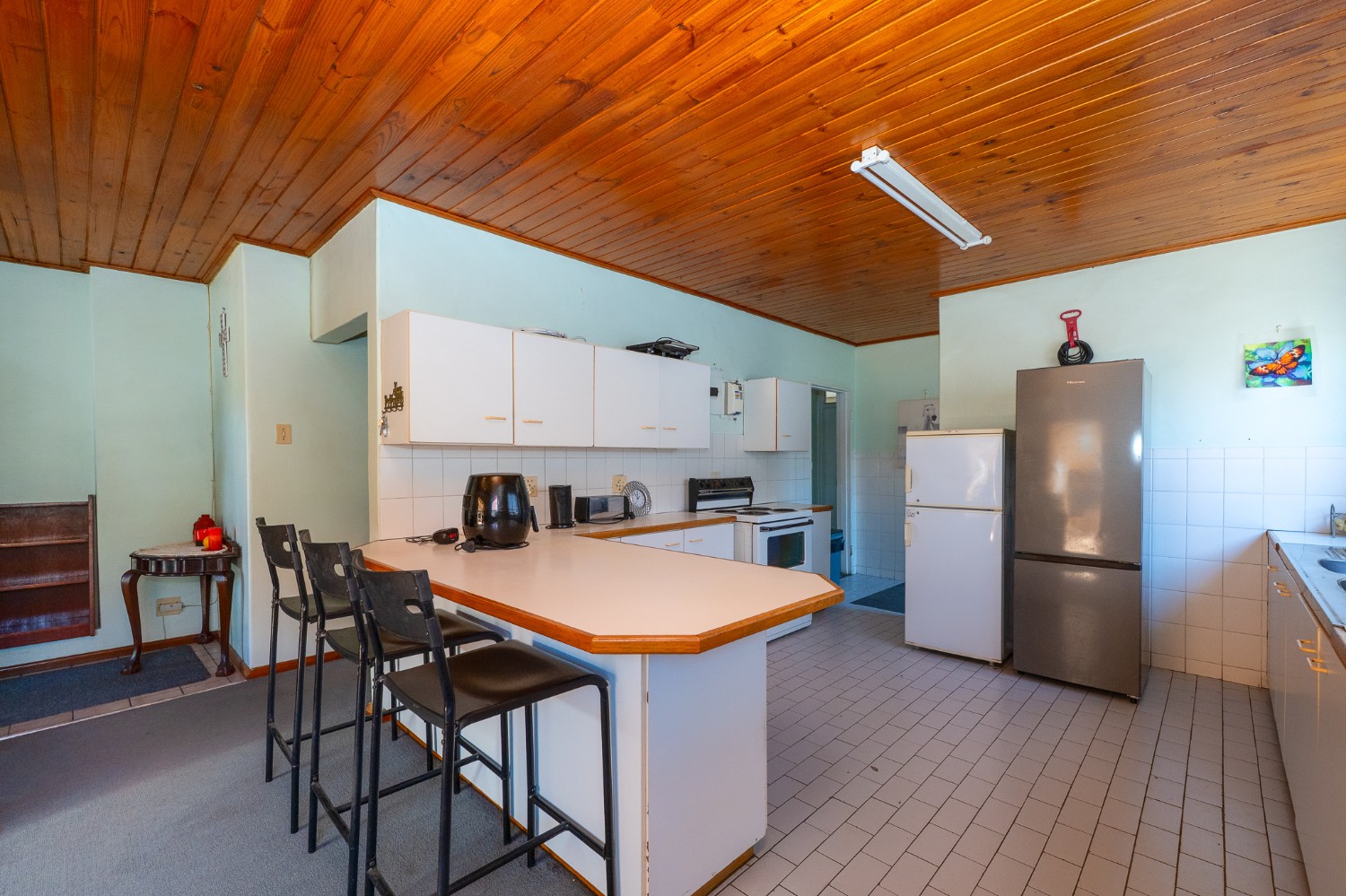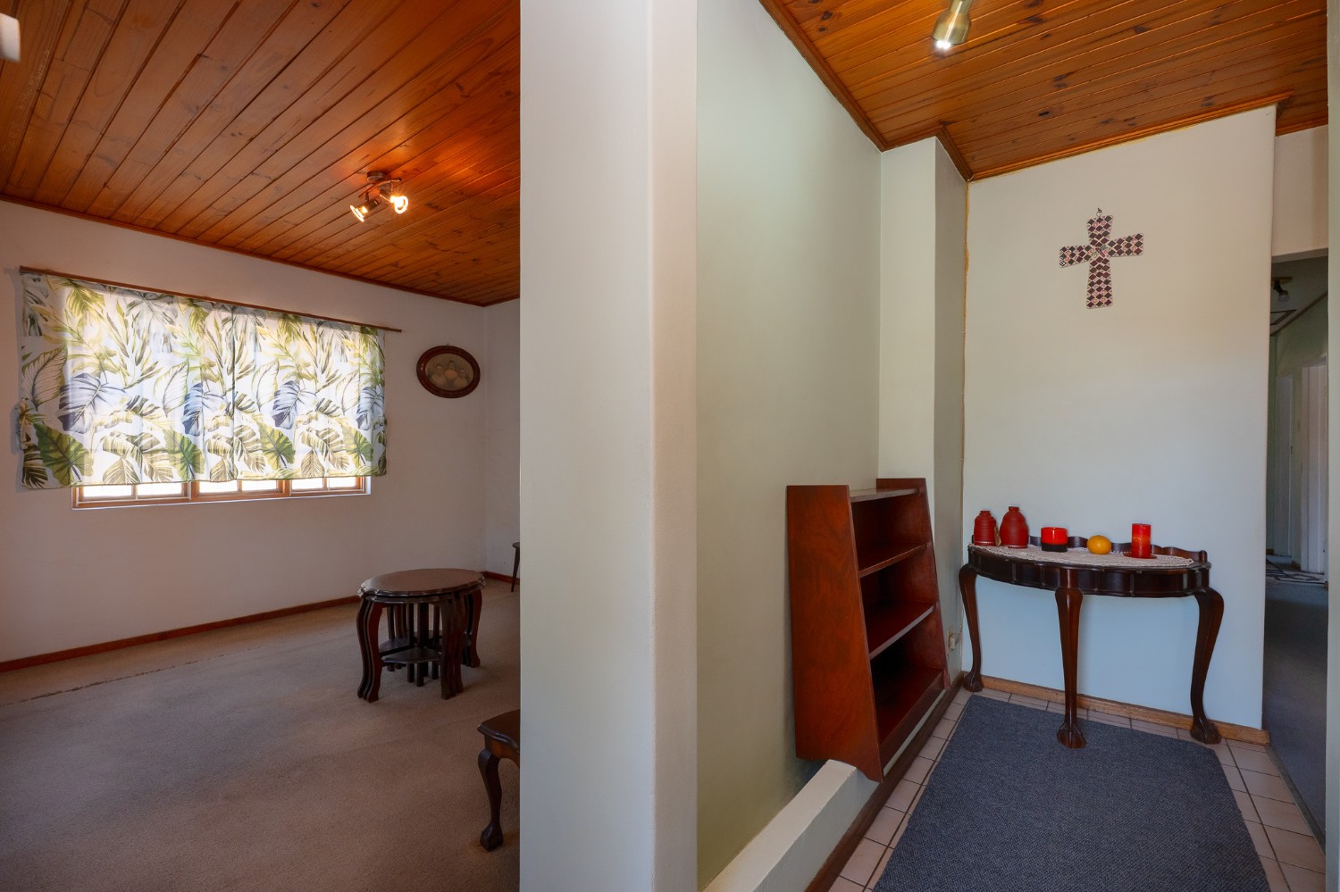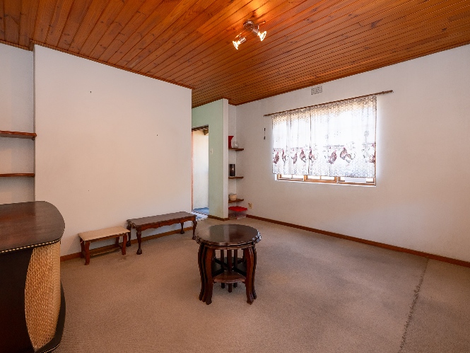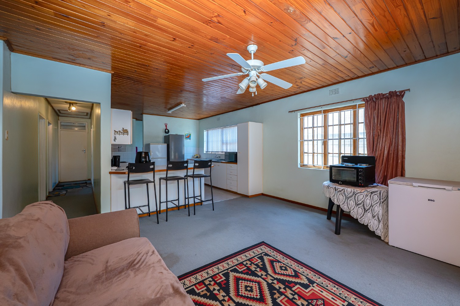 The living room features wooden ceilings and a large window that allows plenty of natural light to fill the space. The dining room opens to an indoor braai/sunroom complete with a built-in braai and a built-in bar, ideal for year-round entertaining. The spacious kitchen is fitted with built-in cupboards, ample countertop space, a double sink and a laundry nook, providing space for all of your appliances.