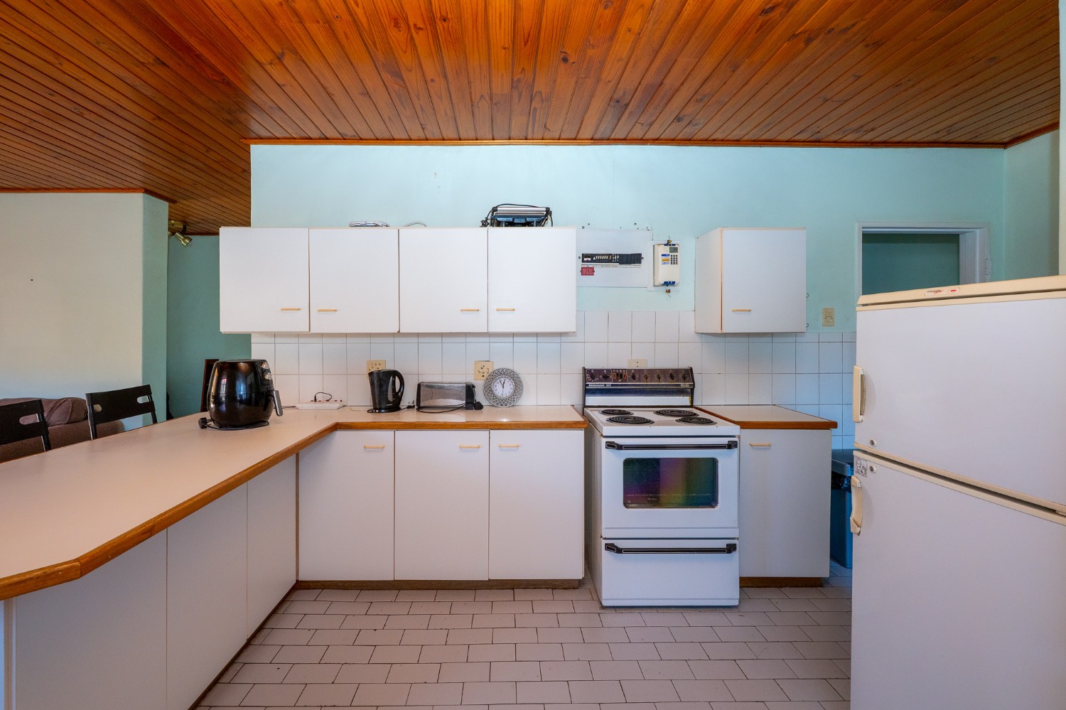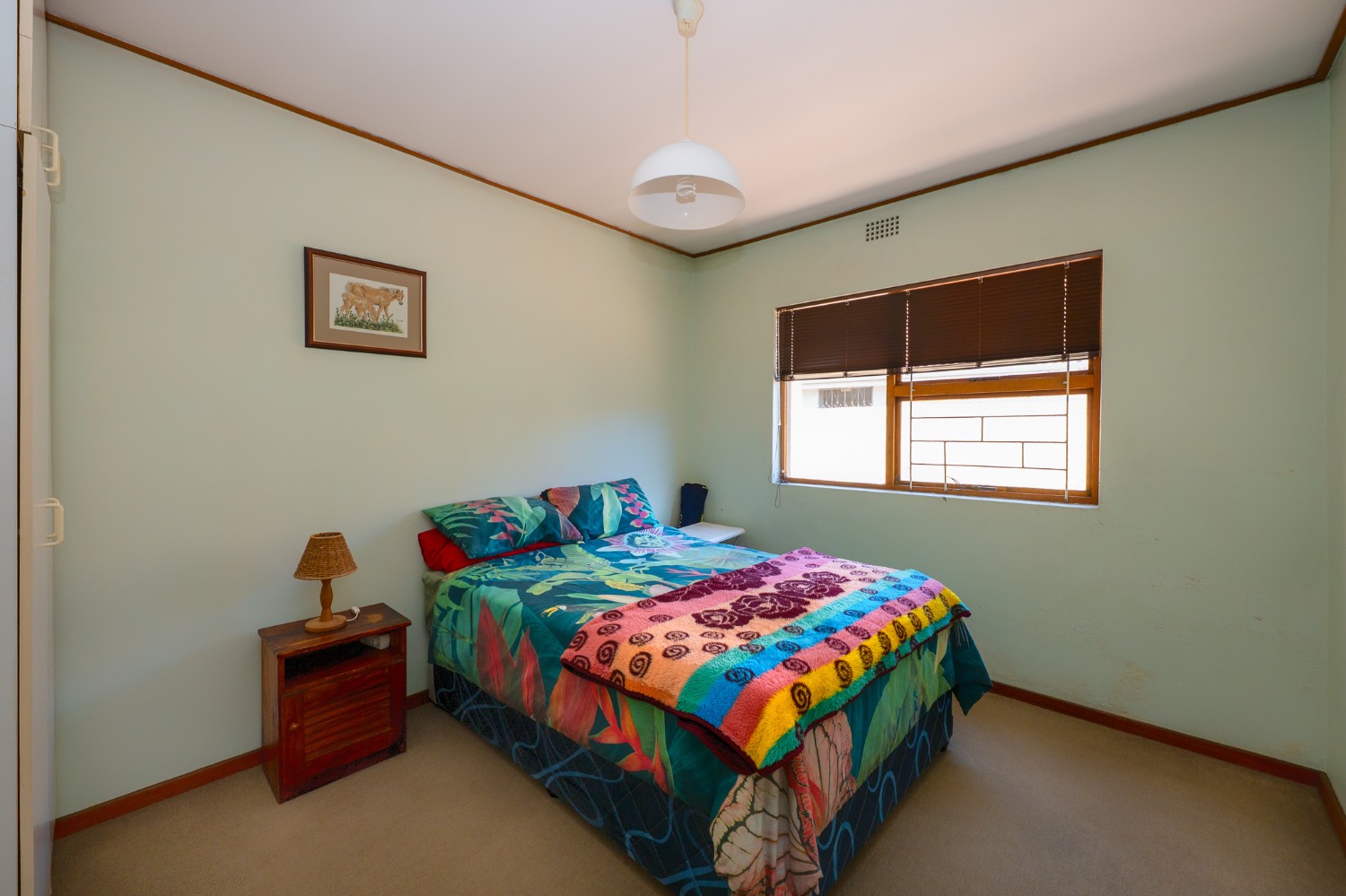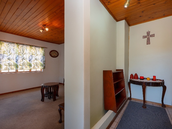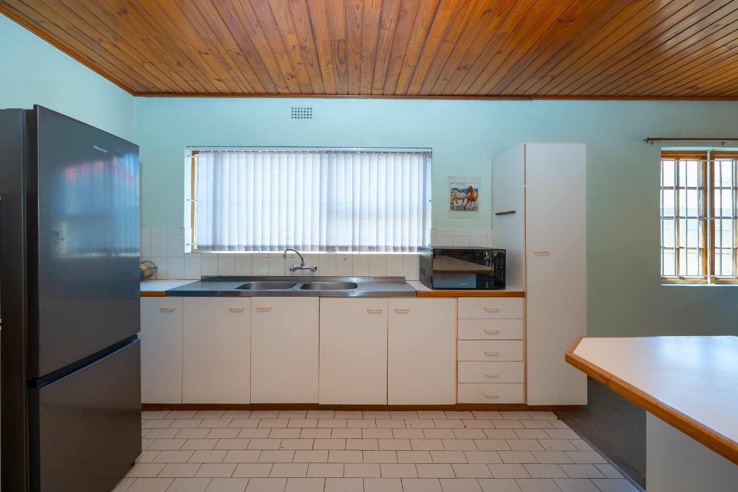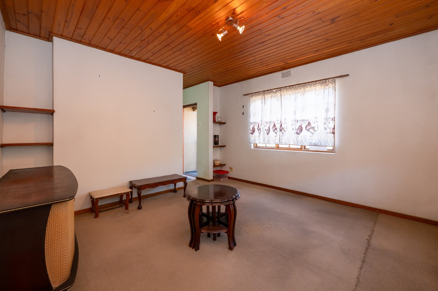 The living room features wooden ceilings and a large window that allows plenty of natural light to fill the space. The dining room opens to an indoor braai/sunroom complete with a built-in braai and a built-in bar, ideal for year-round entertaining. The spacious kitchen is fitted with built-in cupboards, ample countertop space, a double sink and a laundry nook, providing space for all of your appliances.