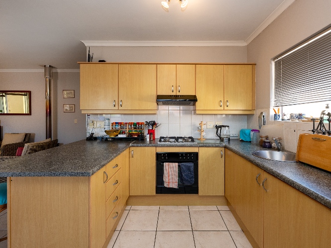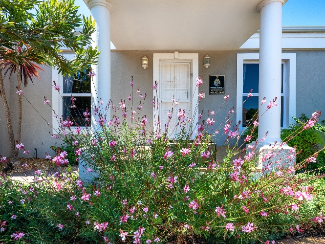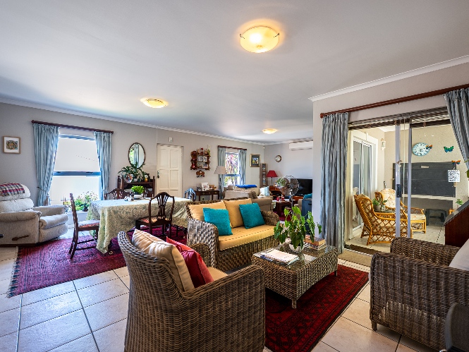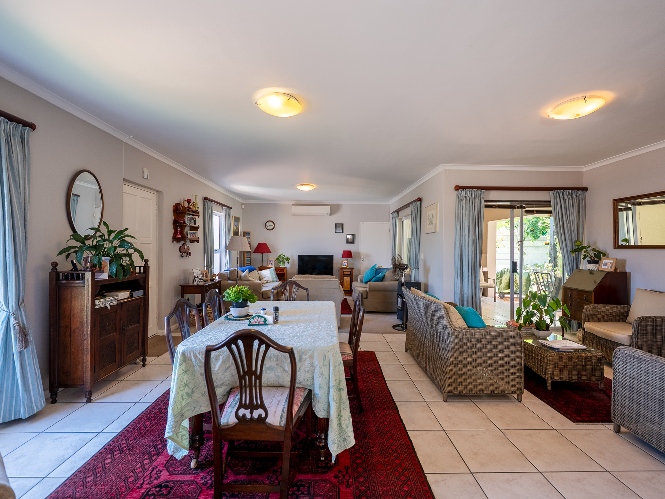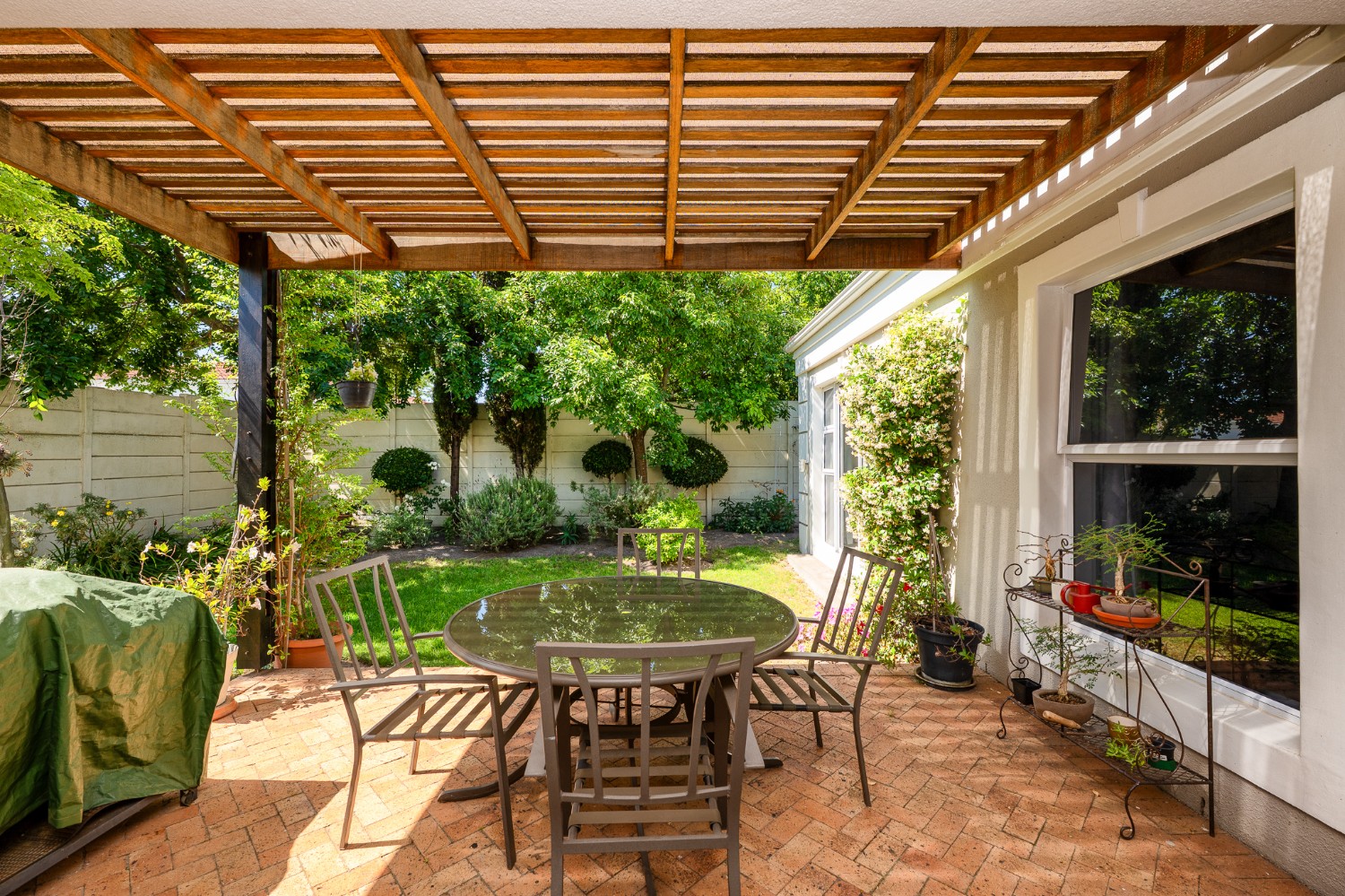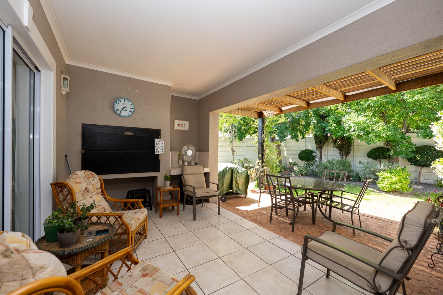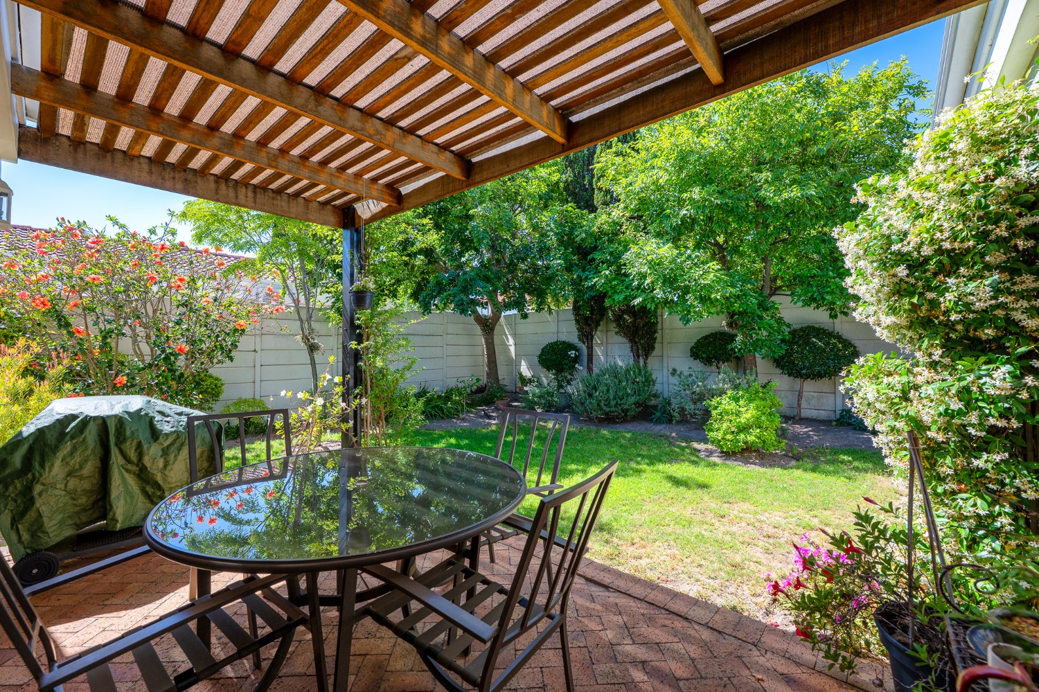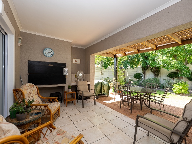 The home includes two garages (one automated) and a covered patio with a custom-made Pergola and built-in braai, perfect for relaxing or entertaining while overlooking the peaceful and low-maintenance garden.
