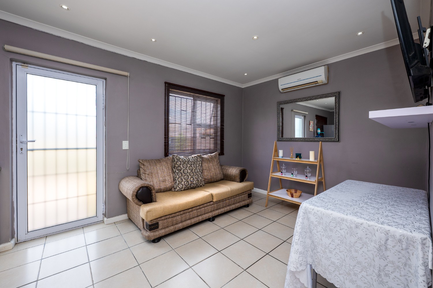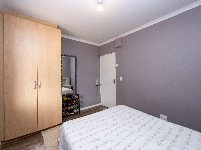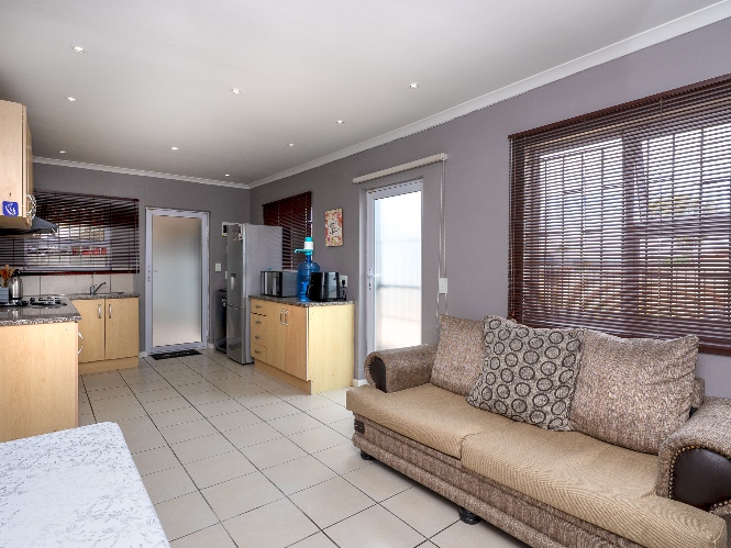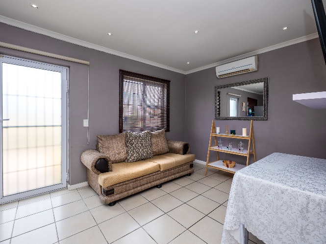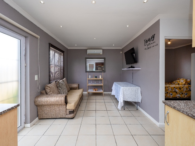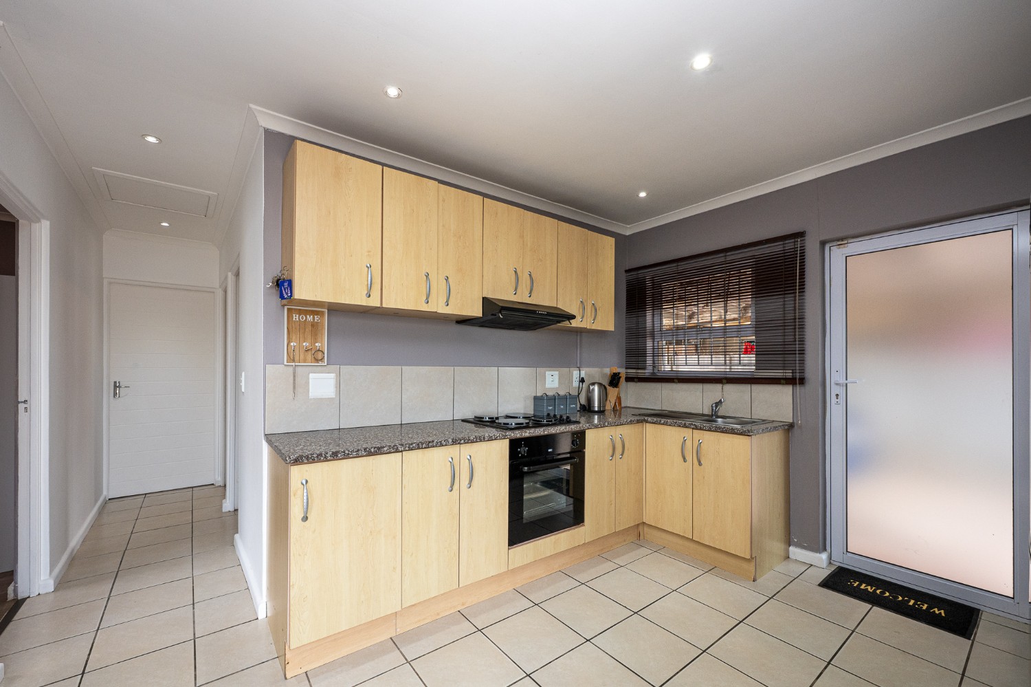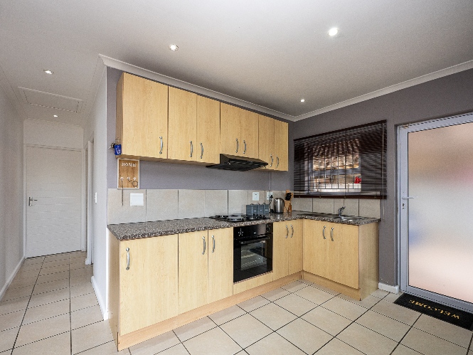 The property welcomes you into an open-plan lounge featuring an air-conditioning unit and modern downlights, creating a warm and inviting atmosphere. The kitchen is well-appointed with built-in cupboards, an under-counter oven and hob, and a plumbing point for added practicality.