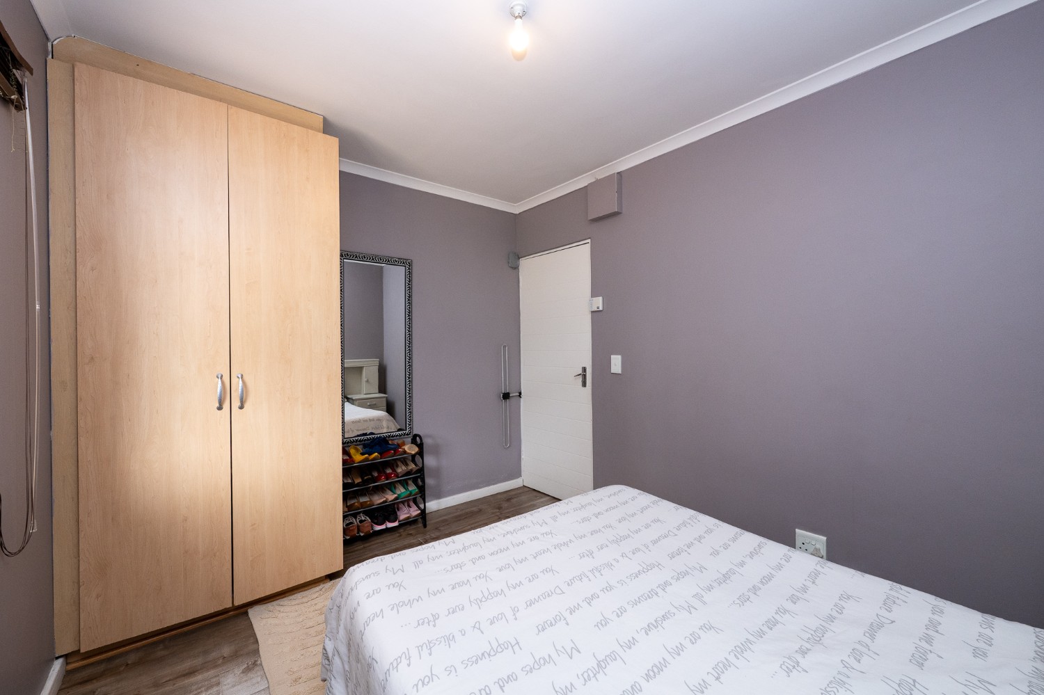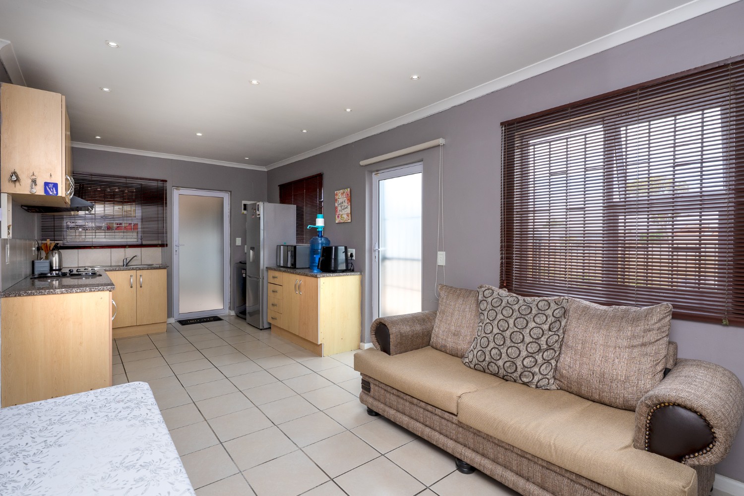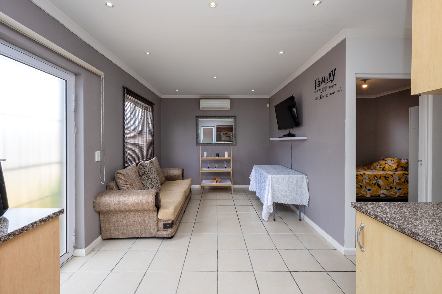 The property welcomes you into an open-plan lounge featuring an air-conditioning unit and modern downlights, creating a warm and inviting atmosphere. The kitchen is well-appointed with built-in cupboards, an under-counter oven and hob, and a plumbing point for added practicality.