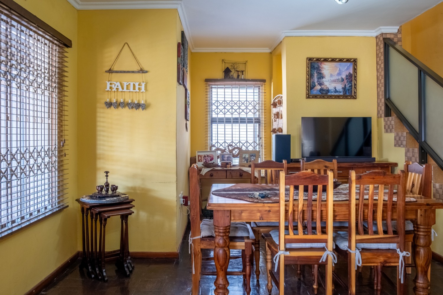 Welcoming dining area leading into a functional, well-appointed kitchen with built-in cupboards