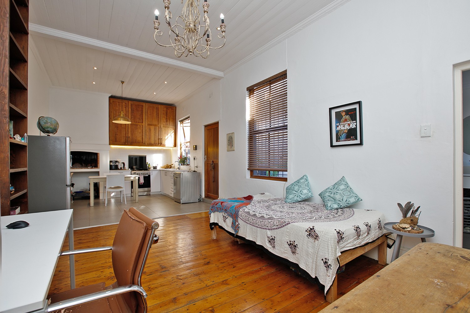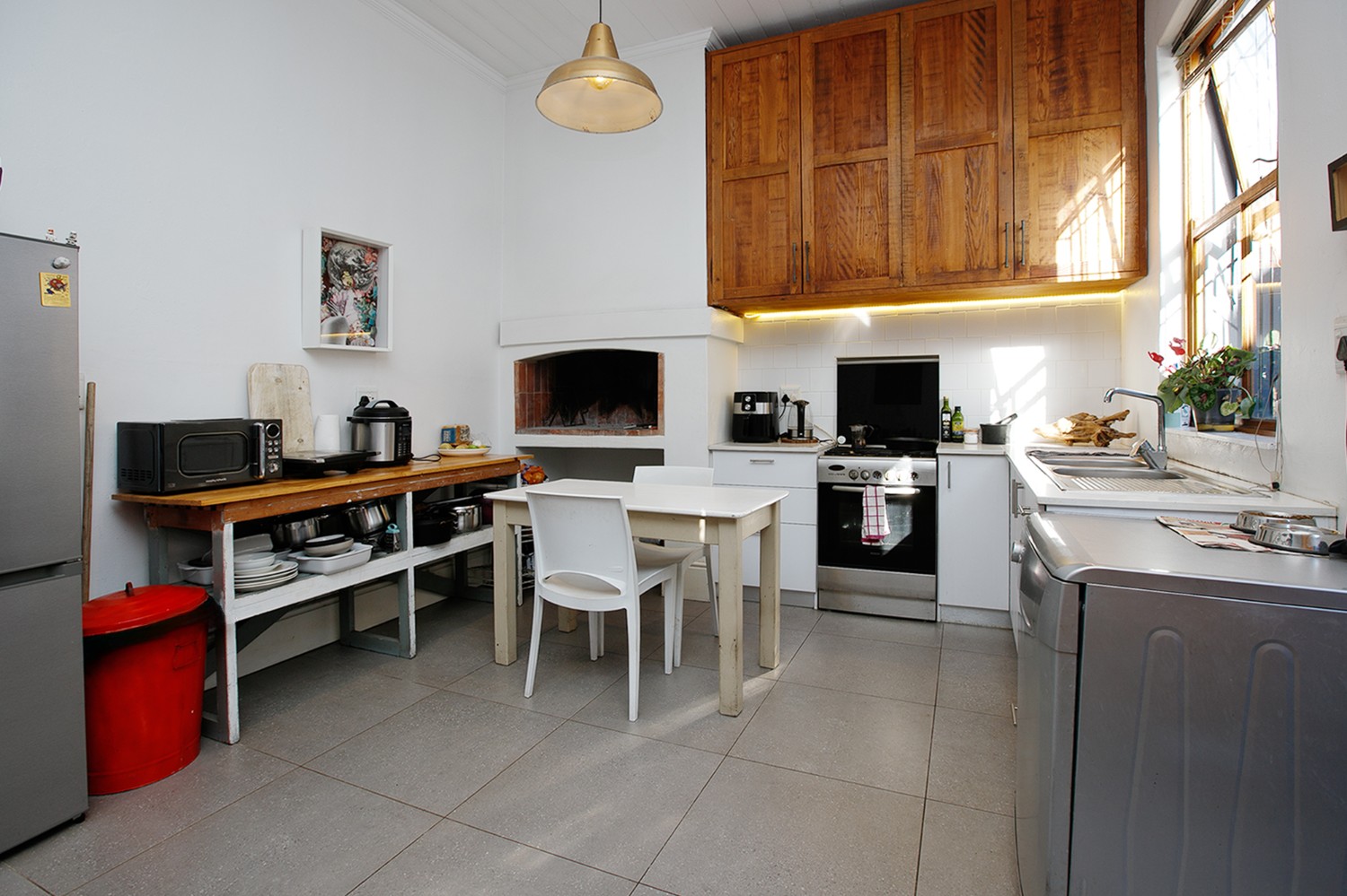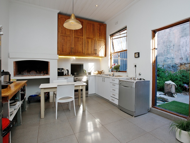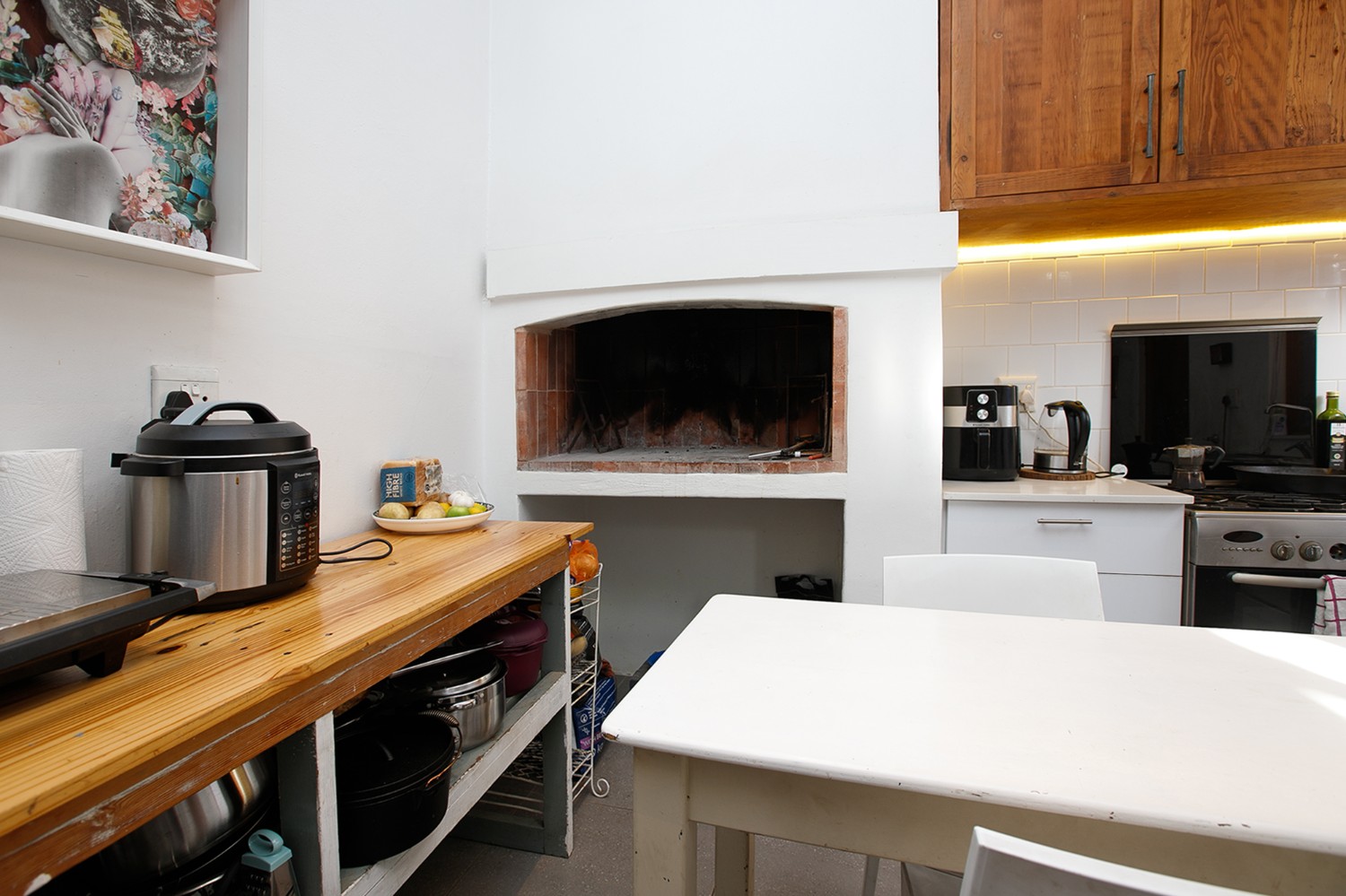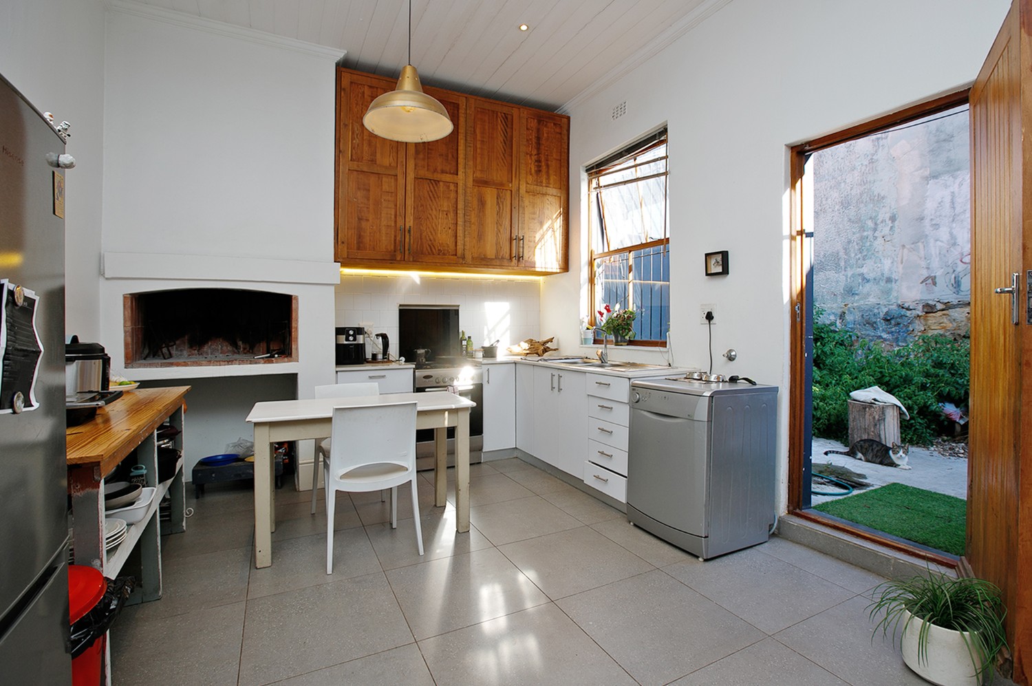 As you arrive, you are welcomed through a hallway that leads into a comfortable open-plan lounge, dining area, and kitchen. The kitchen offers built-in cupboards and even boasts an indoor braai—perfect for entertaining and creating delicious meals at home.