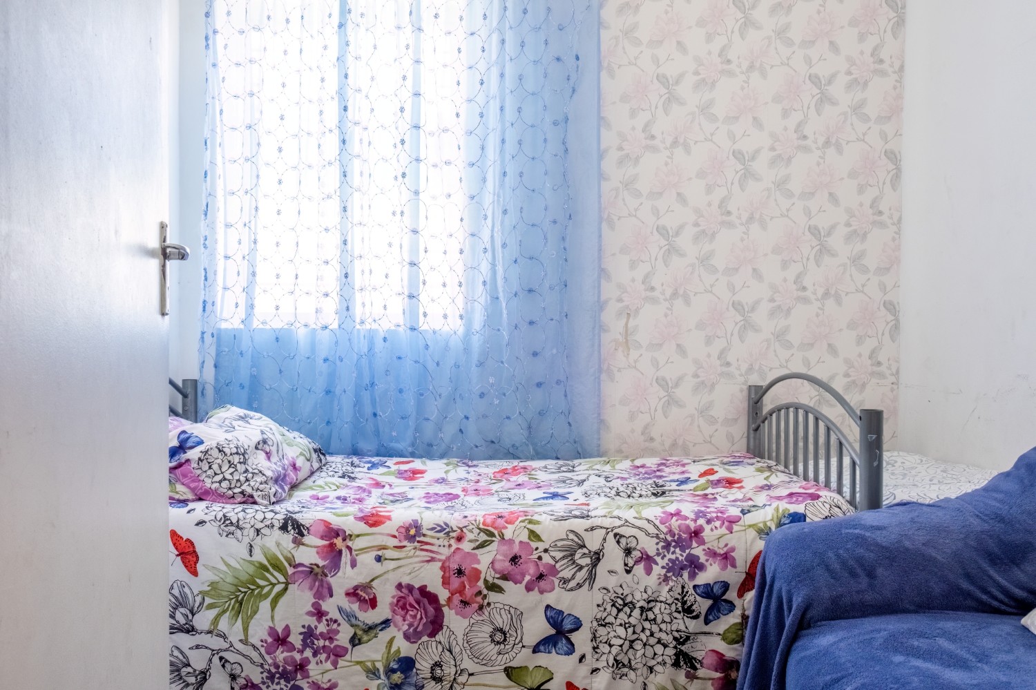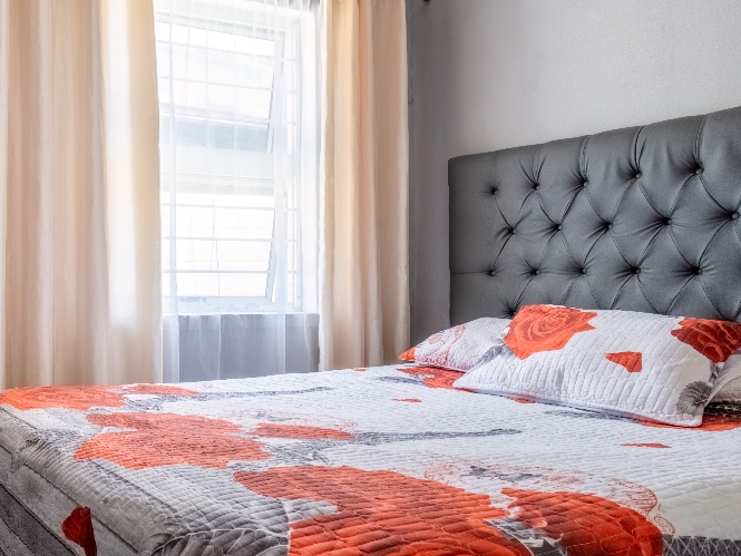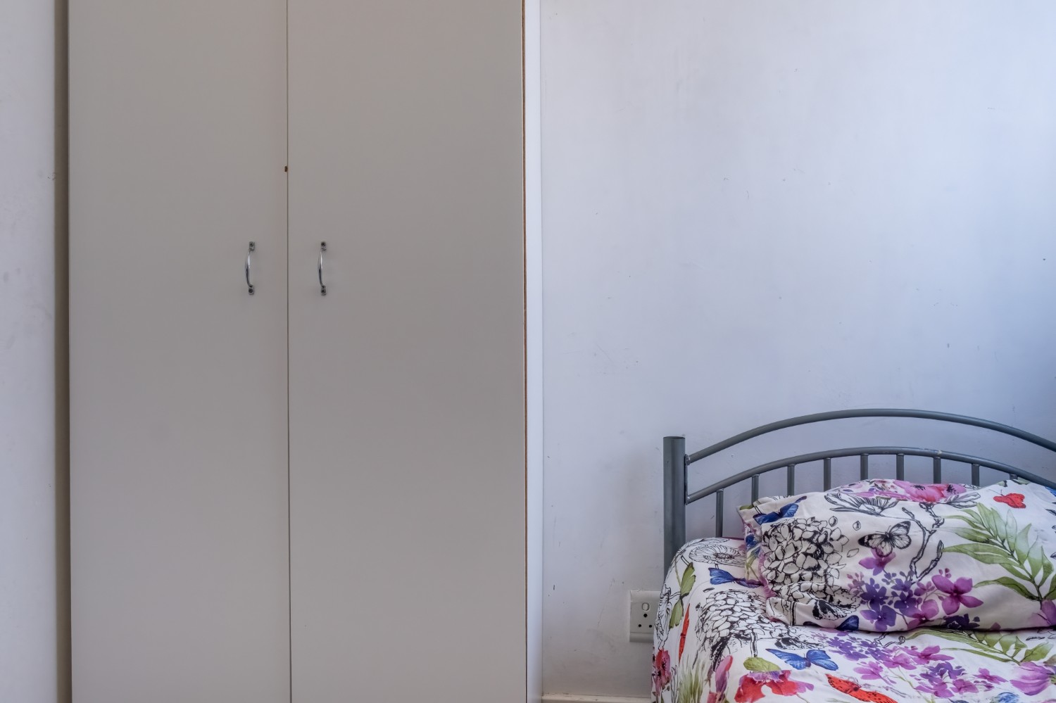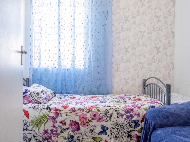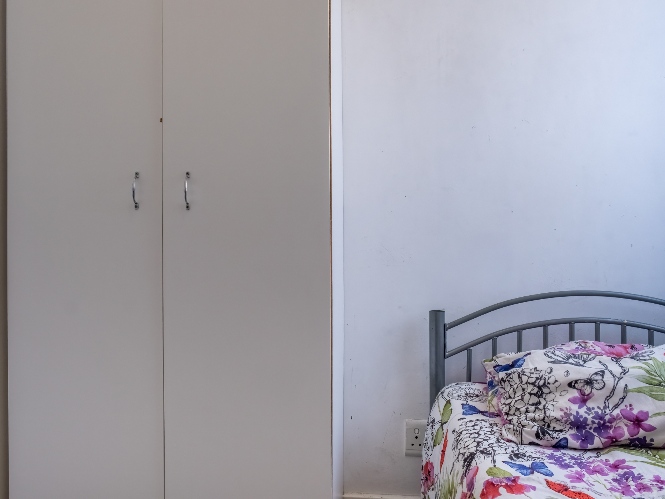 Both bedrooms feature built-in cupboards and share a neat family bathroom.