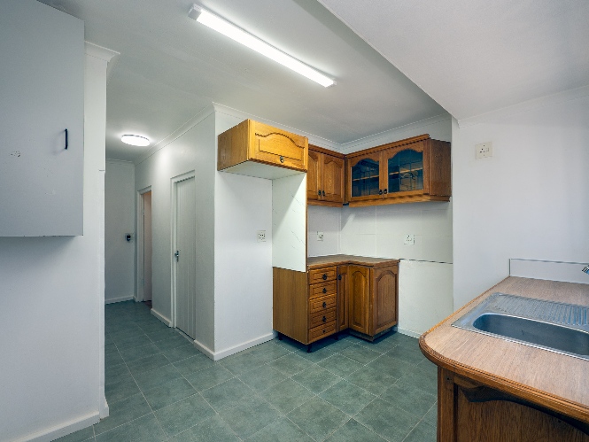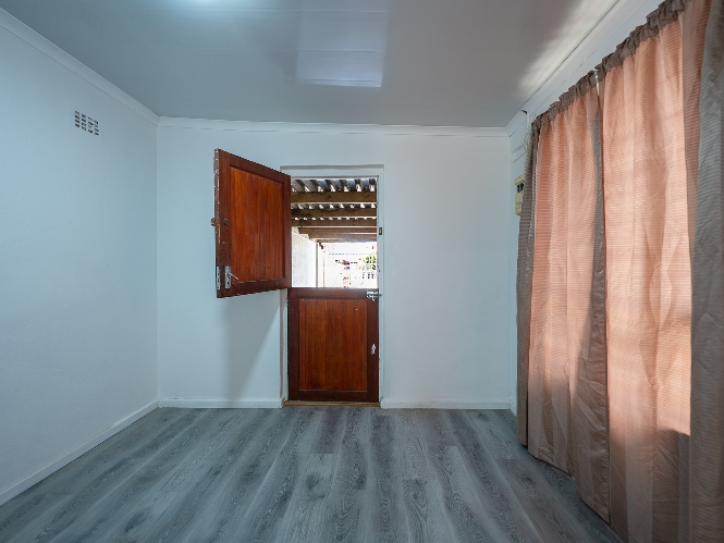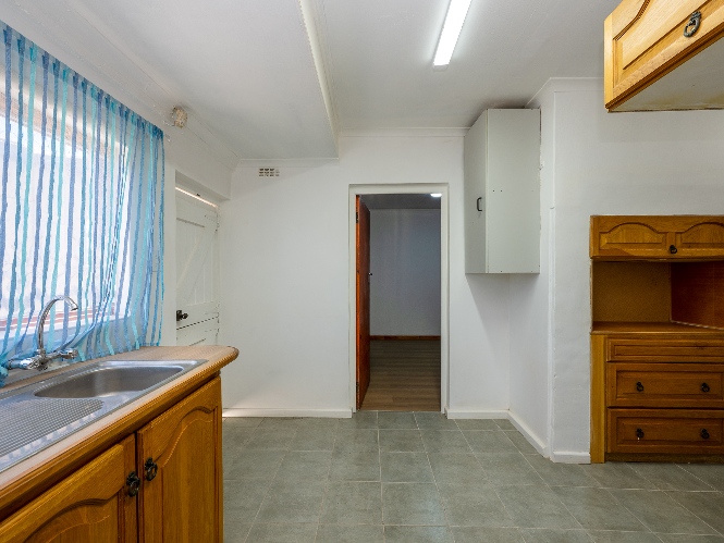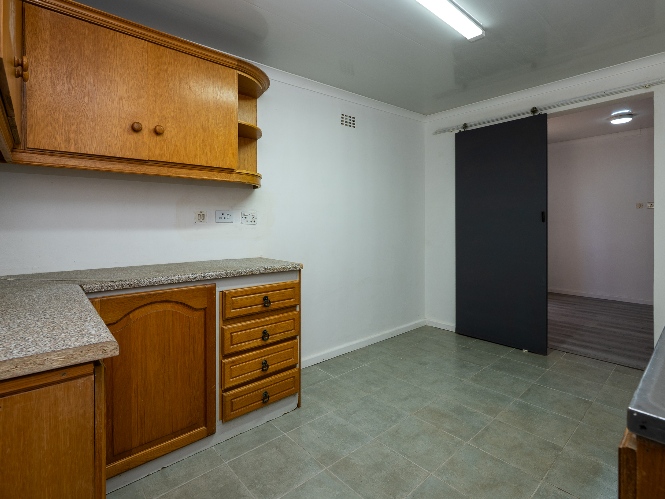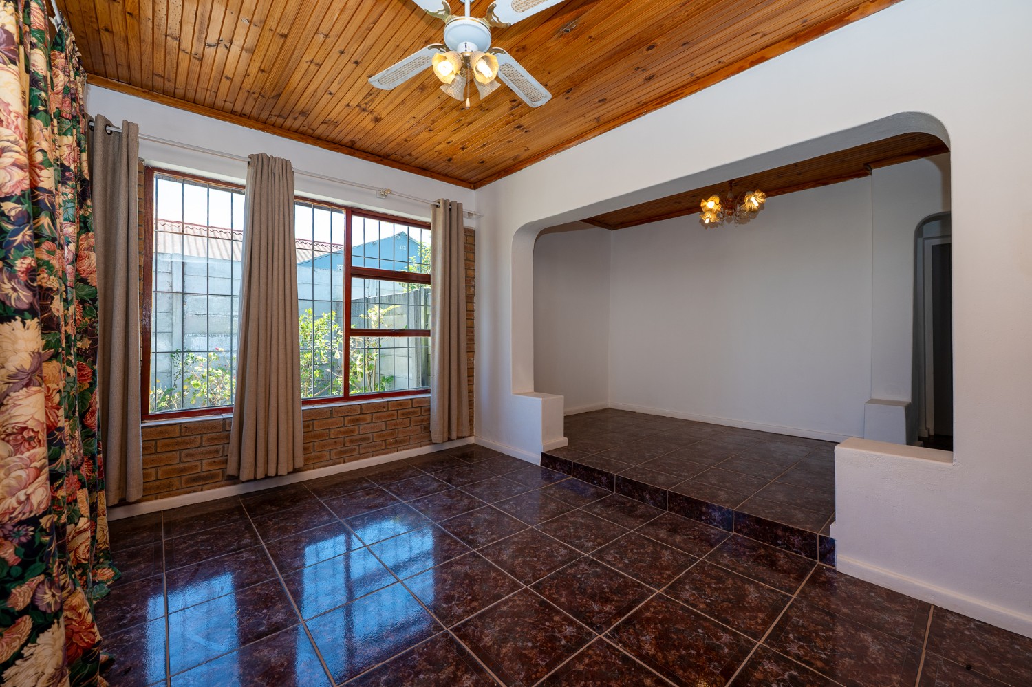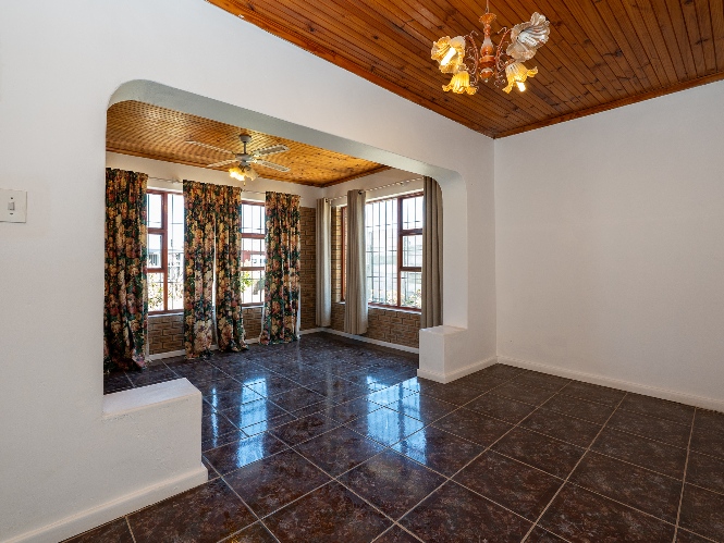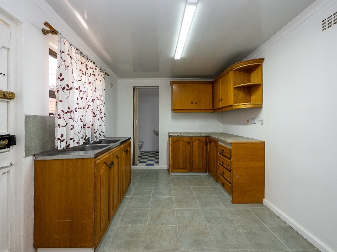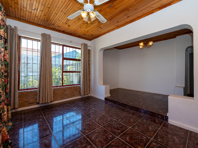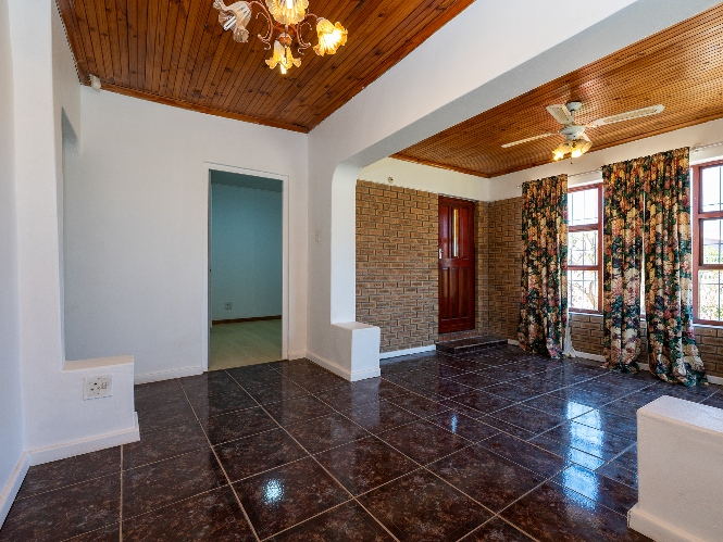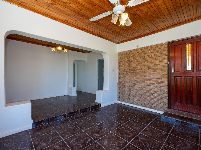 Inside, the home presents a spacious living room fitted with wooden ceilings and a ceiling fan, creating an inviting space for everyday relaxation. In addition, there is an additional space off the lounge, the perfect space for a dining room table. The functional kitchen offers ample room for meal preparation, making it ideal for busy households.