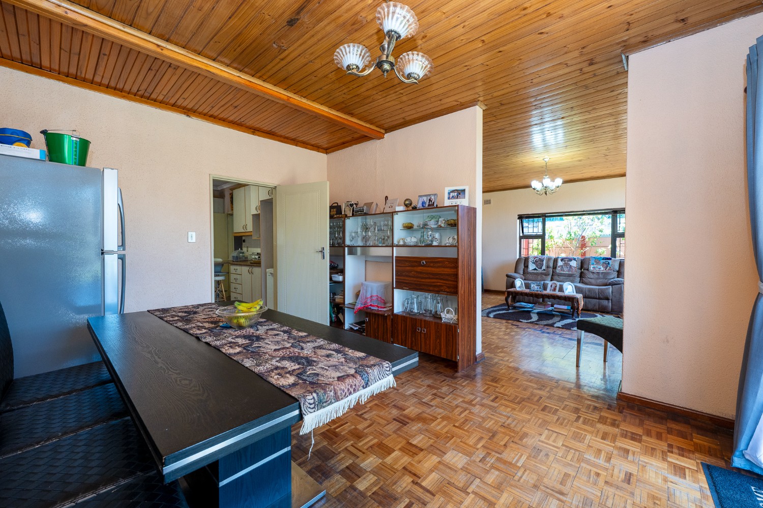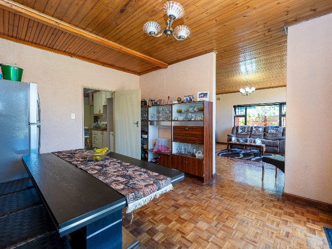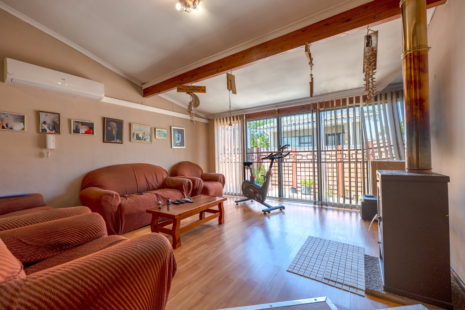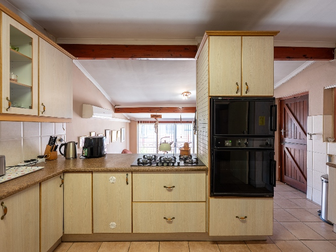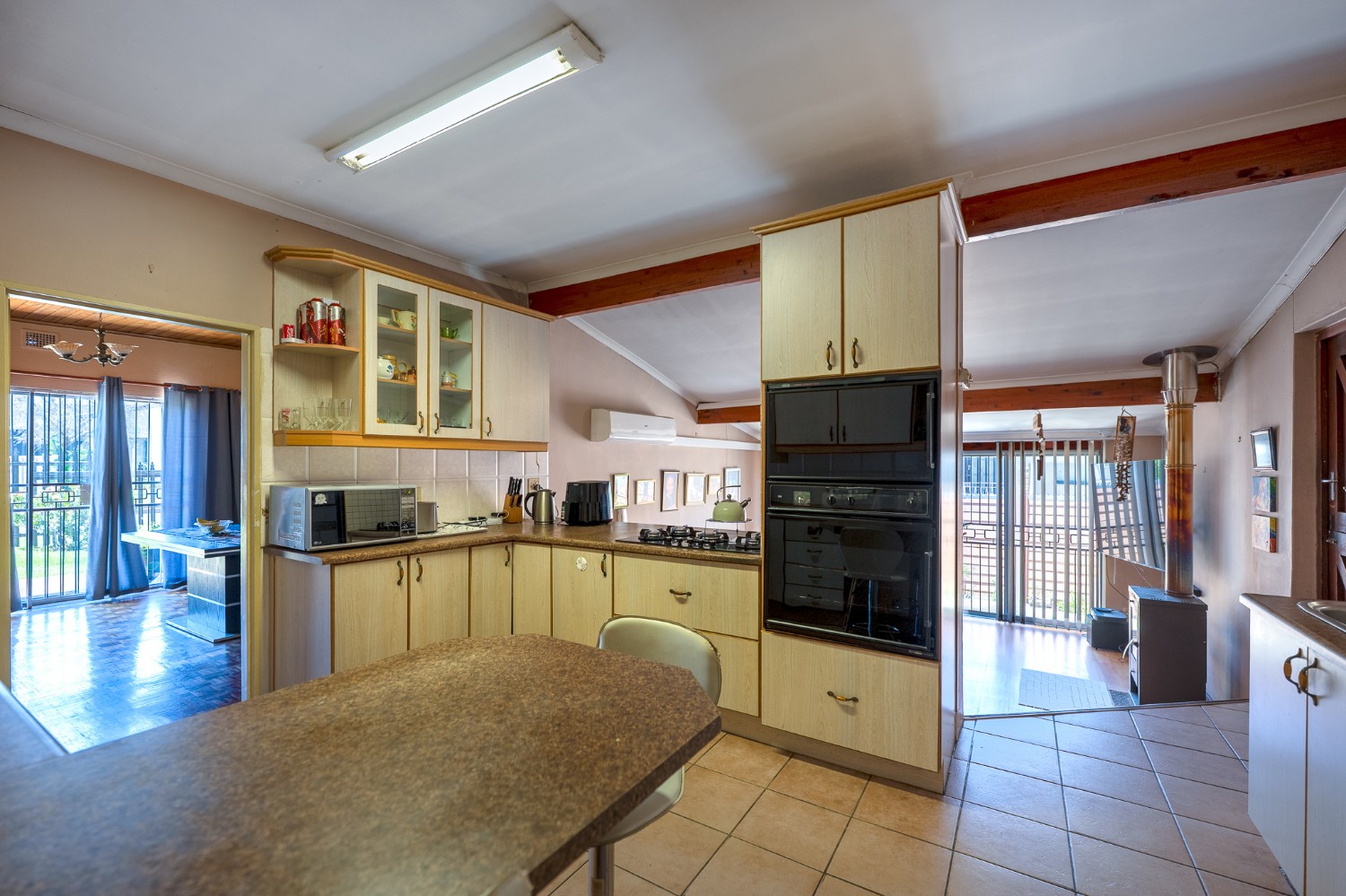 As you step inside, you are welcomed by a warm and inviting lounge with charming wooden ceilings and large windows that allow plenty of natural sunlight to flow in. The dedicated dining room is perfect for family meals and entertaining. The well-appointed kitchen features ample built-in cupboards, an eye-level oven, a gas stovetop, and generous counter space for effortless meal preparation. A separate TV room with a cosy fireplace provides the ideal spot for relaxing evenings, and the indoor braai area makes year-round entertaining an absolute pleasure.