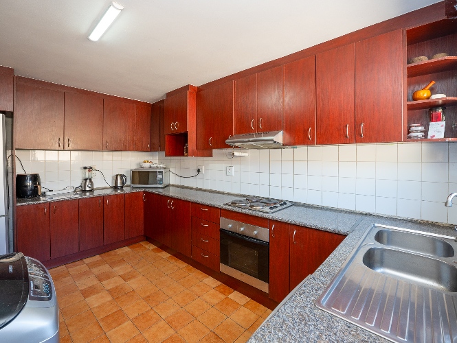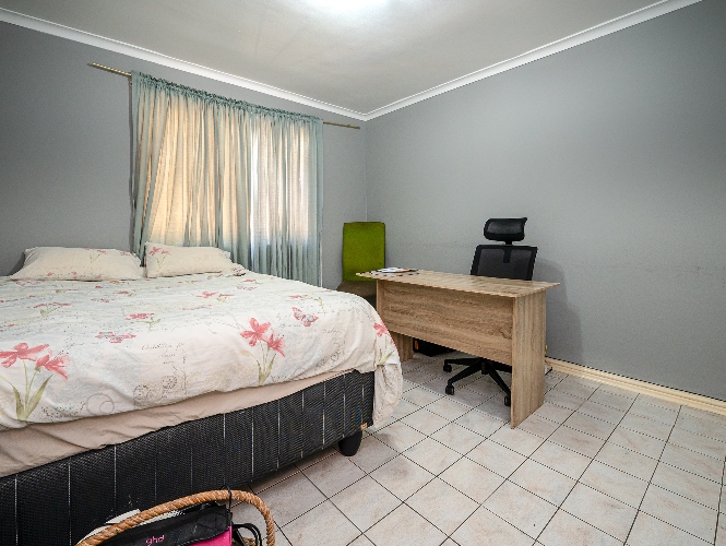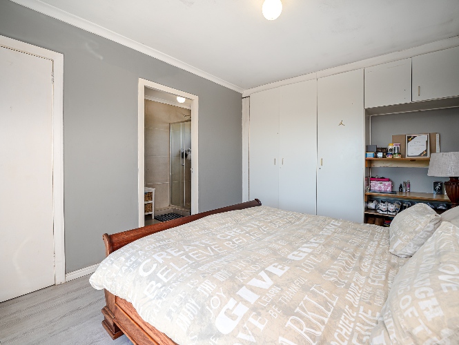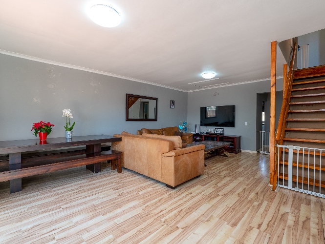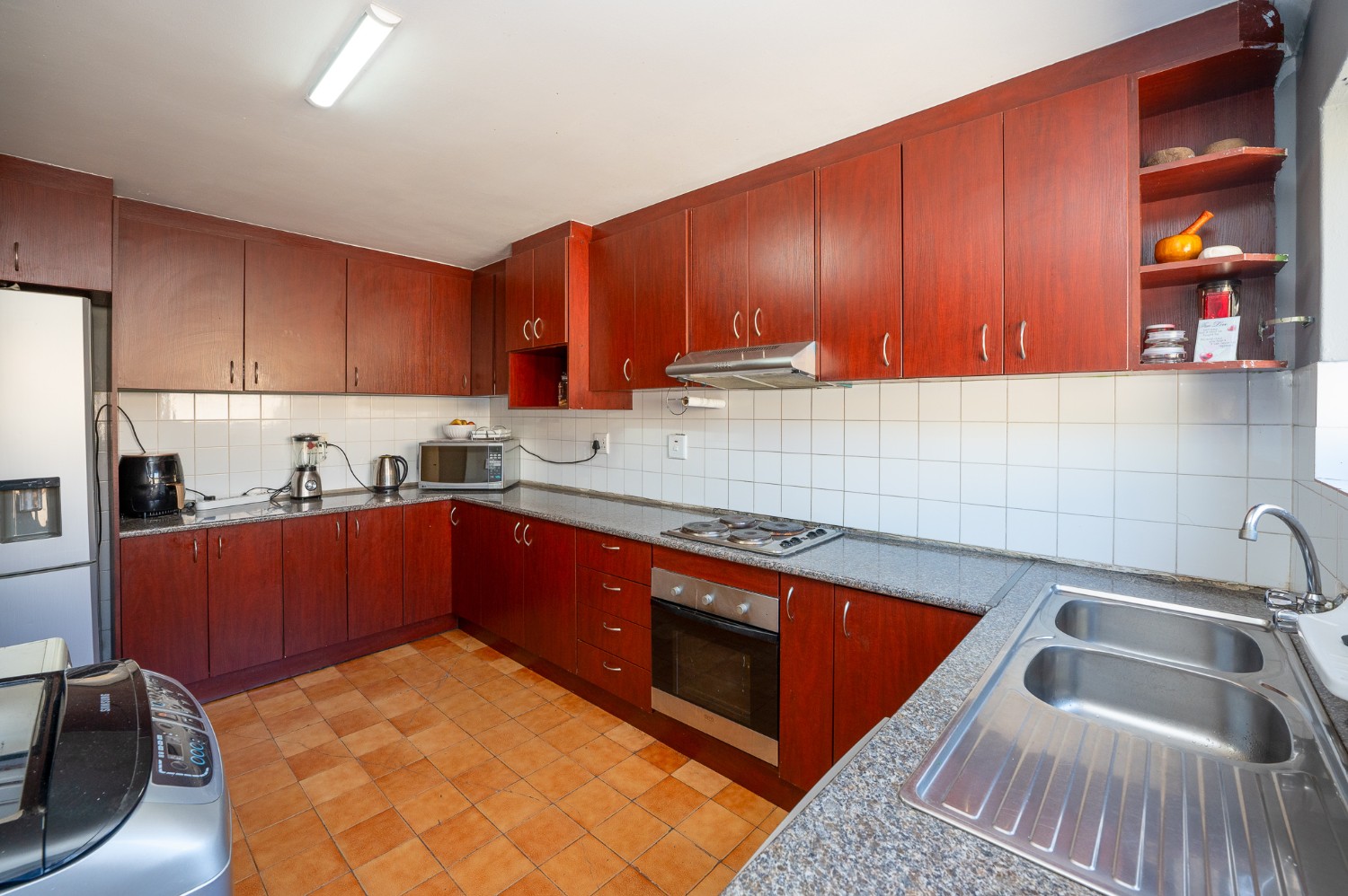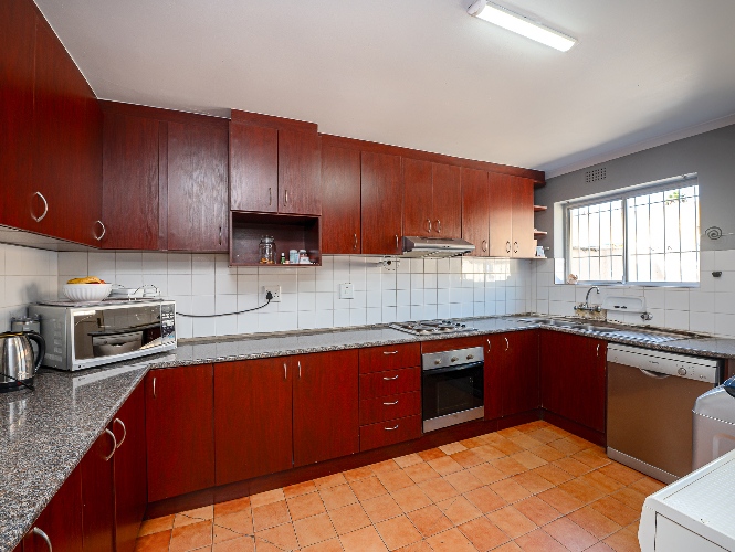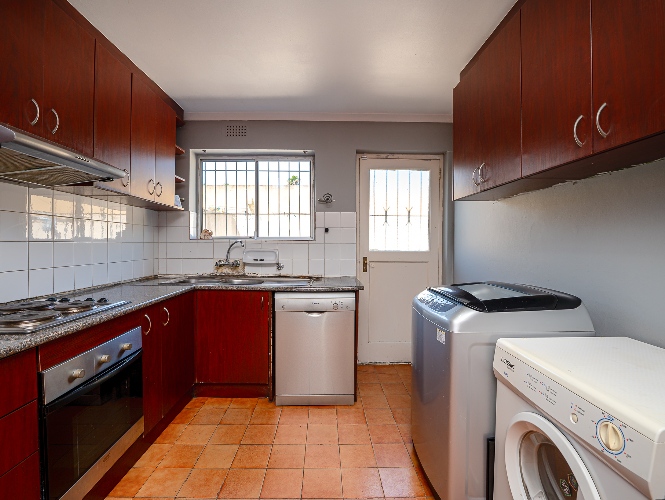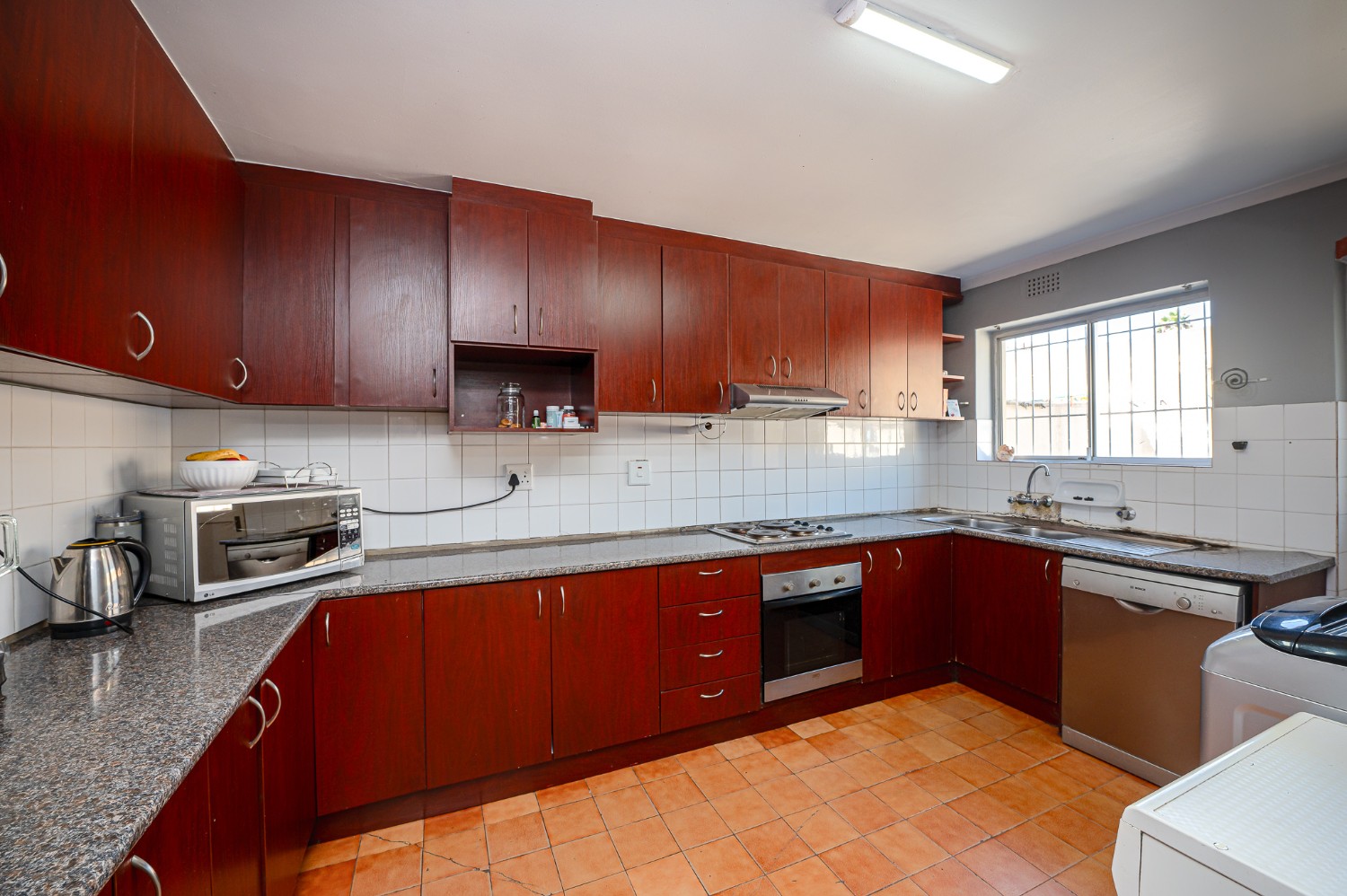 Once inside, you will find the spacious lounge and dining room with beautiful flooring, an air-conditioning unit, and a sliding door opening up to the outdoor braai area. The expansive kitchen features dark wood cupboards, a gas stove top and oven, a plumbing point, and space for a fridge.