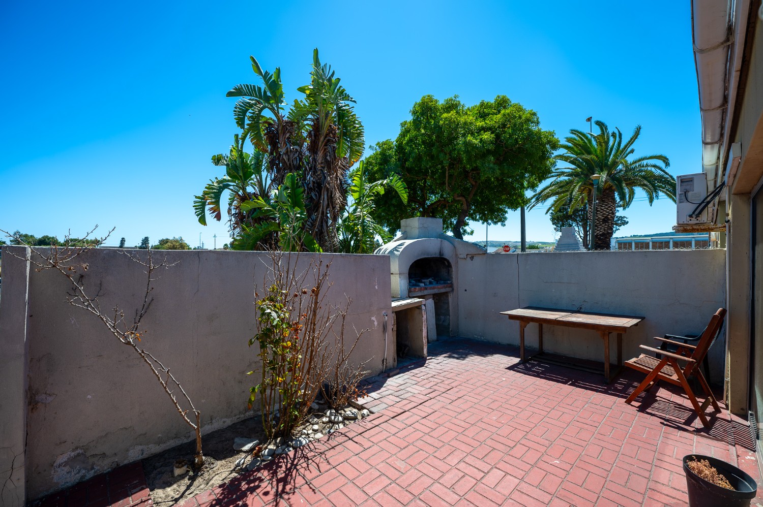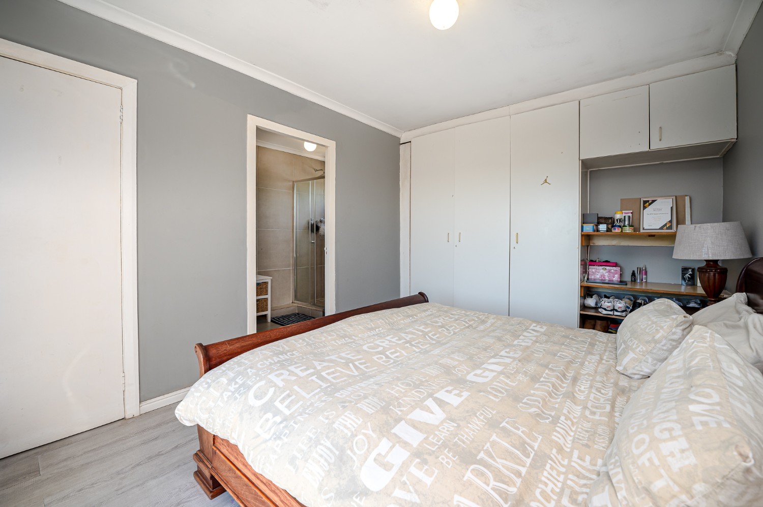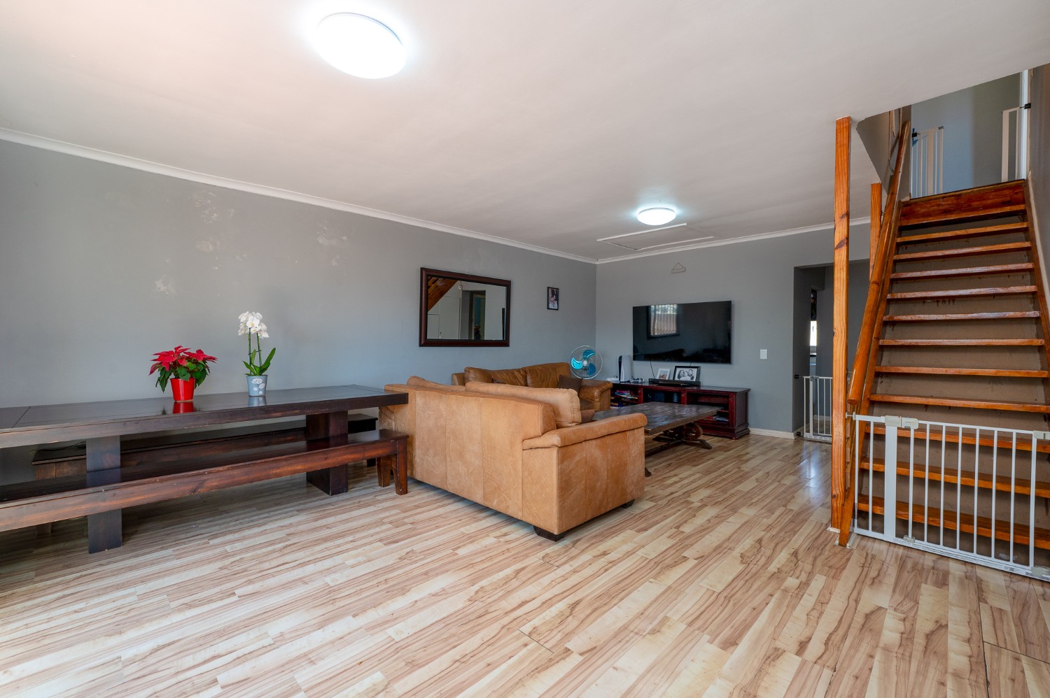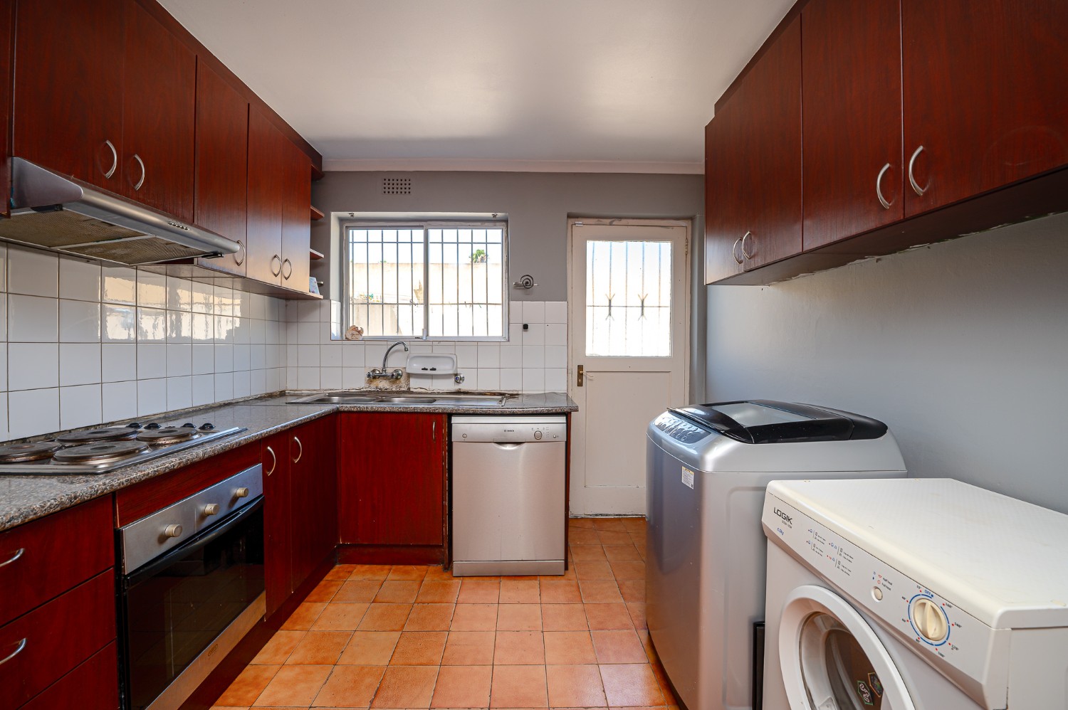 Once inside, you will find the spacious lounge and dining room with beautiful flooring, an air-conditioning unit, and a sliding door opening up to the outdoor braai area. The expansive kitchen features dark wood cupboards, a gas stove top and oven, a plumbing point, and space for a fridge.