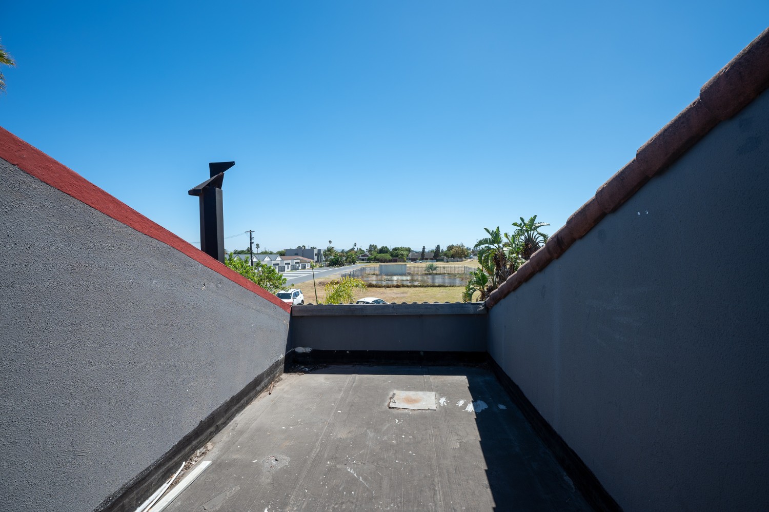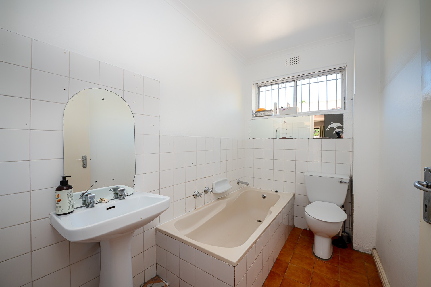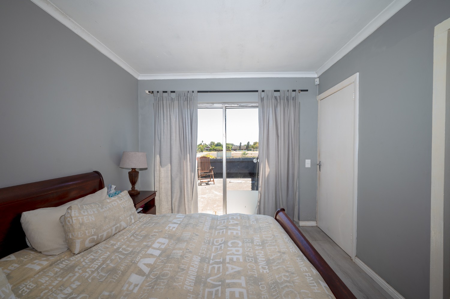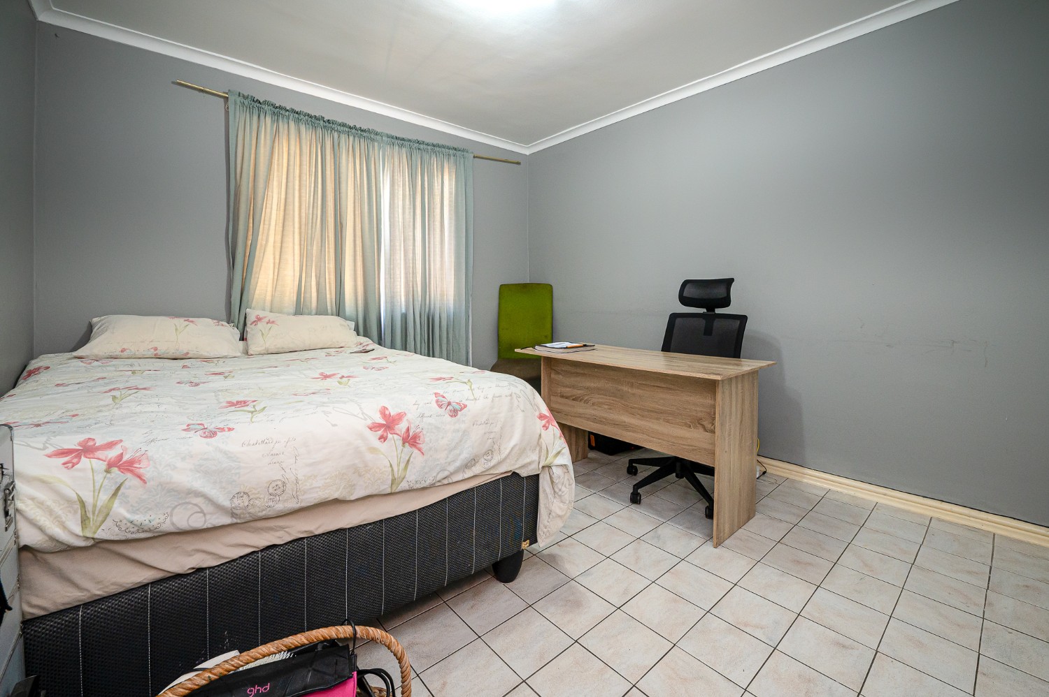 Once inside, you will find the spacious lounge and dining room with beautiful flooring, an air-conditioning unit, and a sliding door opening up to the outdoor braai area. The expansive kitchen features dark wood cupboards, a gas stove top and oven, a plumbing point, and space for a fridge.