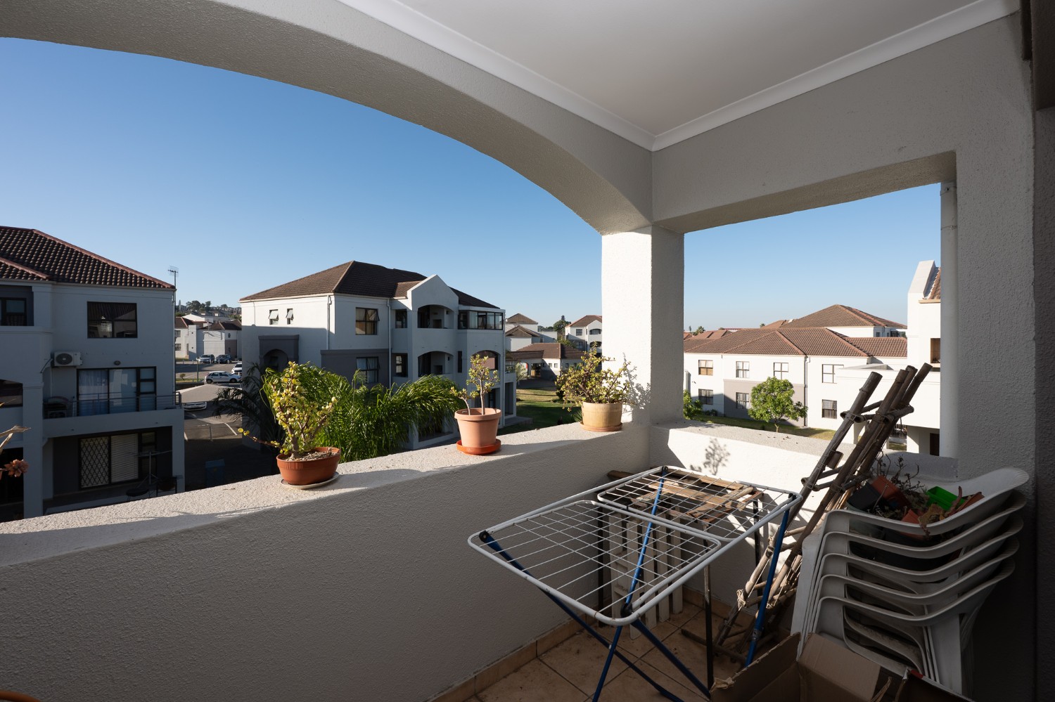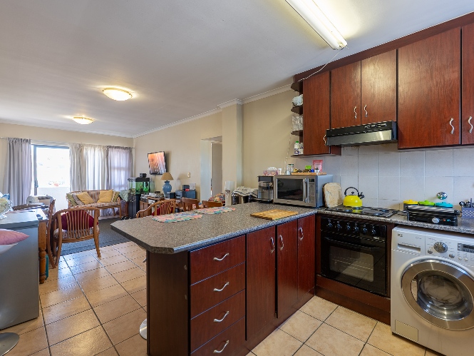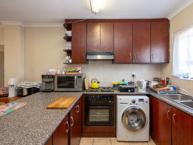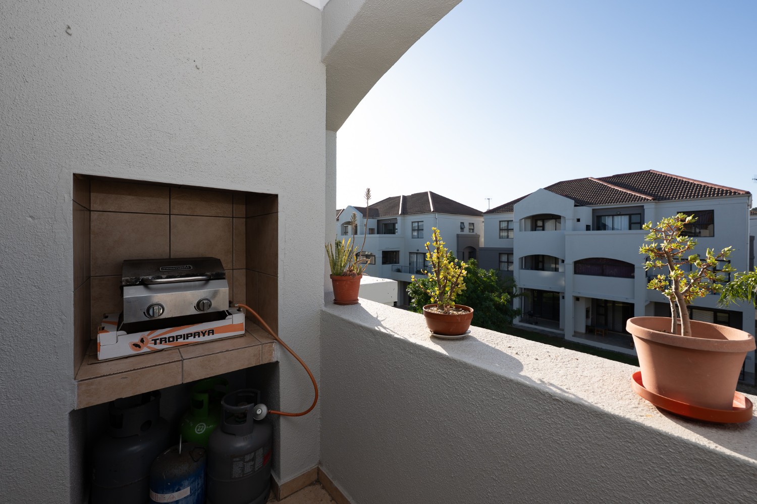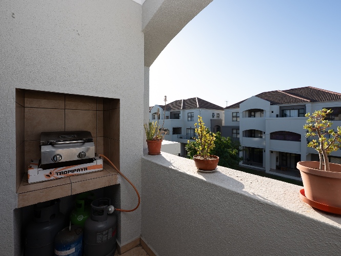 The apartment welcomes you with a spacious open-plan lounge featuring tiled flooring and a door that opens onto a private balcony fitted with a built-in braai, perfect for entertaining or relaxing outdoors. The kitchen is well-designed and equipped with built-in cupboards, an under-counter oven and hob, a double sink and a plumbing point for added practicality.