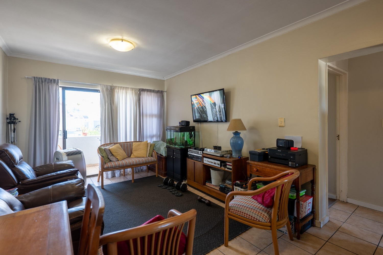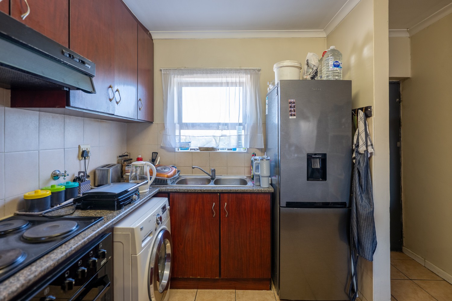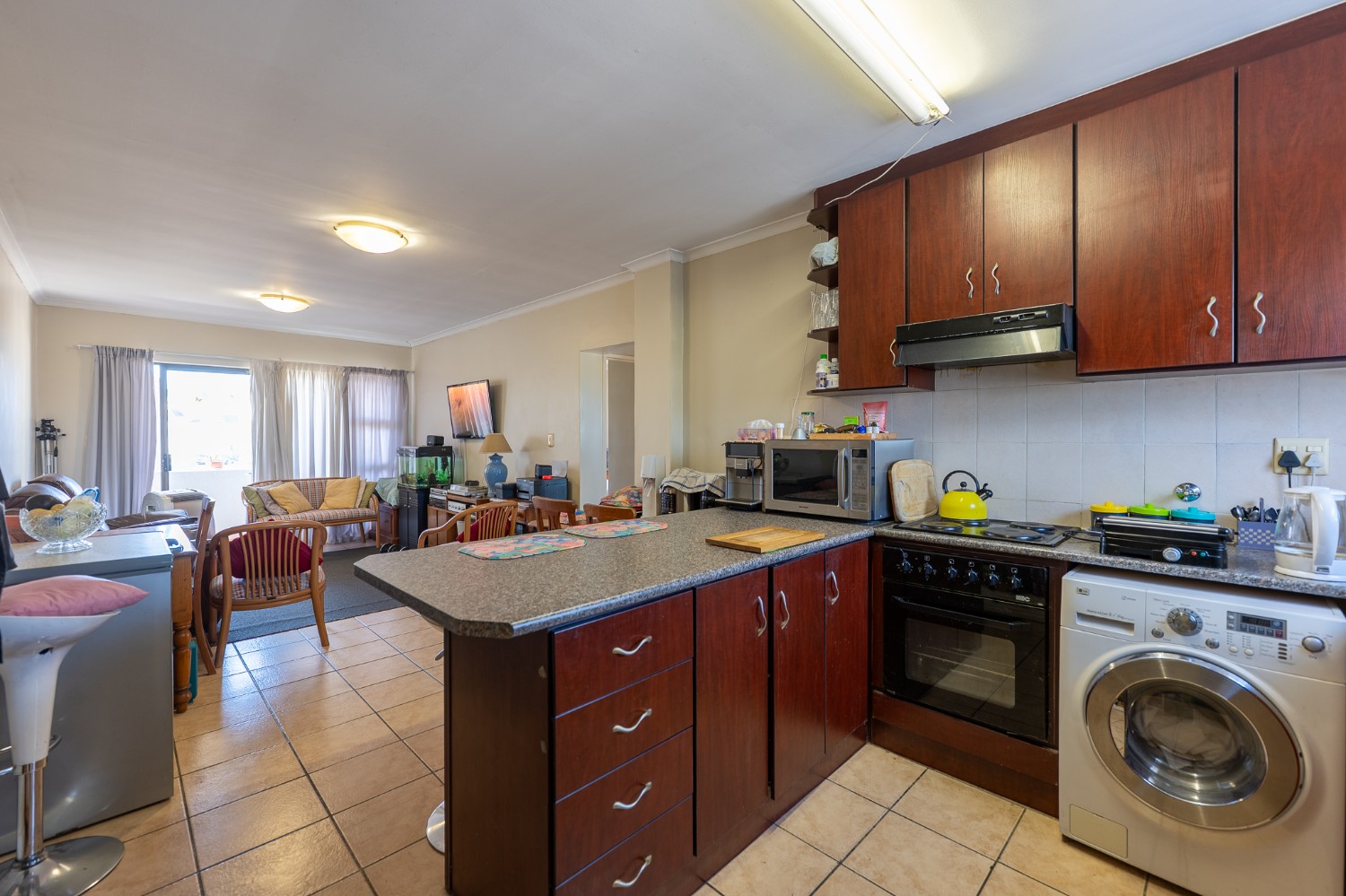 The apartment welcomes you with a spacious open-plan lounge featuring tiled flooring and a door that opens onto a private balcony fitted with a built-in braai, perfect for entertaining or relaxing outdoors. The kitchen is well-designed and equipped with built-in cupboards, an under-counter oven and hob, a double sink and a plumbing point for added practicality.