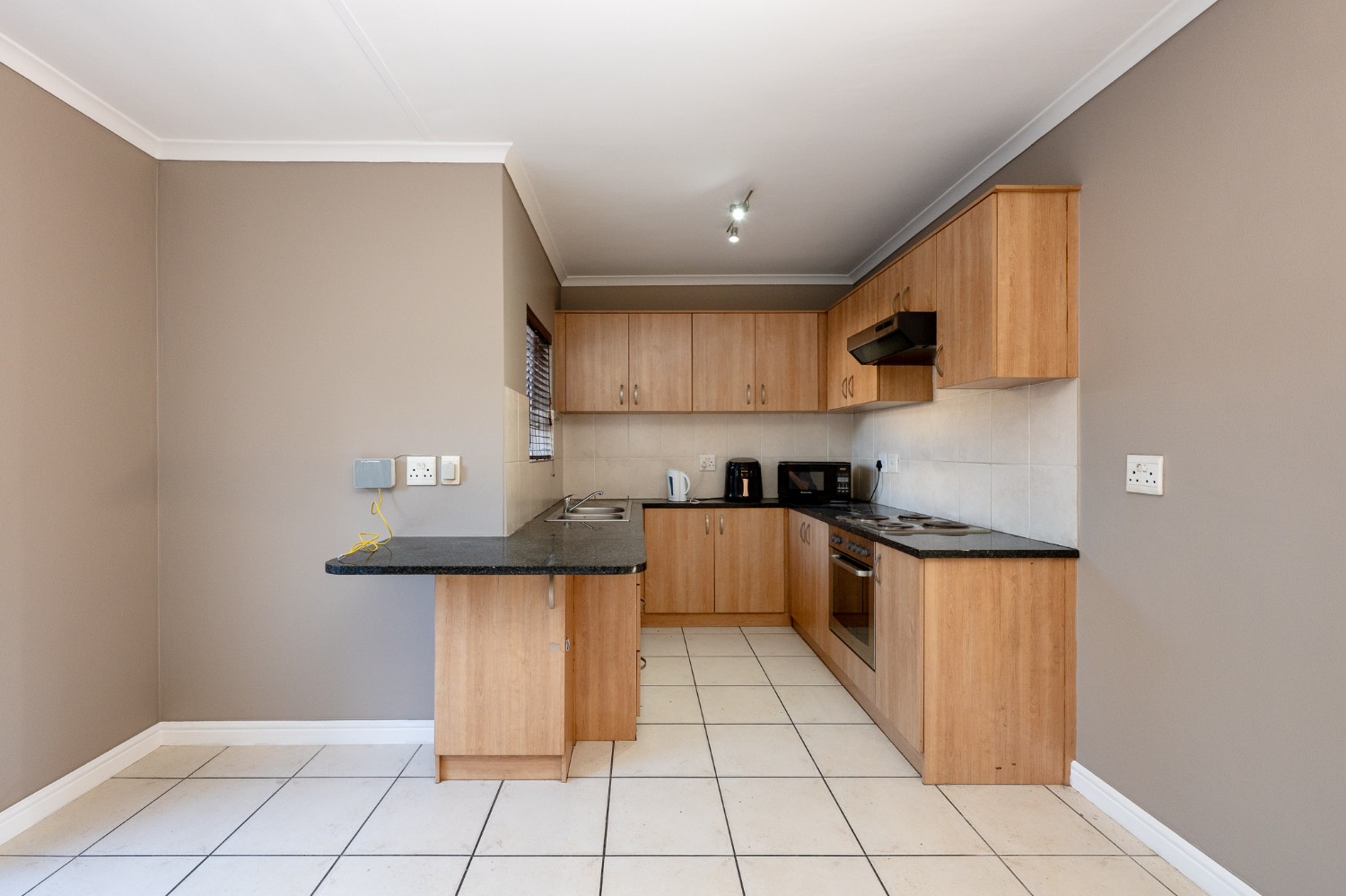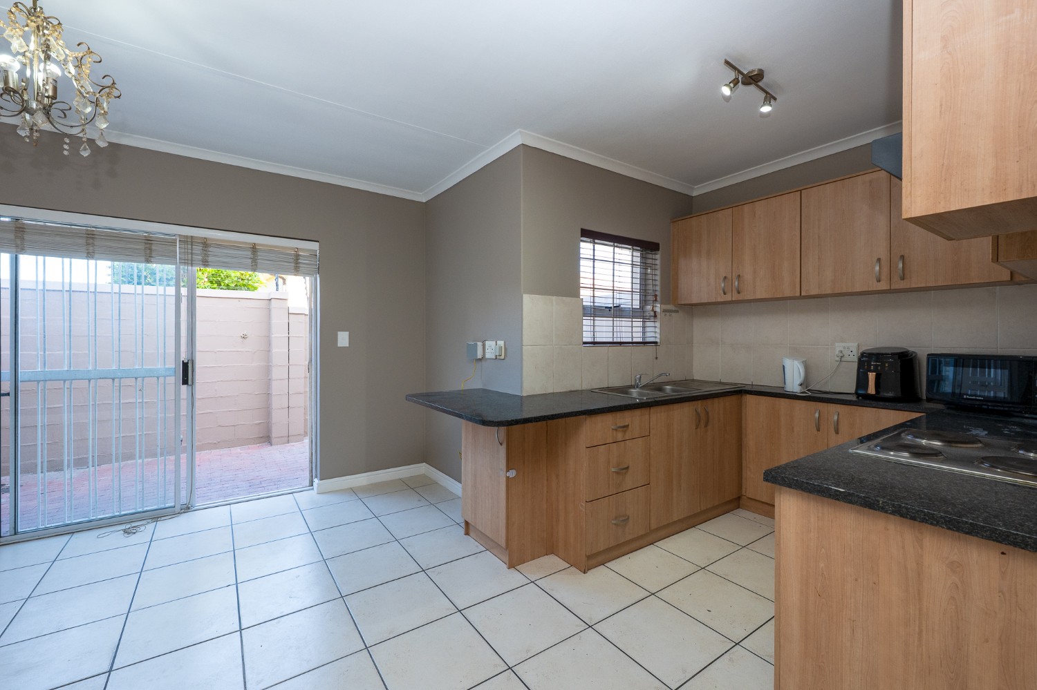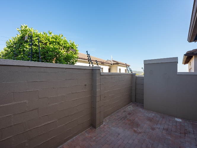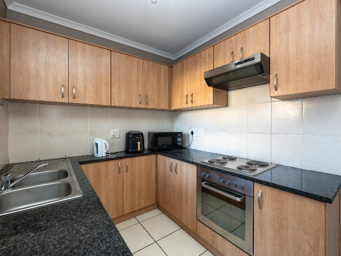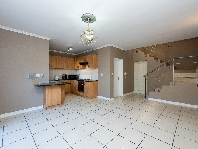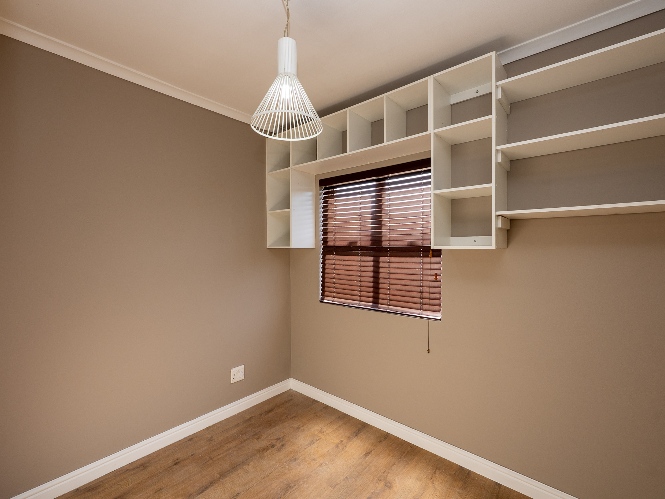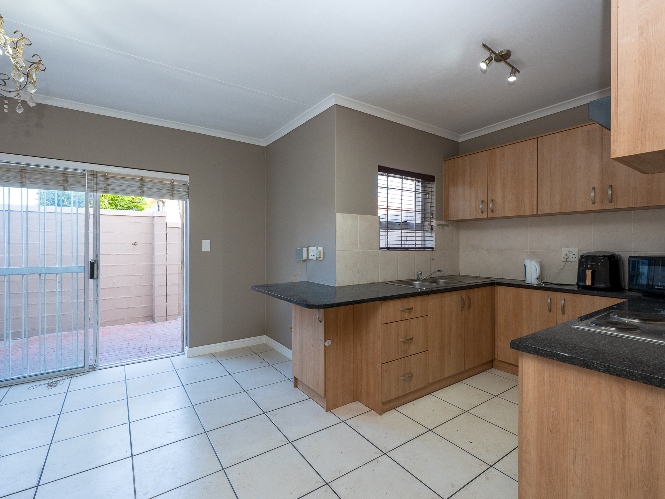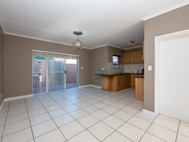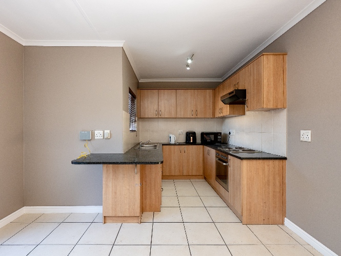 The spacious open-plan lounge and kitchen create a welcoming and functional living space. The lounge features a sliding door that opens up to the private backyard, complete with a built-in braai, ideal for entertaining family and friends. The modern kitchen is fitted with ample built-in cupboards, an under-counter oven and hob, granite countertops, and space for a fridge, providing both style and practicality for everyday living.