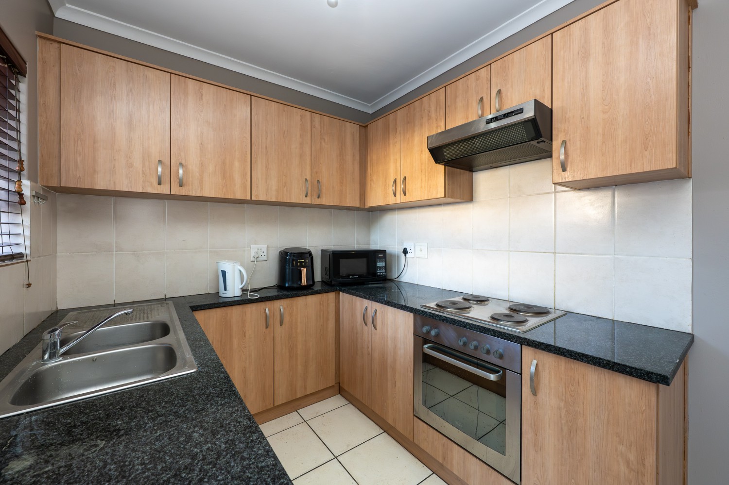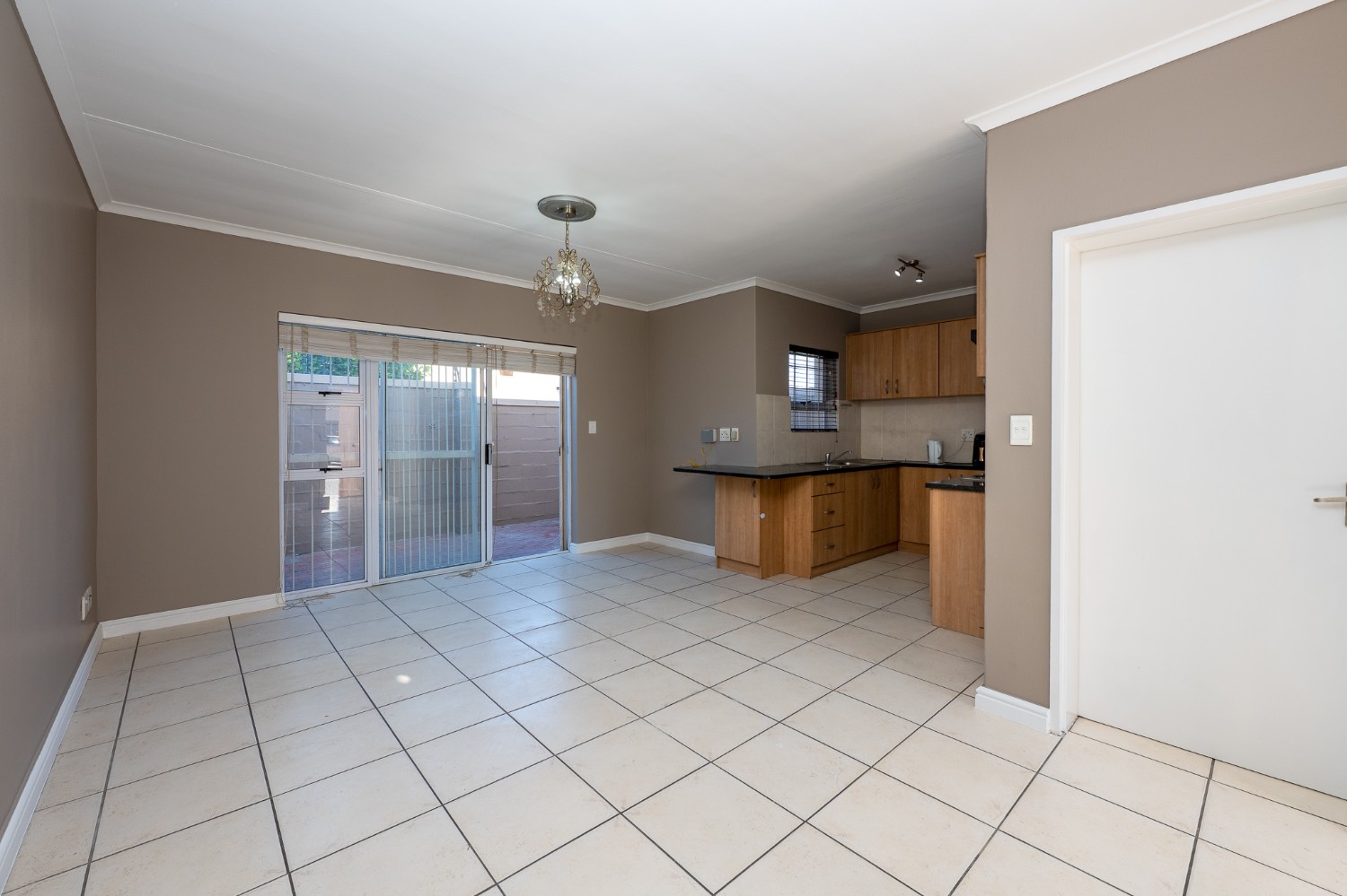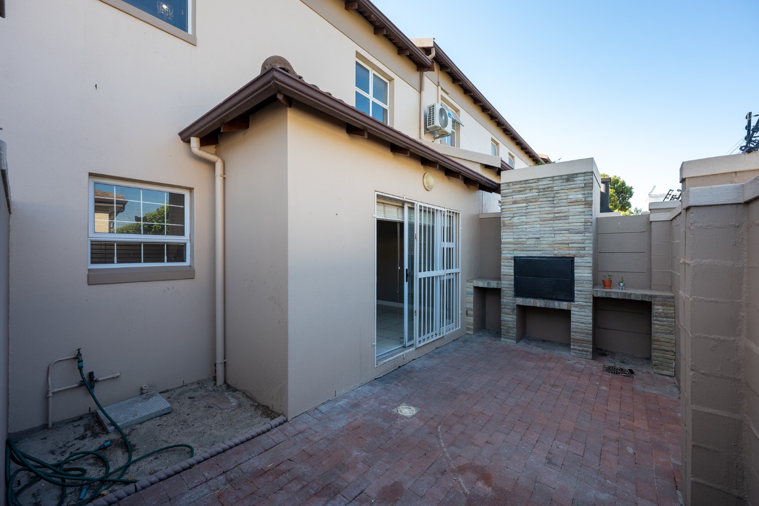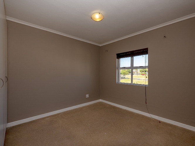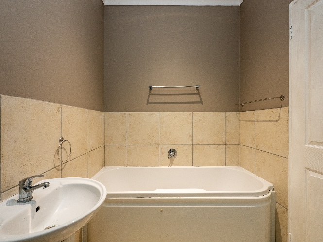 The spacious open-plan lounge and kitchen create a welcoming and functional living space. The lounge features a sliding door that opens up to the private backyard, complete with a built-in braai, ideal for entertaining family and friends. The modern kitchen is fitted with ample built-in cupboards, an under-counter oven and hob, granite countertops, and space for a fridge, providing both style and practicality for everyday living.