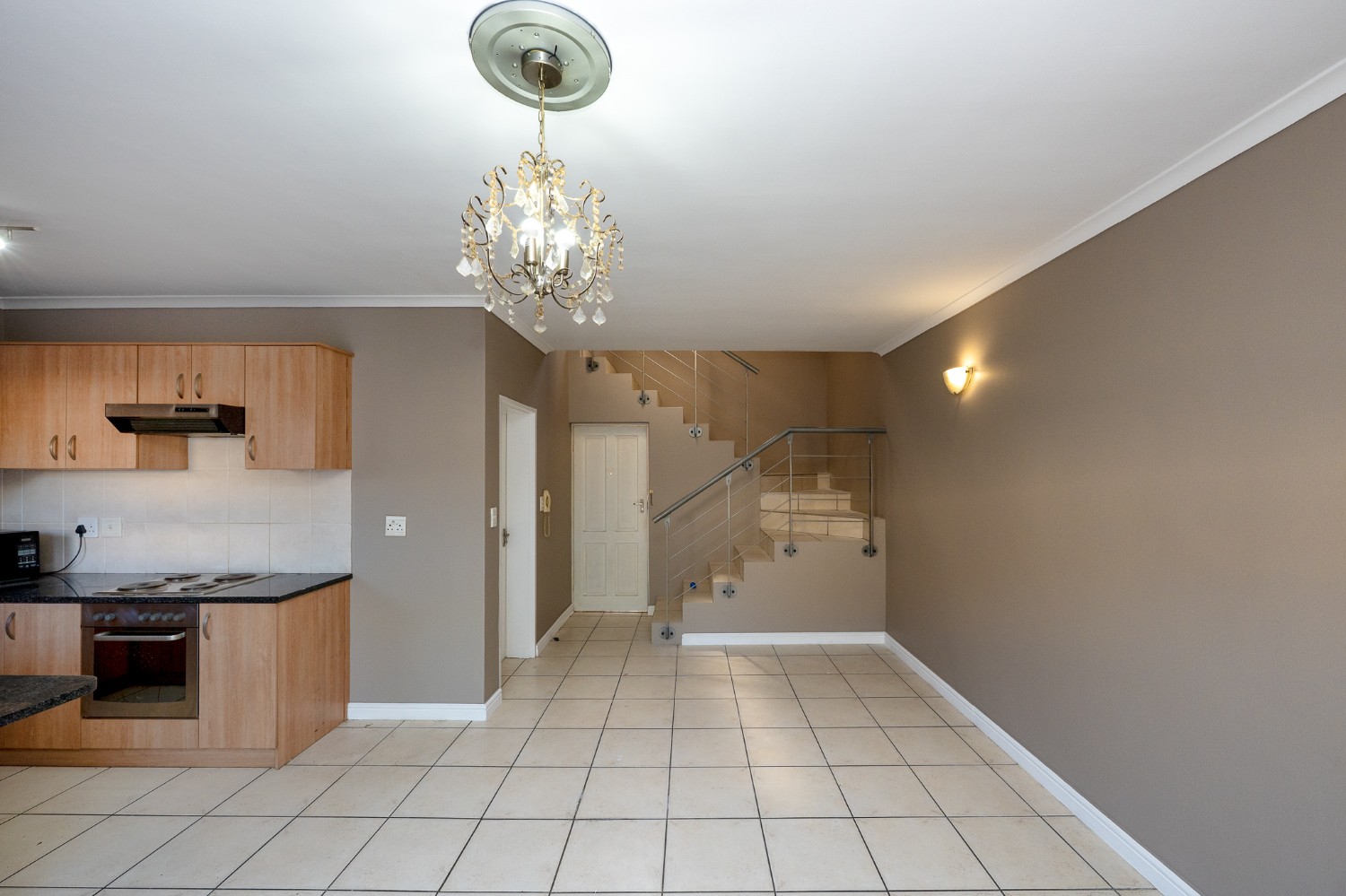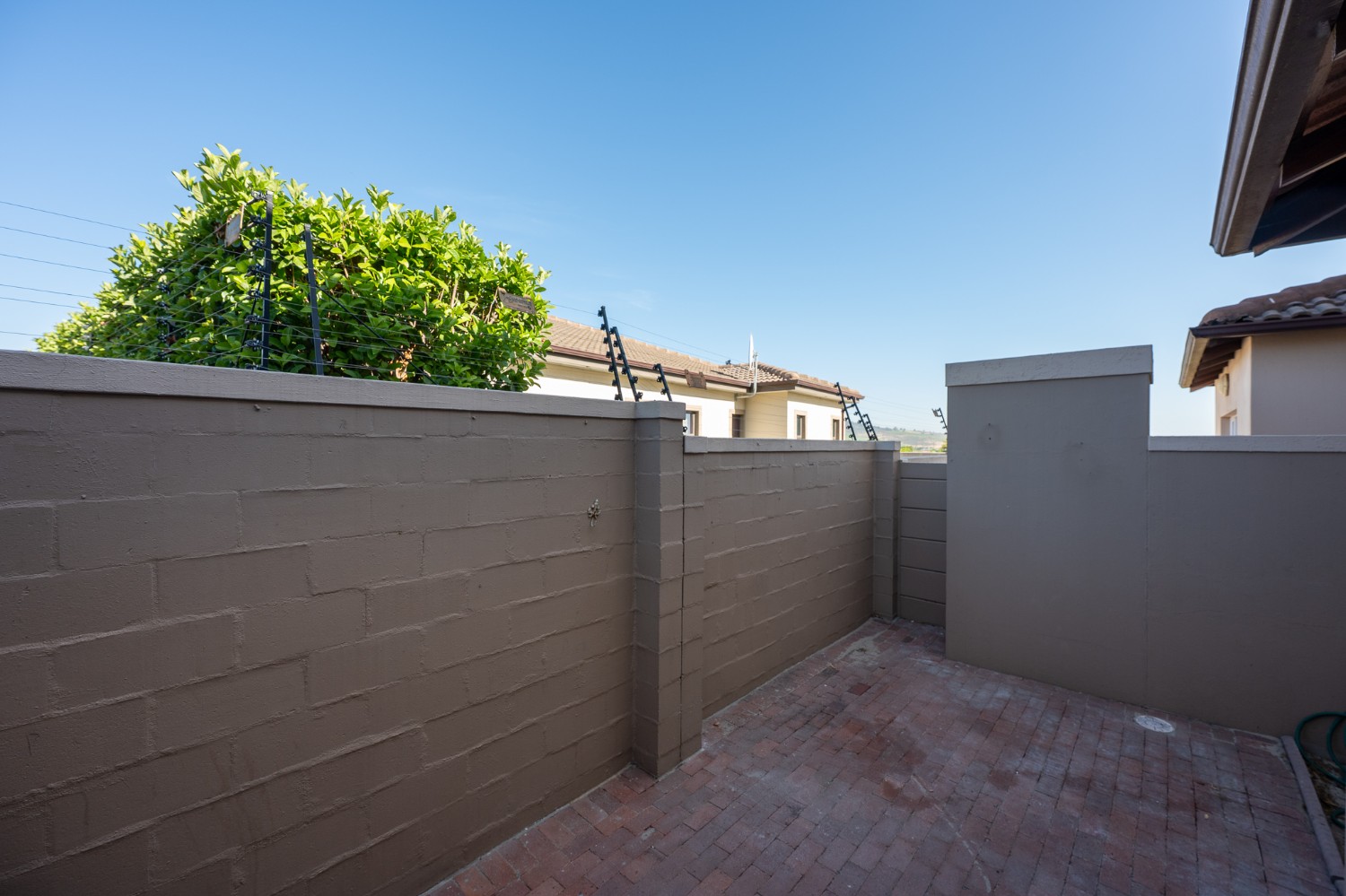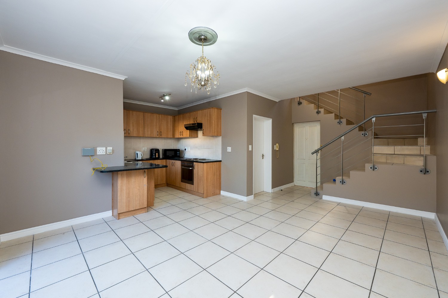 The spacious open-plan lounge and kitchen create a welcoming and functional living space. The lounge features a sliding door that opens up to the private backyard, complete with a built-in braai, ideal for entertaining family and friends. The modern kitchen is fitted with ample built-in cupboards, an under-counter oven and hob, granite countertops, and space for a fridge, providing both style and practicality for everyday living.