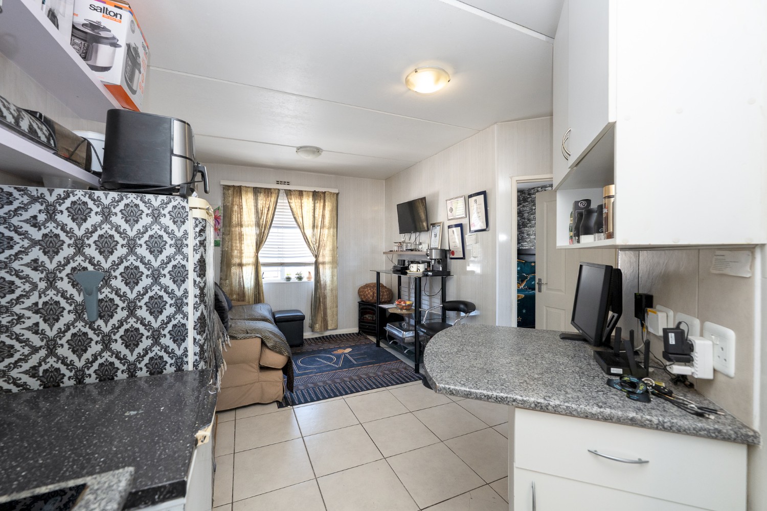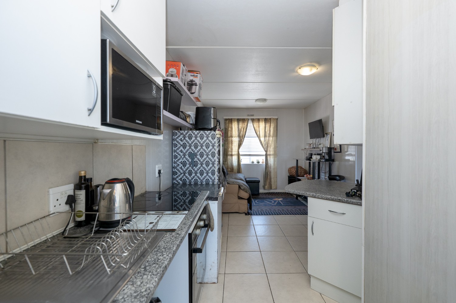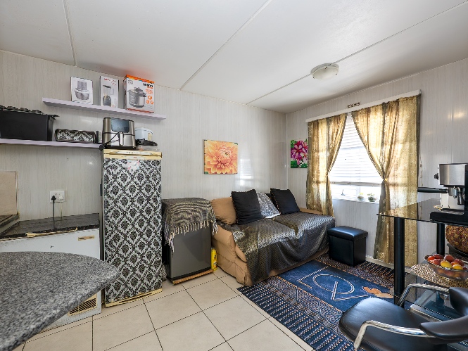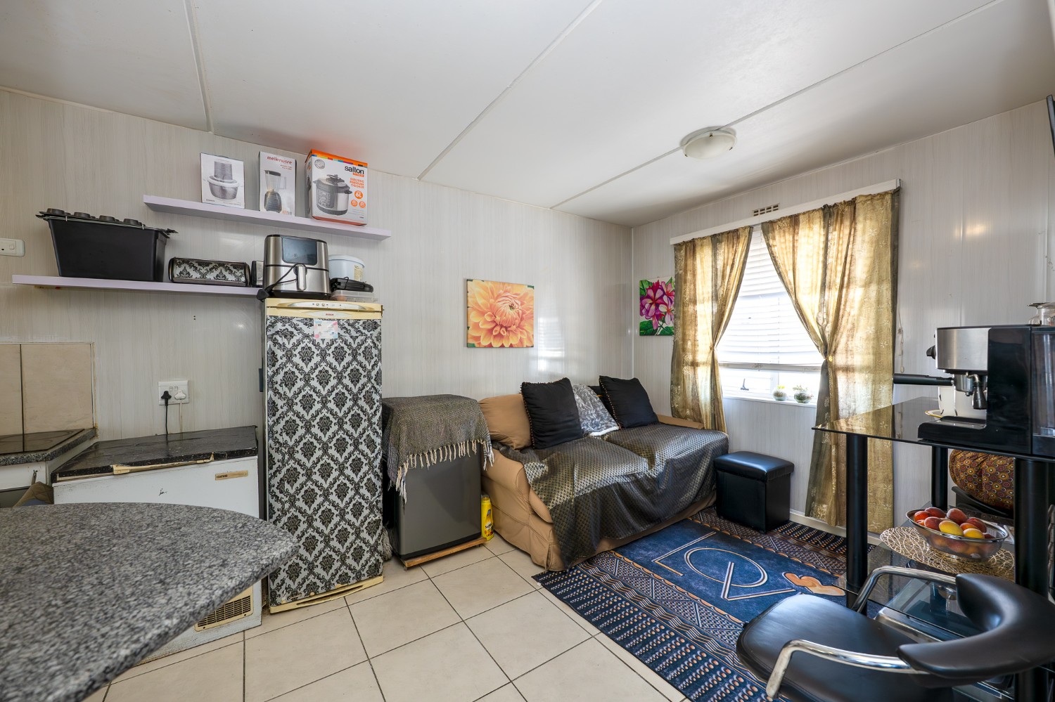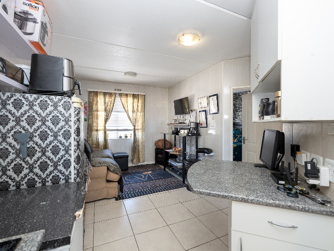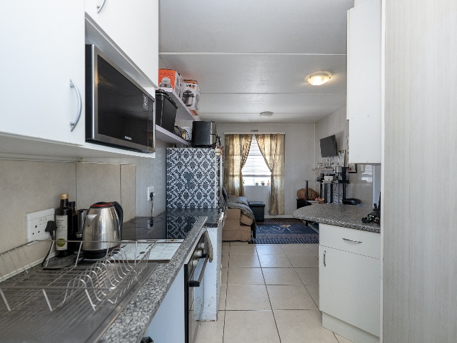 Step into the well-sized lounge, complete with tiled flooring and a large window that fills the space with natural sunlight, creating a warm and inviting atmosphere. The kitchen is fitted with light wood cupboards, an under-counter oven and hob, a plumbing point, and ample countertop space, perfect for preparing meals with ease.