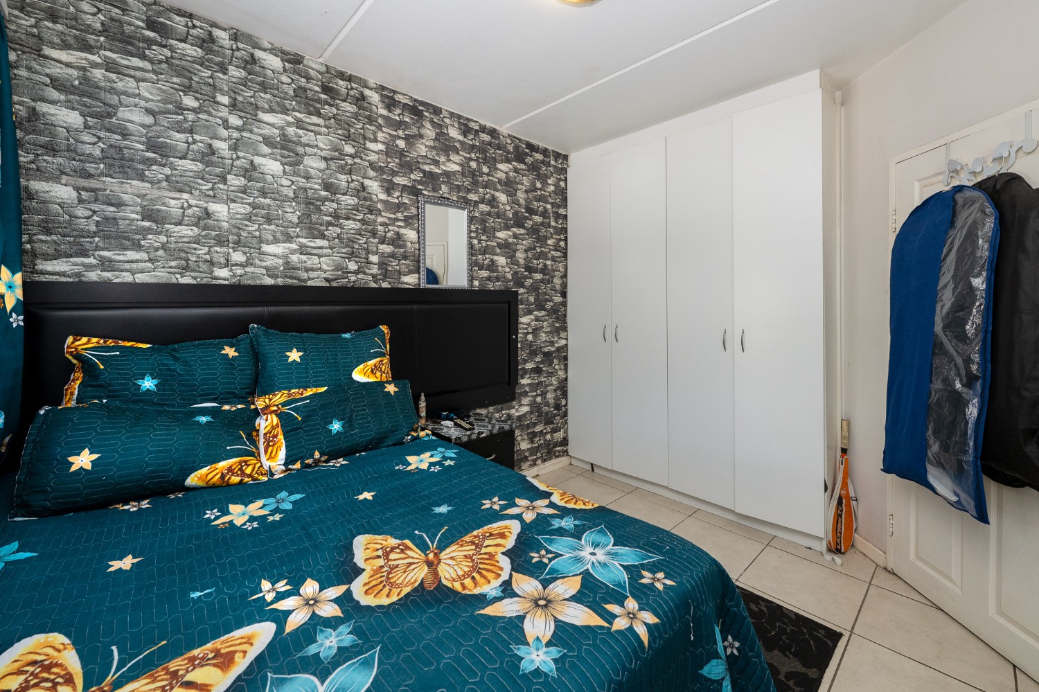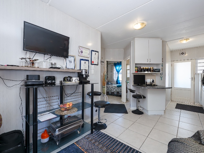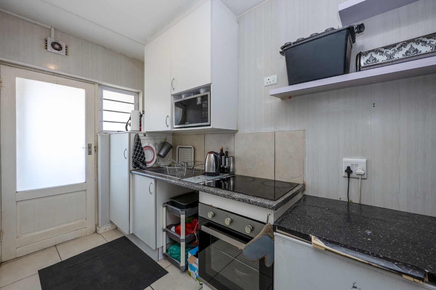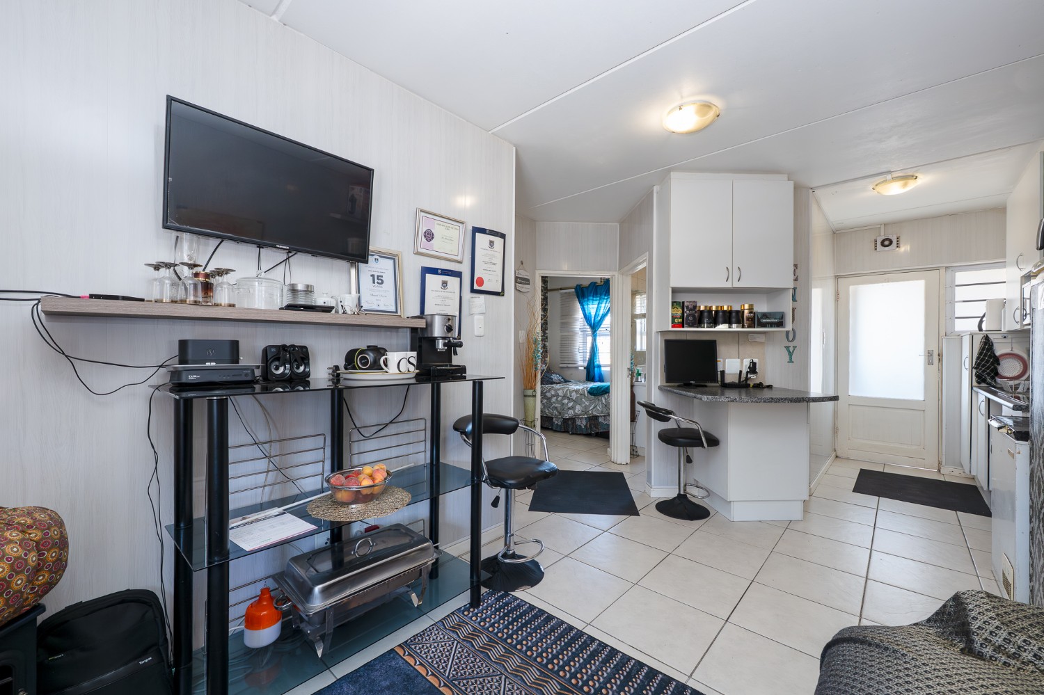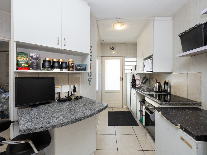 Step into the well-sized lounge, complete with tiled flooring and a large window that fills the space with natural sunlight, creating a warm and inviting atmosphere. The kitchen is fitted with light wood cupboards, an under-counter oven and hob, a plumbing point, and ample countertop space, perfect for preparing meals with ease.