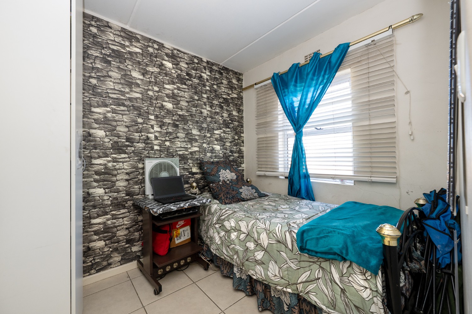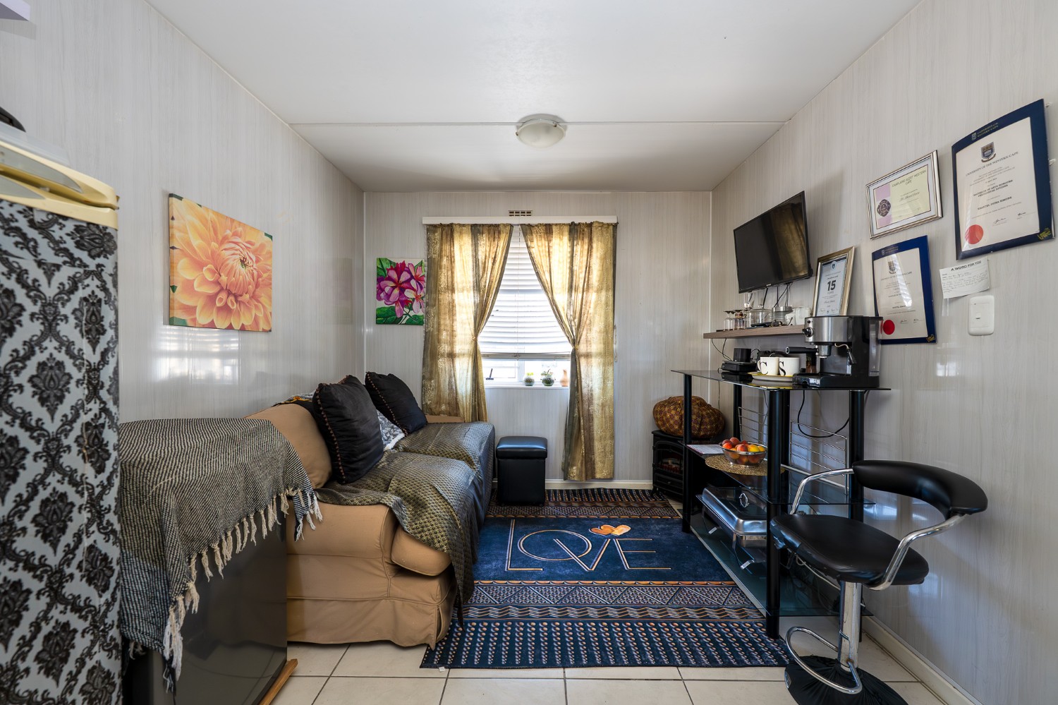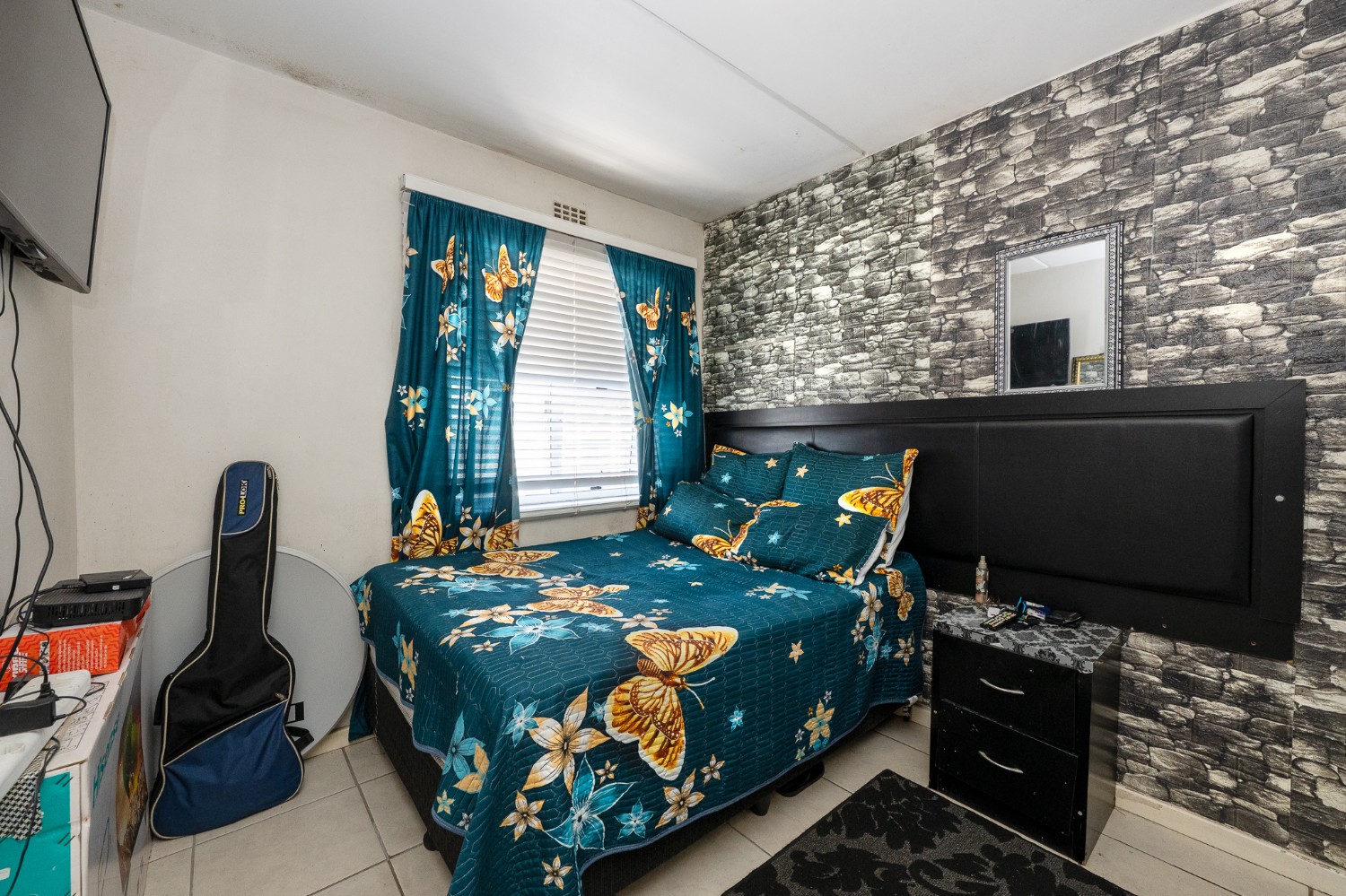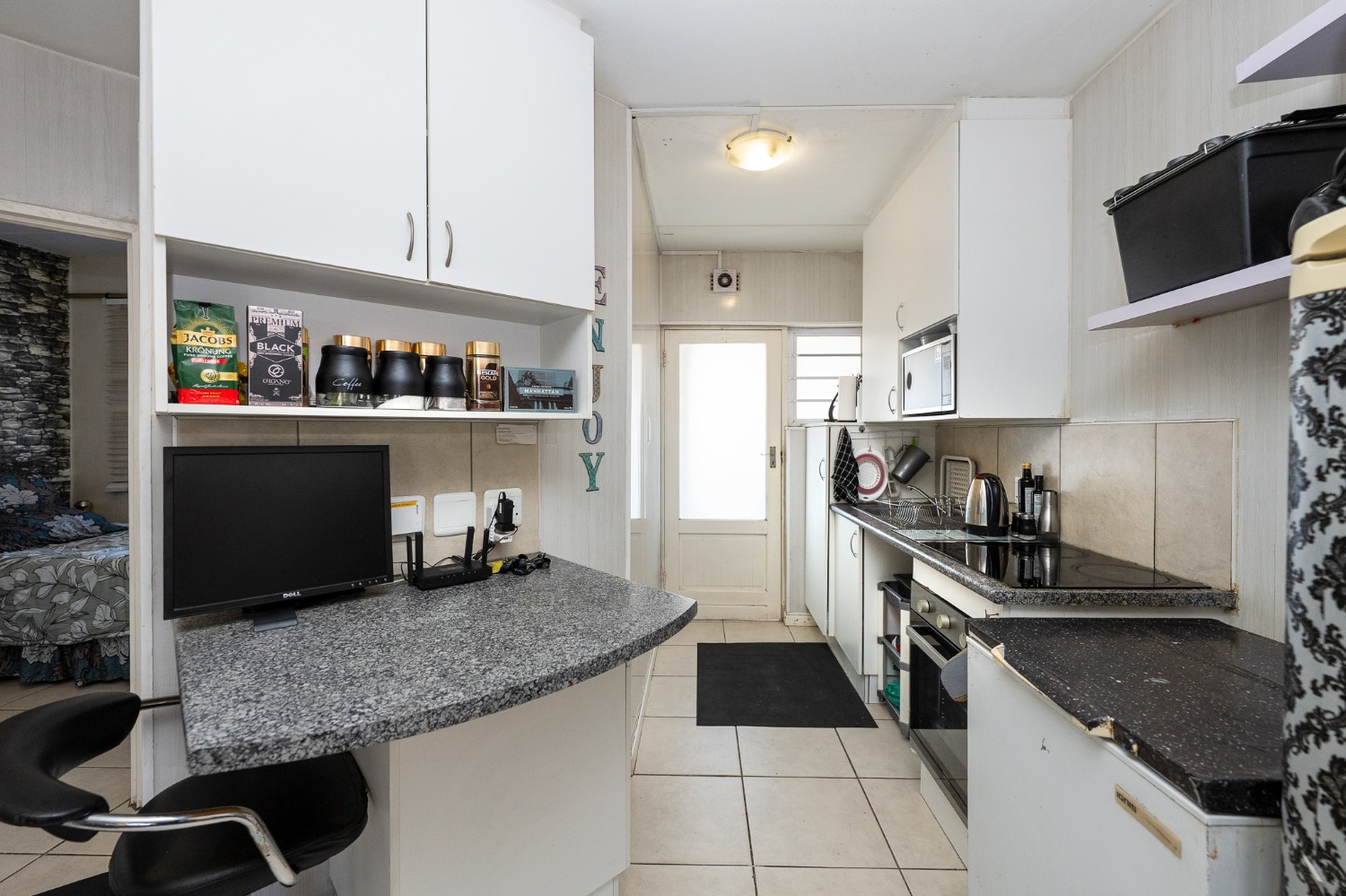 Step into the well-sized lounge, complete with tiled flooring and a large window that fills the space with natural sunlight, creating a warm and inviting atmosphere. The kitchen is fitted with light wood cupboards, an under-counter oven and hob, a plumbing point, and ample countertop space, perfect for preparing meals with ease.