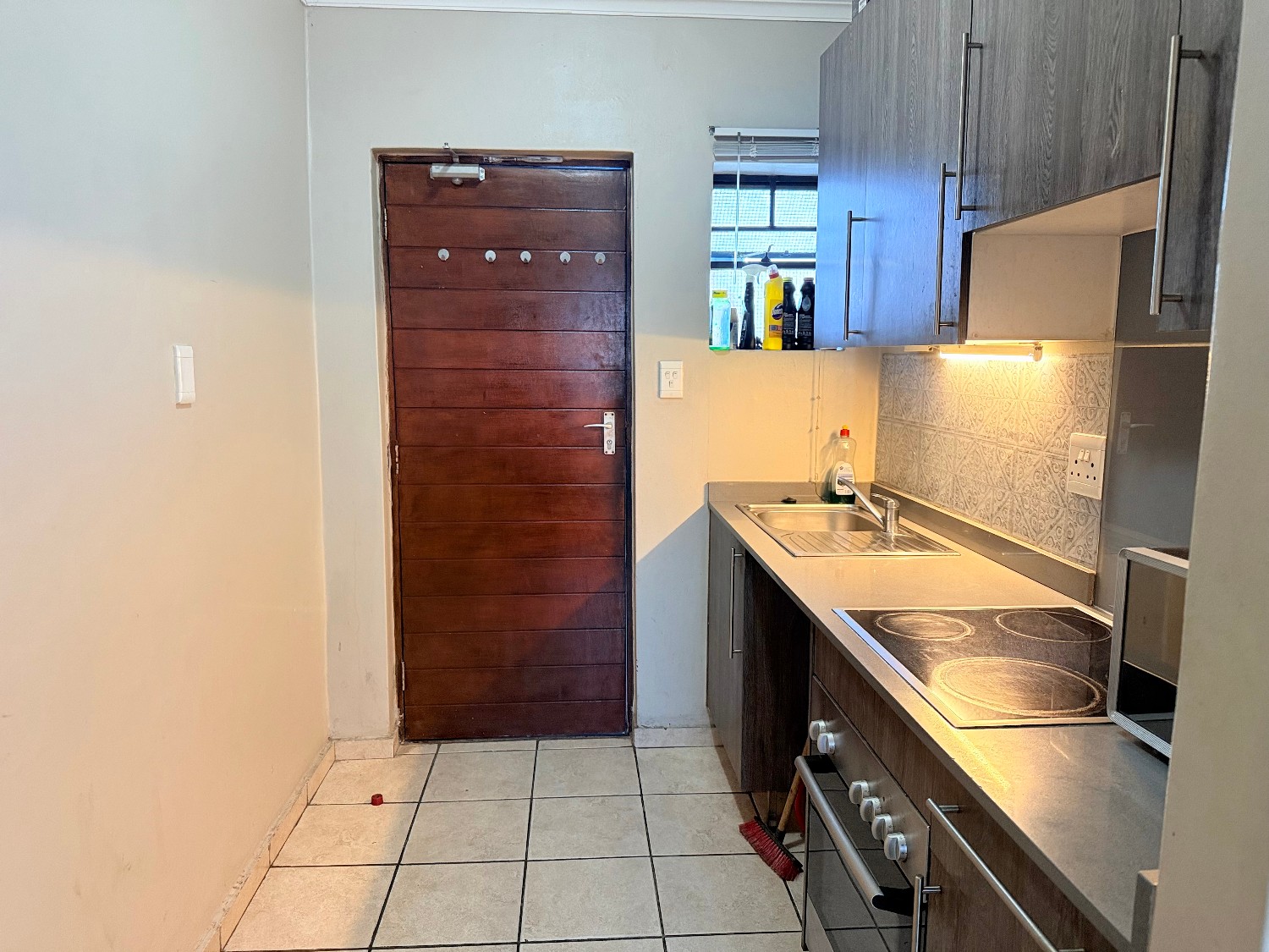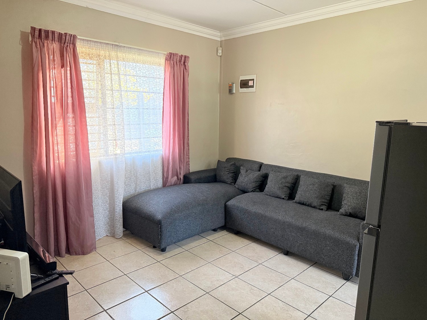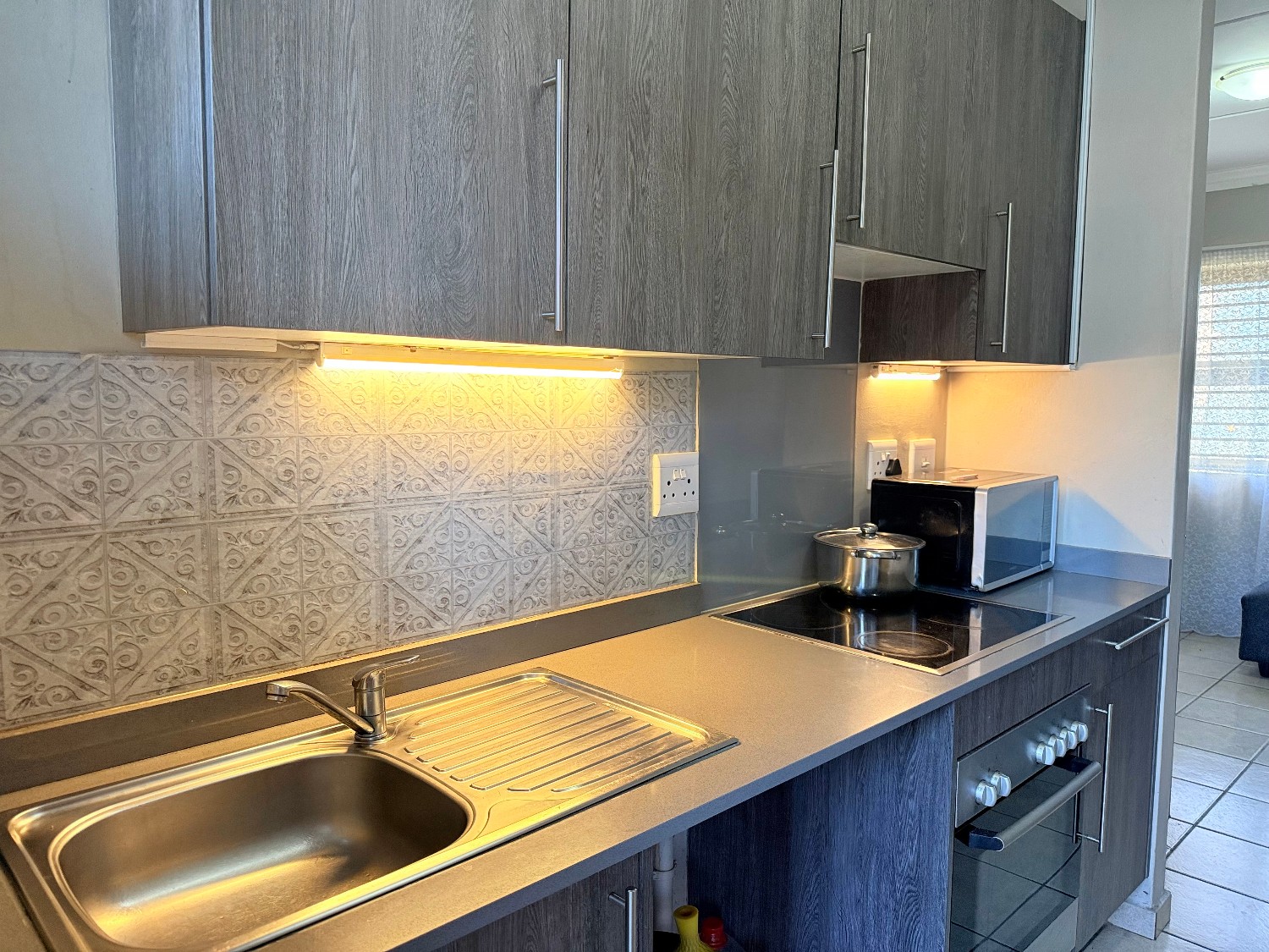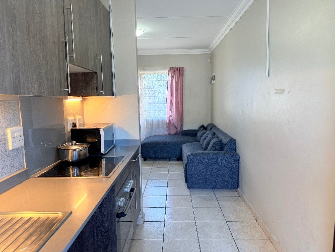The apartment features a well-lit lounge with tiled flooring, creating a warm and inviting space for everyday living. The modern kitchen is fitted with built-in cupboards, quartz countertops, an under-counter oven and hob, a plumbing point, and space for a fridge.