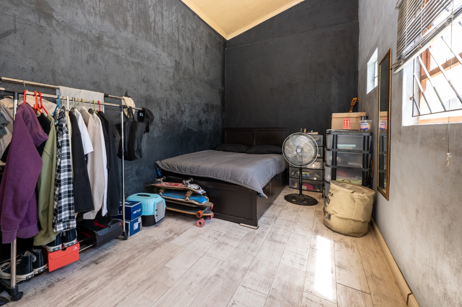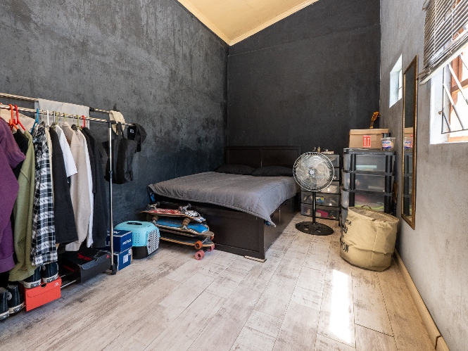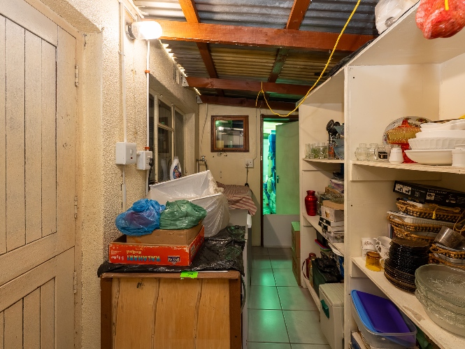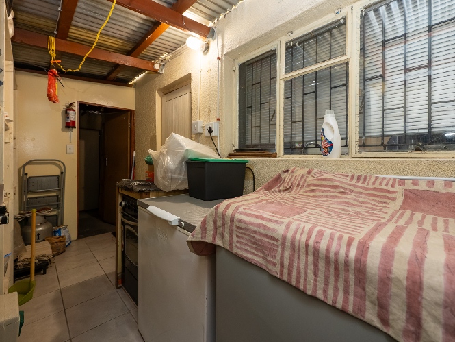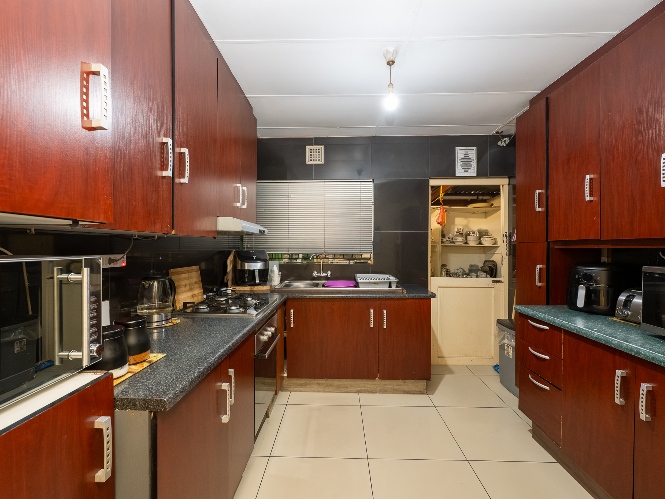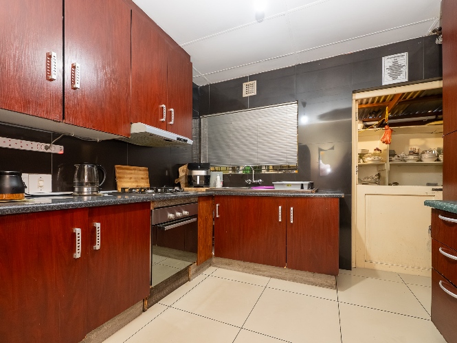 The open-plan lounge and dining room boasts tiled flooring and a welcoming flow, ideal for both relaxation and family gatherings. The kitchen features elegant dark wood cupboards, a fitted oven with a gas stove top, and a practical layout that opens to a convenient storage and laundry area.