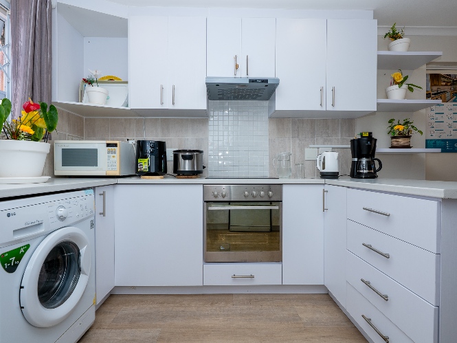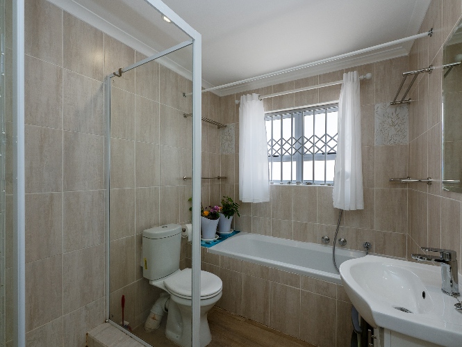 A full, modern bathroom includes four fixtures—a shower, basin, toilet, and bath—with tiles matching the kitchen for a cohesive look. Spare tiles are also included. Additional features include SABS-approved Eco-Insulation in the roof and fibre connectivity.