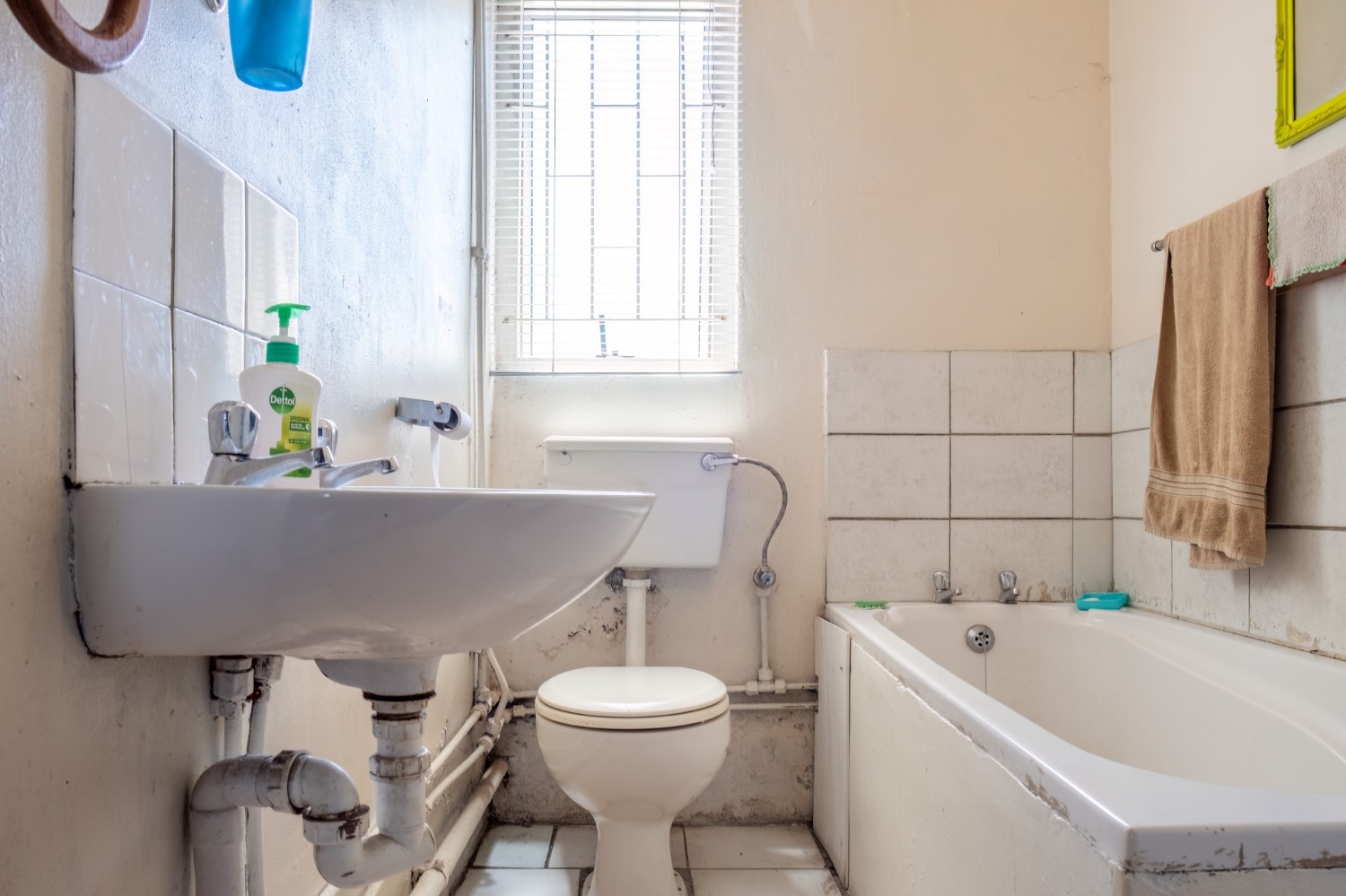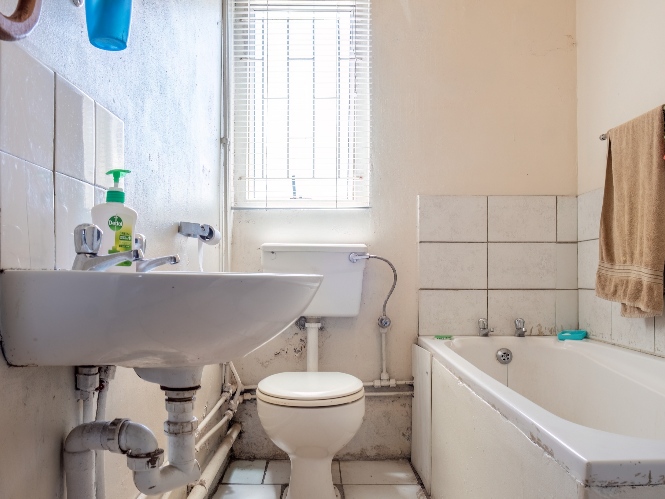 Upstairs are two well-sized bedrooms, both offering ample natural sunlight. Downstairs, the bathroom is neatly tiled and includes a bathtub, basin, and toilet.