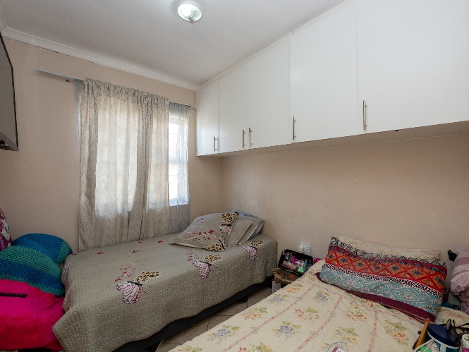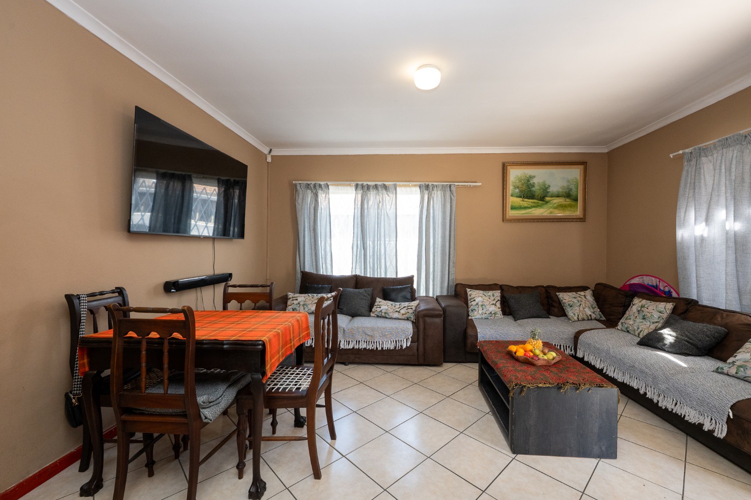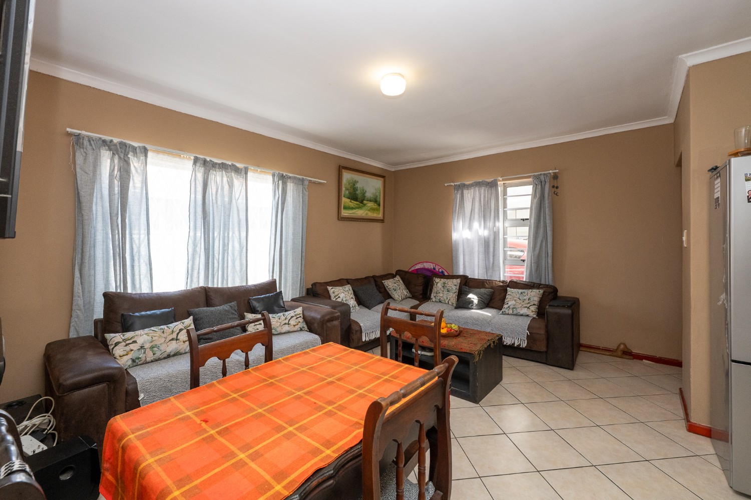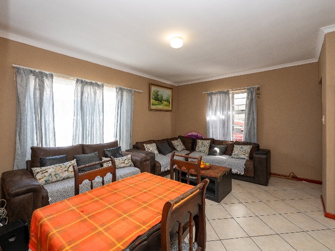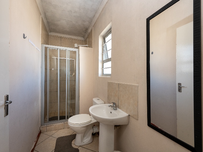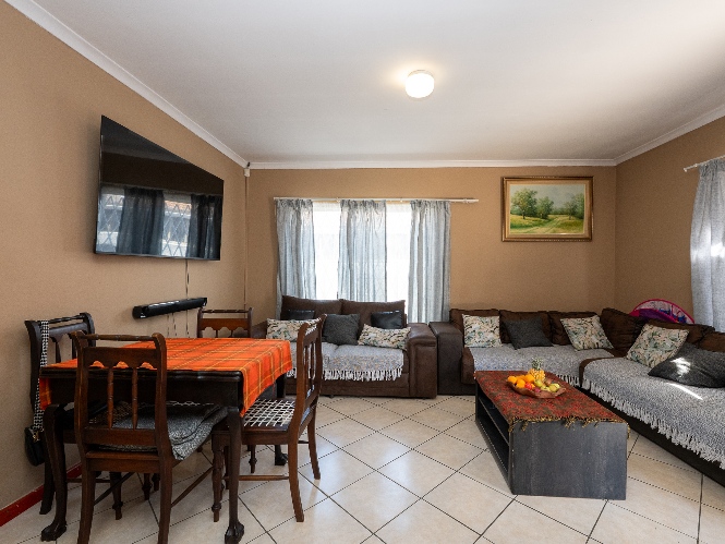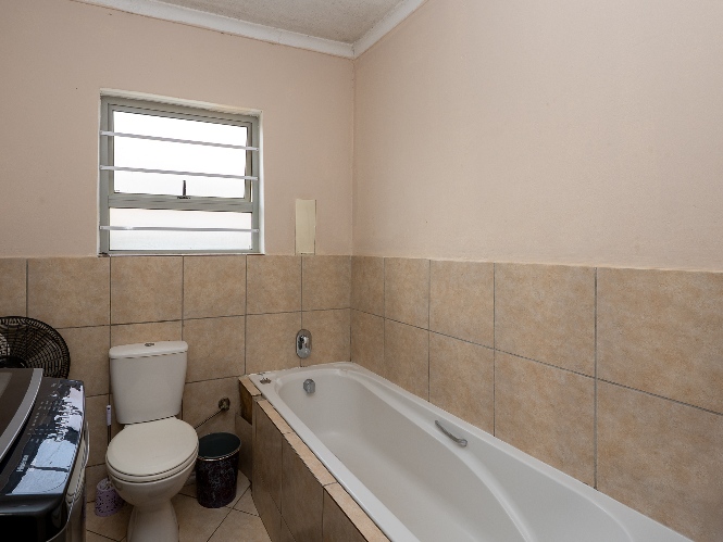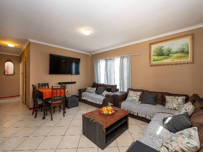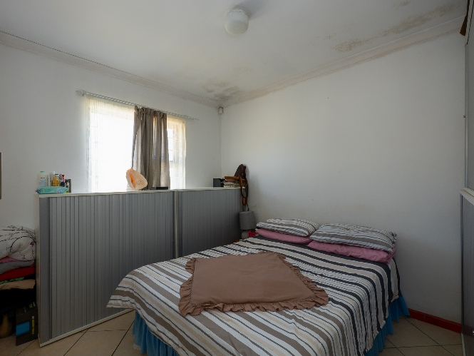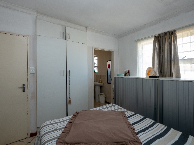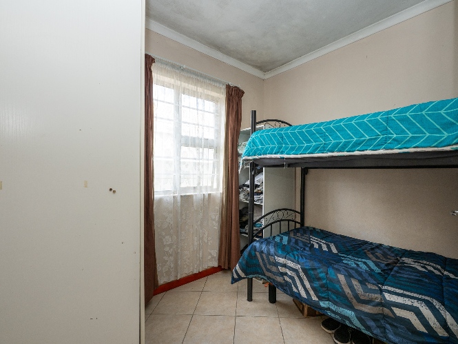 The home features 3 tiled bedrooms (2 without built-in cupboards) and 2 bathrooms. The main bathroom includes a bath and a water point, while the main en-suite is fitted with a shower. Security is well catered for with burglar bars throughout.