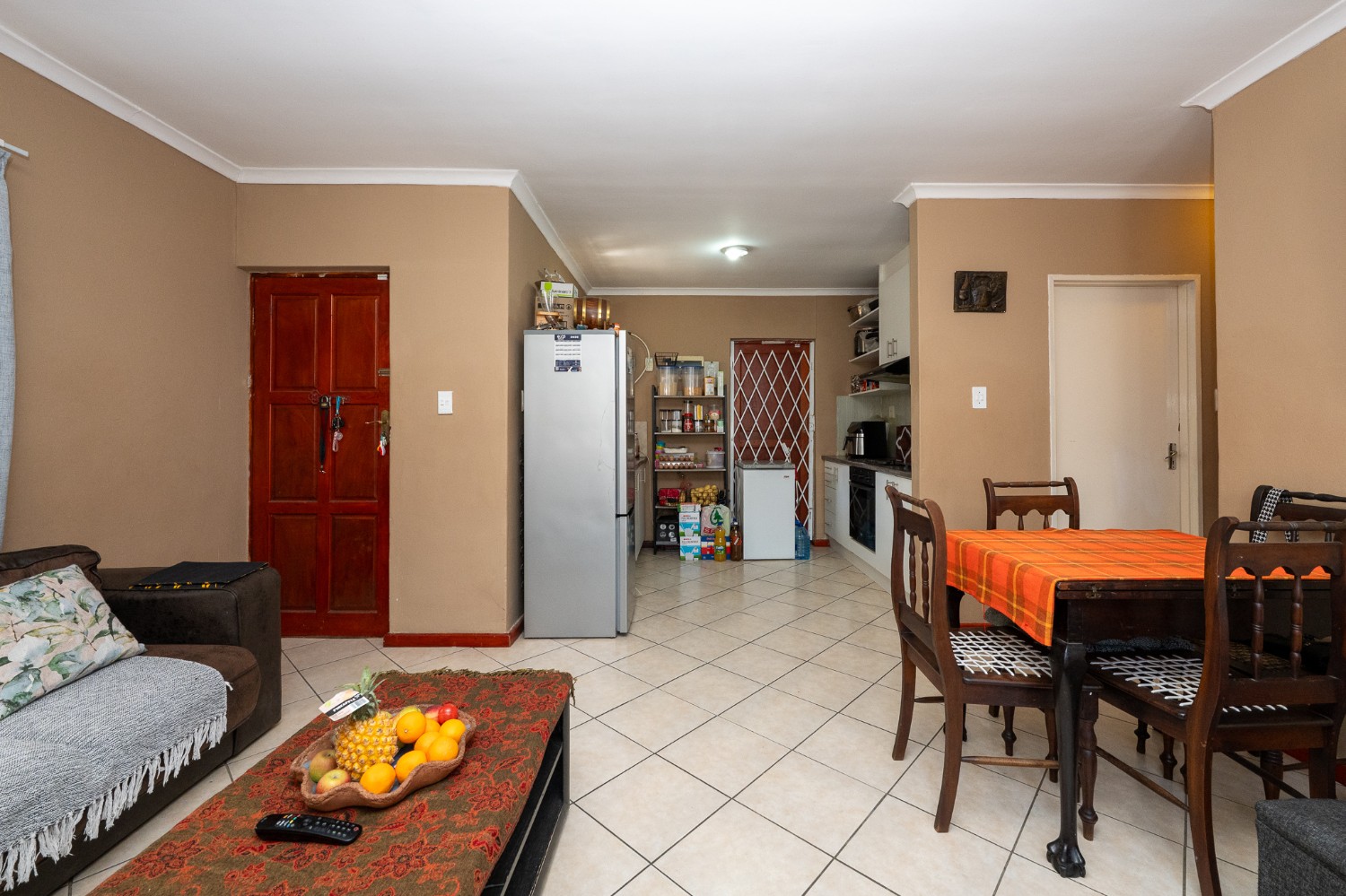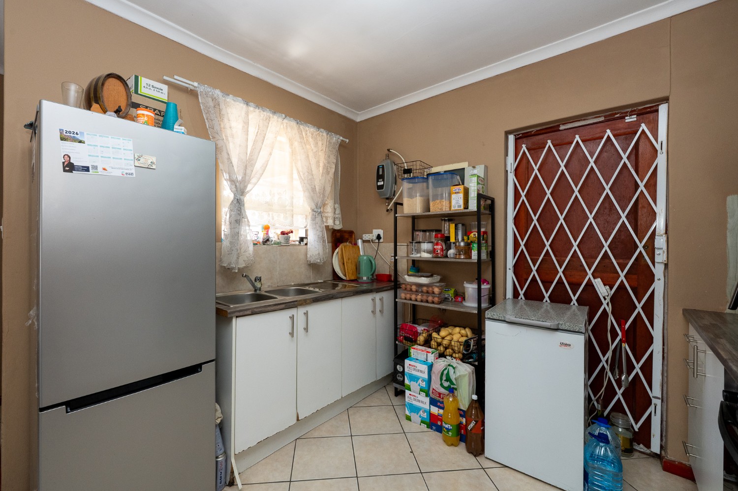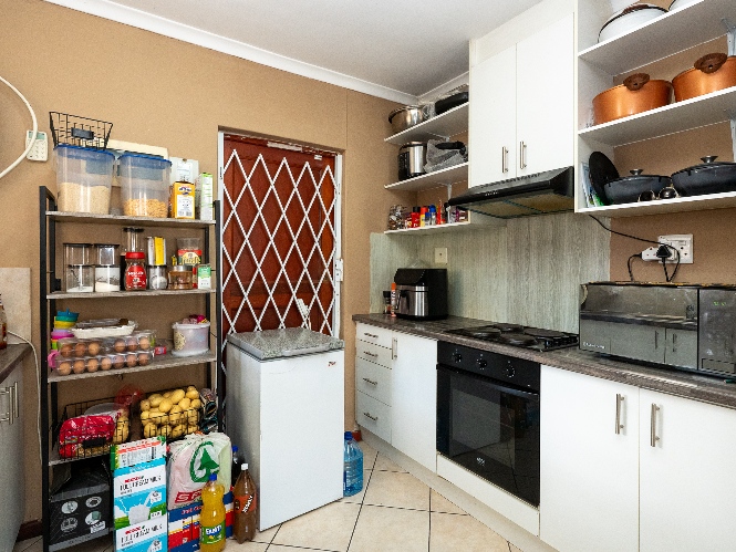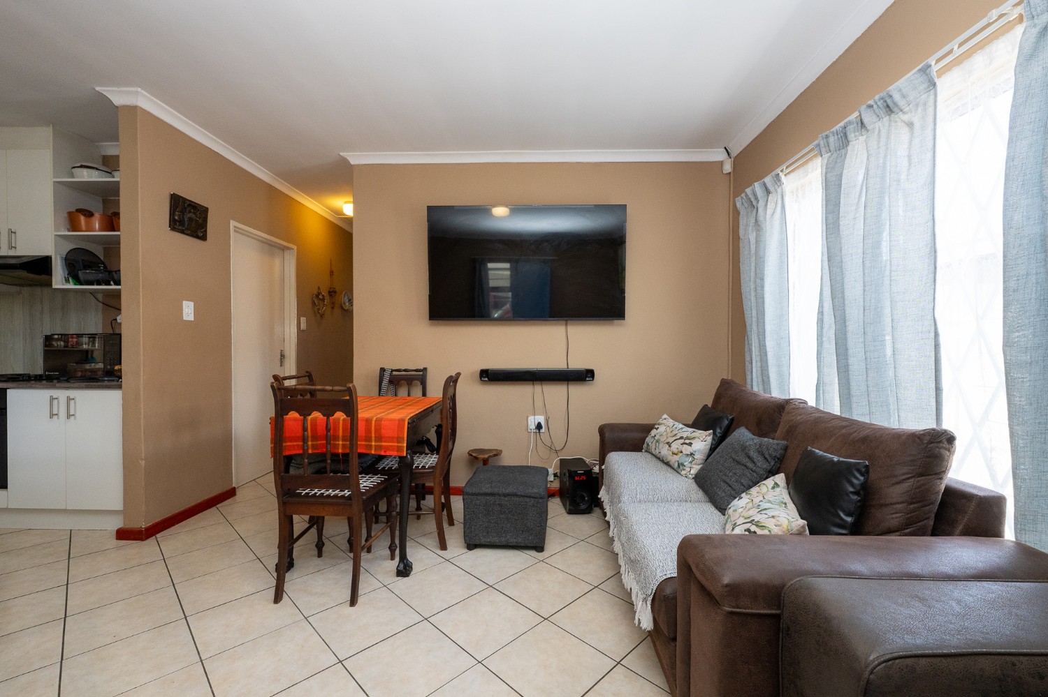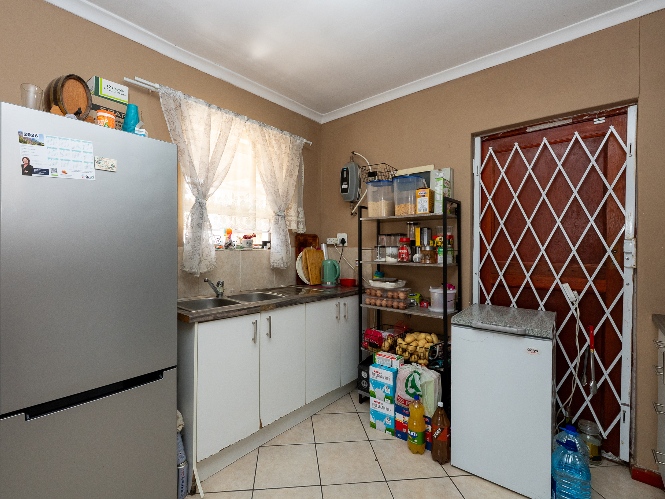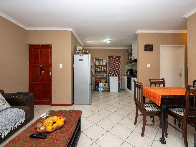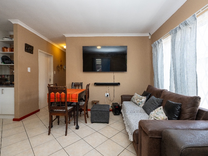 The open-plan lounge flows seamlessly through a security sliding door to the garden, creating a lovely indoor-outdoor feel. The kitchen offers a double sink and direct access to the courtyard for added practicality.