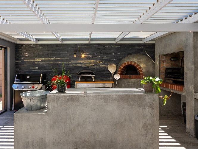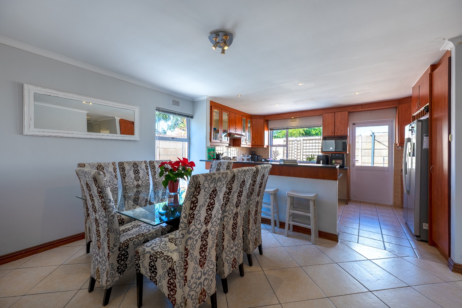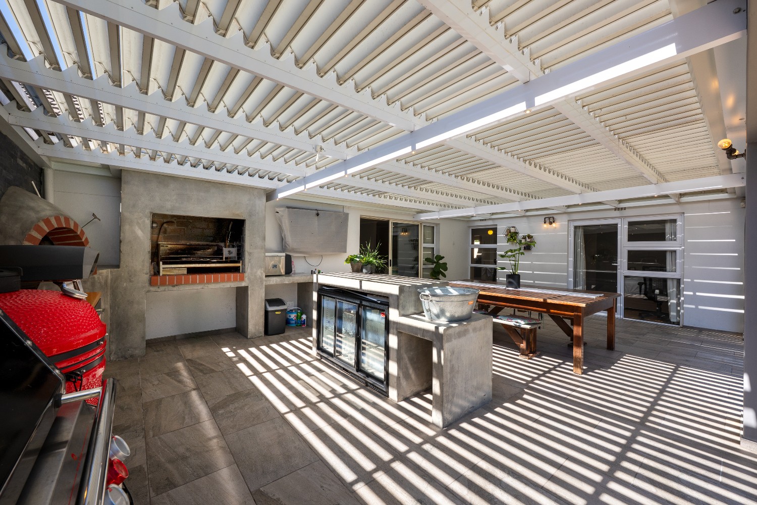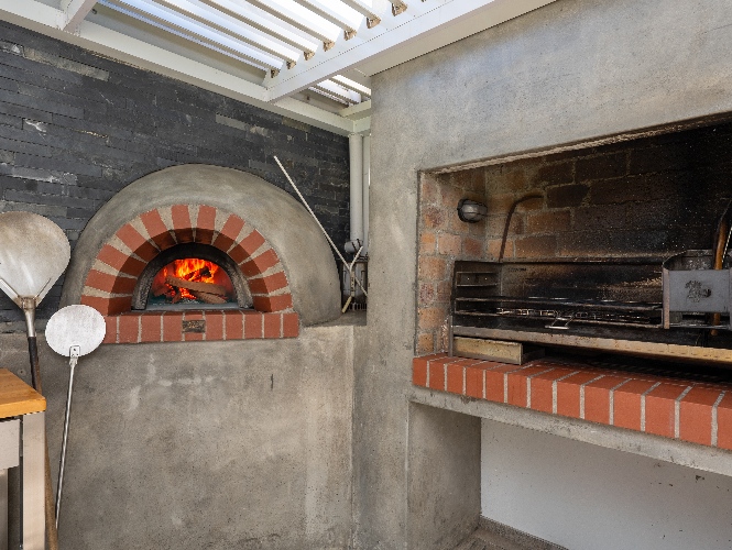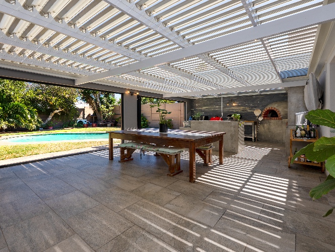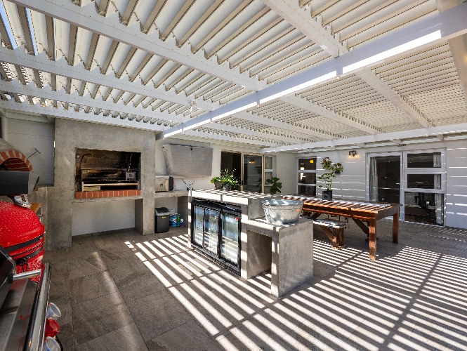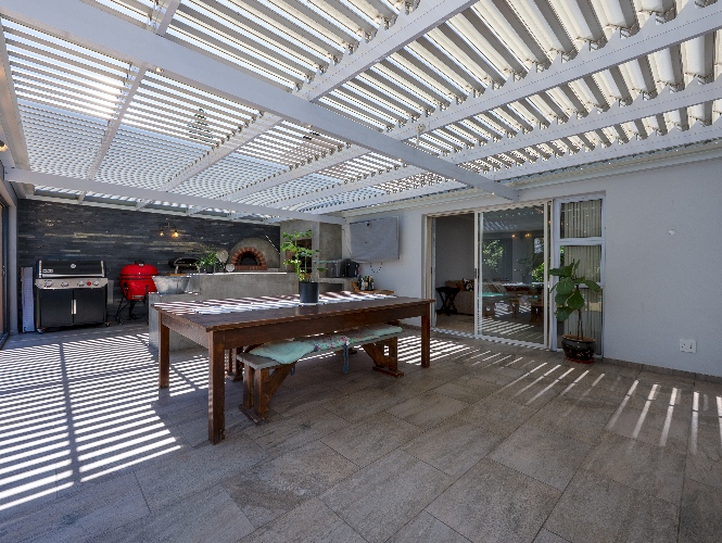 At the heart of the home is a massive 49m² enclosed braai and entertainment room, making this property a true entertainer’s delight. This impressive space boasts adjustable louvres, stacker doors, a built-in braai, pizza oven, and a built-in bar with bar fridge, seamlessly opening onto a private, expansive garden and sparkling swimming pool—perfect for hosting all year round.