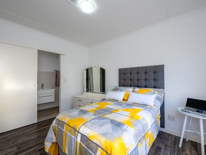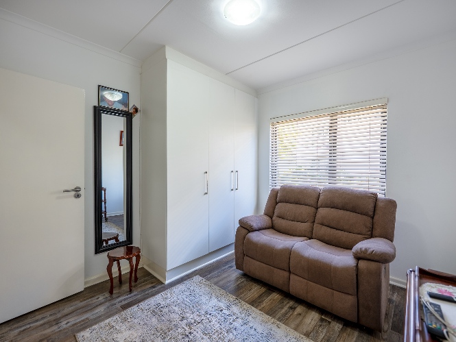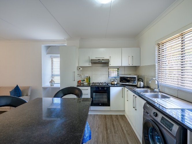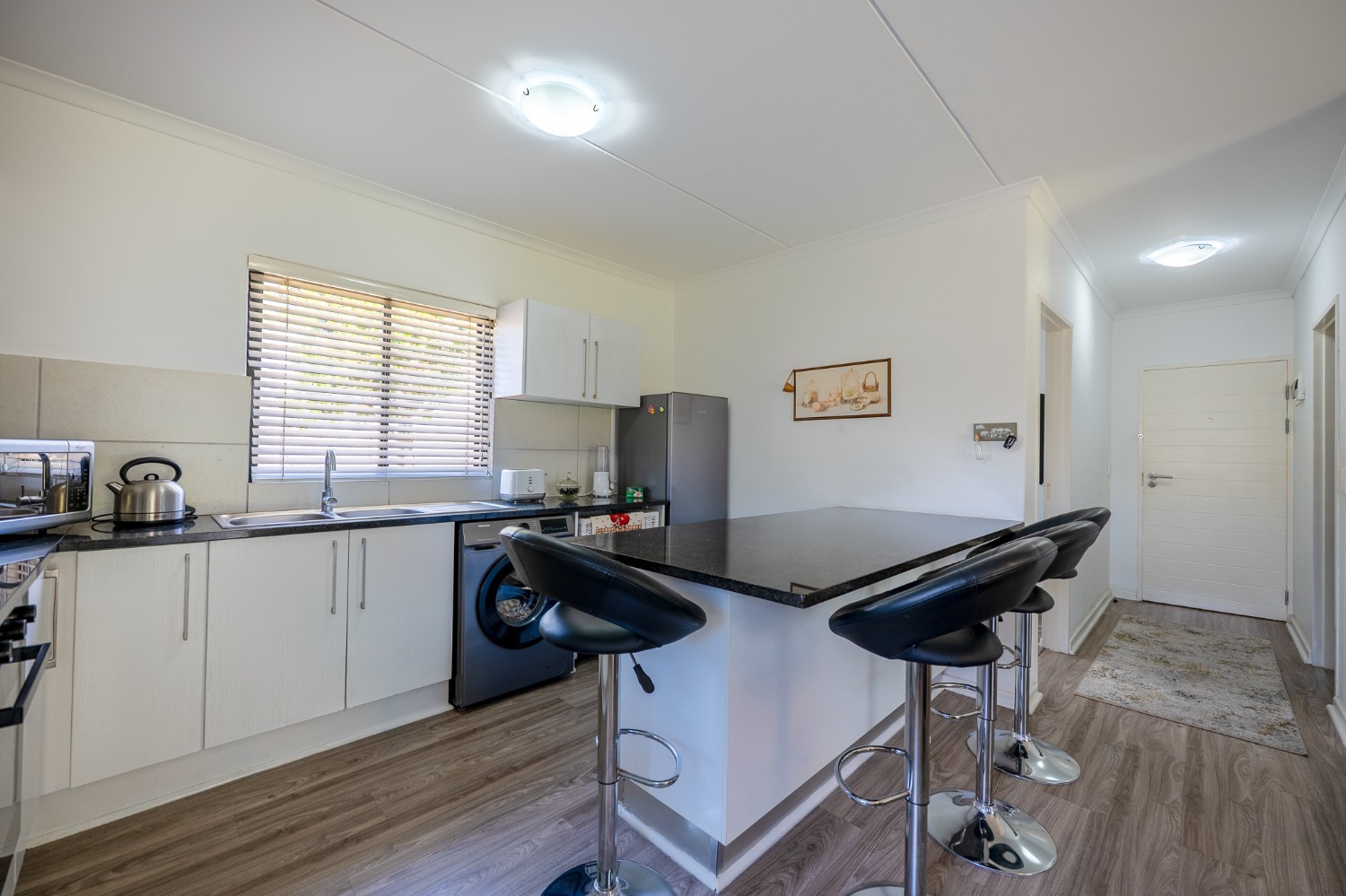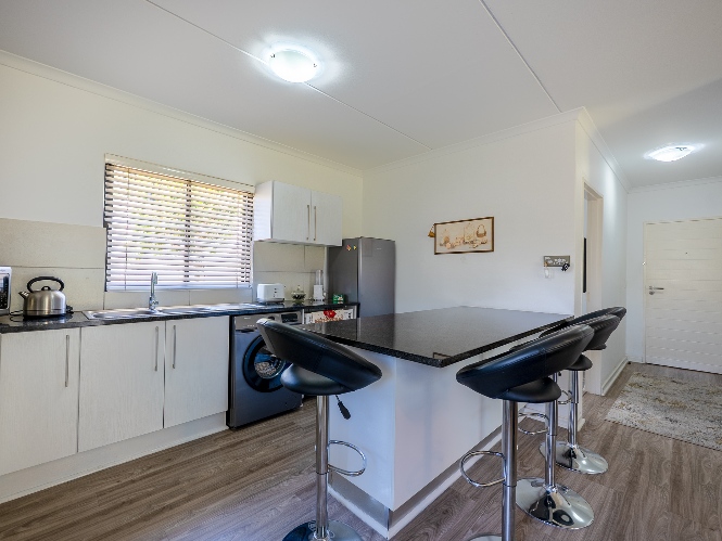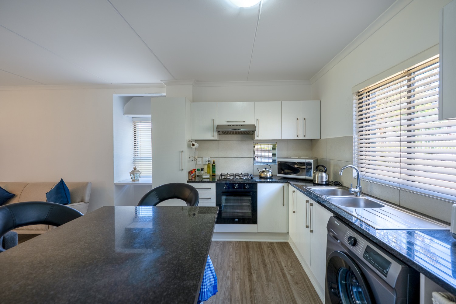 The home features an open-plan lounge and kitchen, creating a seamless flow throughout the living area. The bright lounge is fitted with beautiful flooring and opens through a door onto a fully enclosed patio, an ideal space to relax while enjoying views of the communal garden. The contemporary kitchen offers light wood cupboards, granite countertops, an under-counter oven and gas stove top, one plumbing point, and space for a fridge.