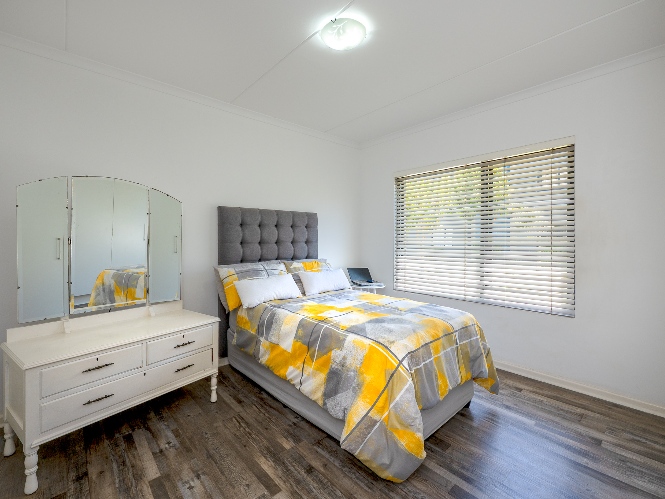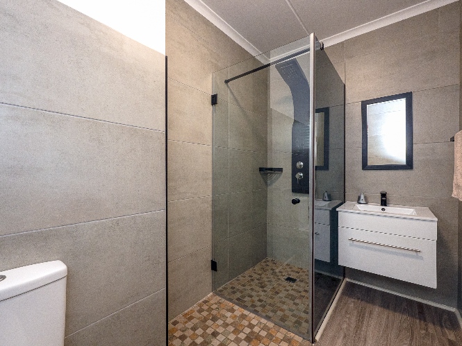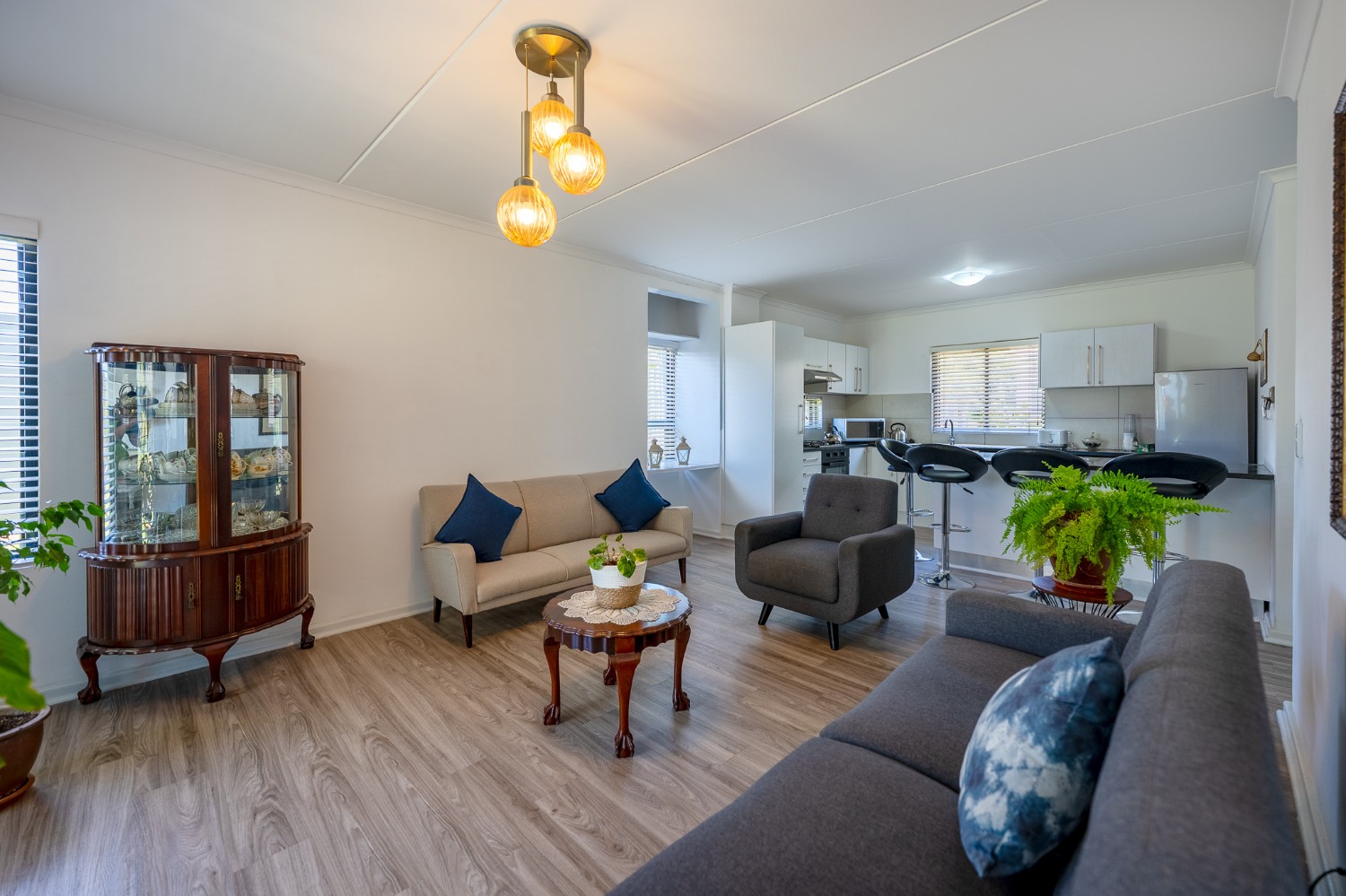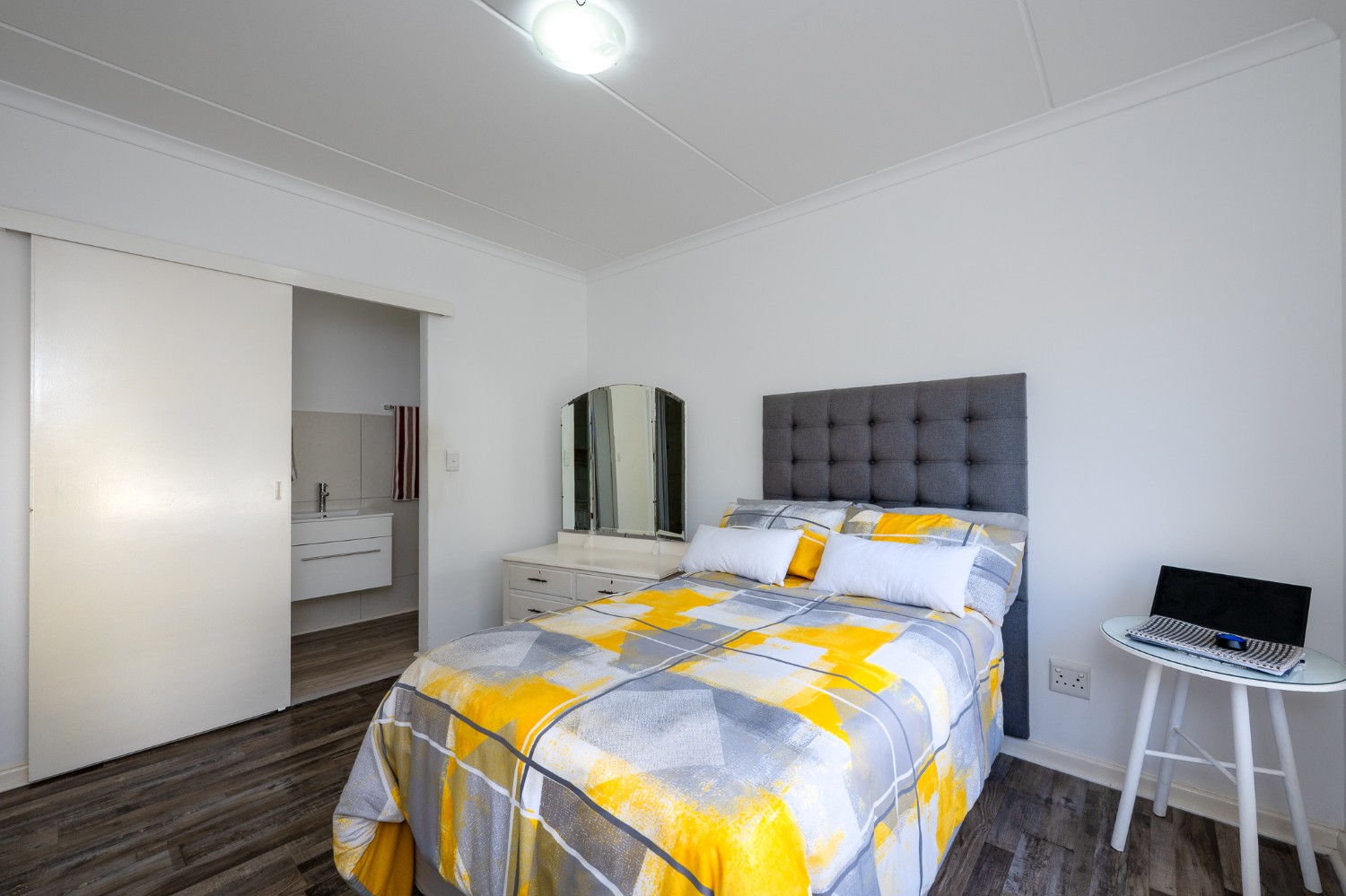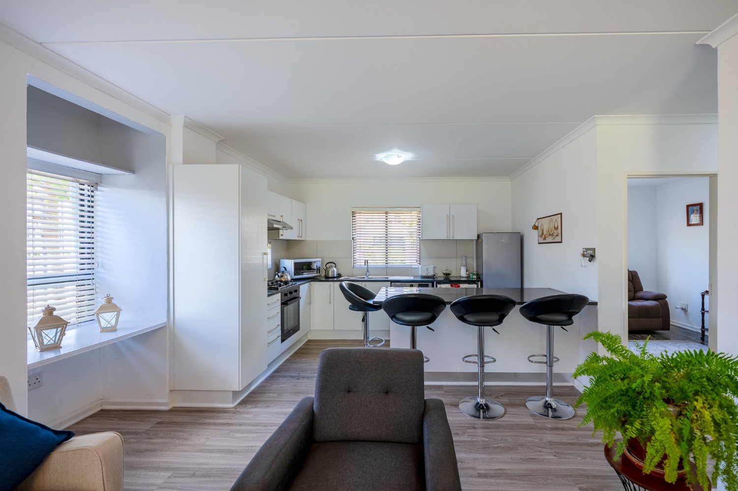 The home features an open-plan lounge and kitchen, creating a seamless flow throughout the living area. The bright lounge is fitted with beautiful flooring and opens through a door onto a fully enclosed patio, an ideal space to relax while enjoying views of the communal garden. The contemporary kitchen offers light wood cupboards, granite countertops, an under-counter oven and gas stove top, one plumbing point, and space for a fridge.