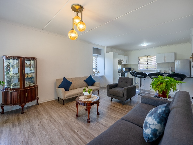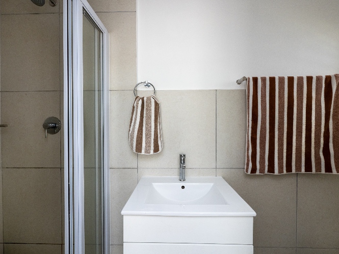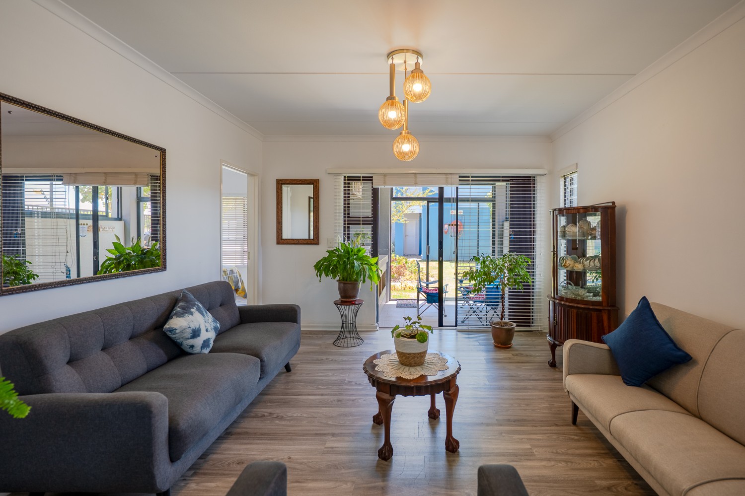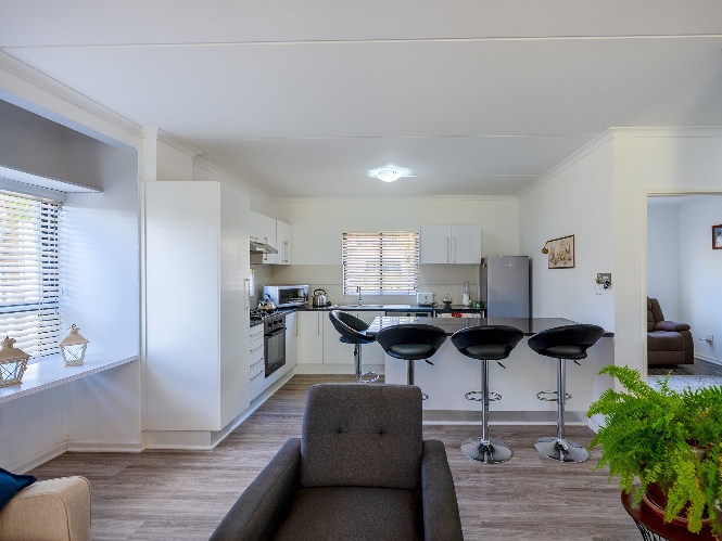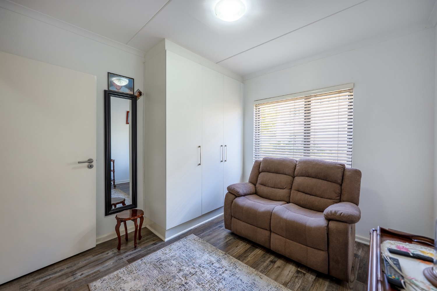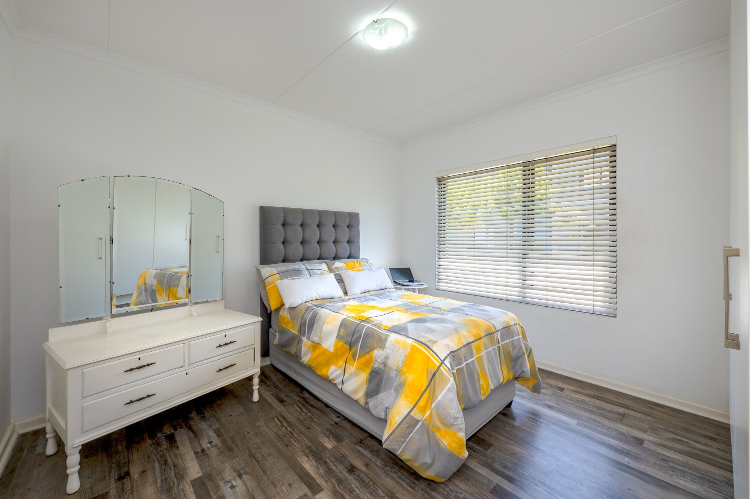 The home features an open-plan lounge and kitchen, creating a seamless flow throughout the living area. The bright lounge is fitted with beautiful flooring and opens through a door onto a fully enclosed patio, an ideal space to relax while enjoying views of the communal garden. The contemporary kitchen offers light wood cupboards, granite countertops, an under-counter oven and gas stove top, one plumbing point, and space for a fridge.