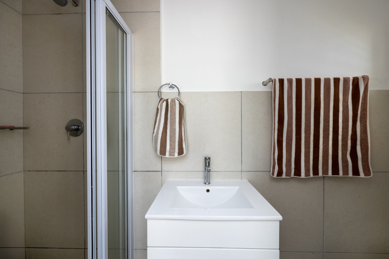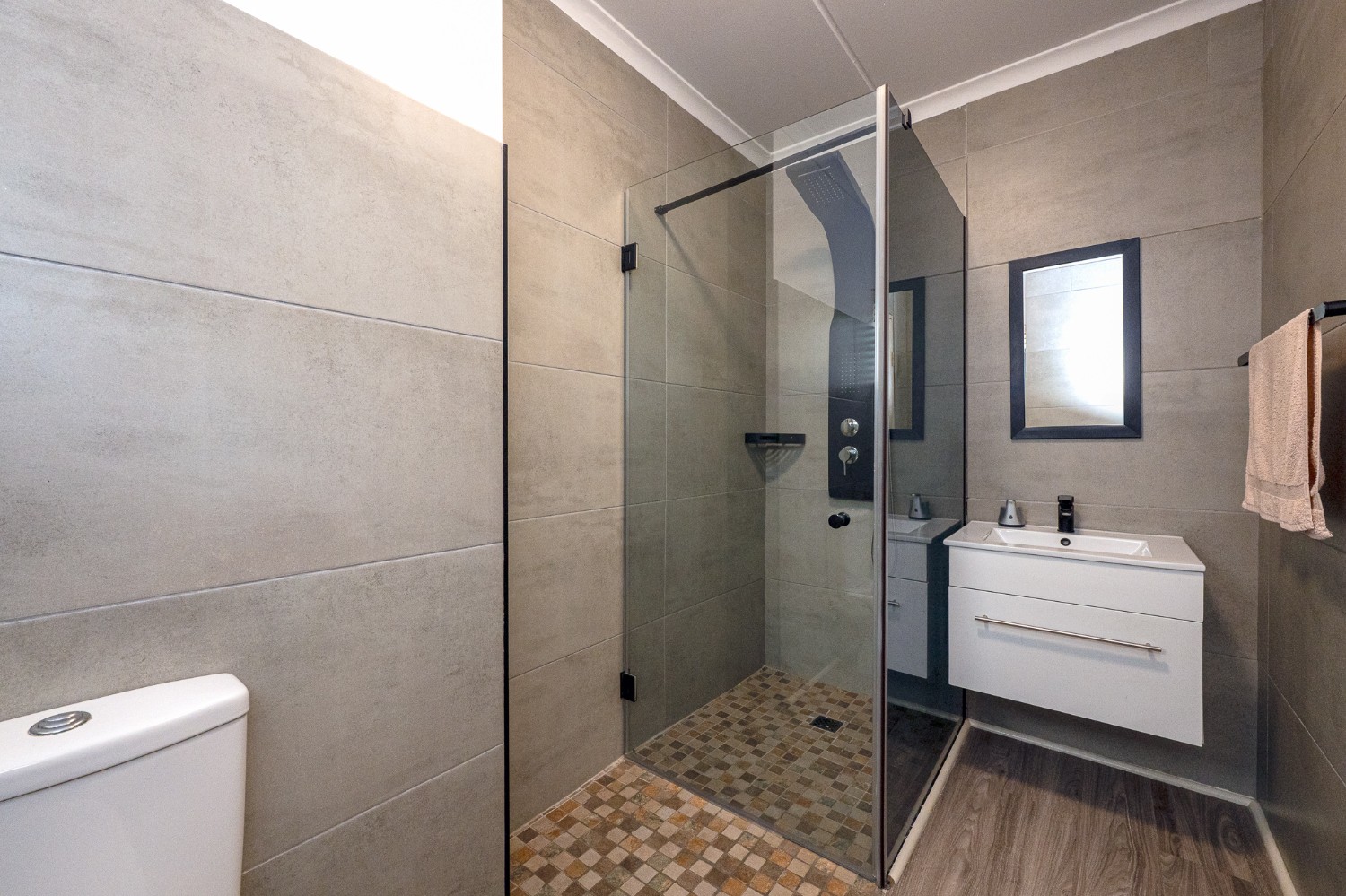 There are two well-sized bedrooms, both fitted with built-in cupboards. The main bedroom includes an en-suite bathroom for added privacy and convenience. A modern family bathroom, equipped with a shower, basin, and toilet, serves the rest of the apartment.